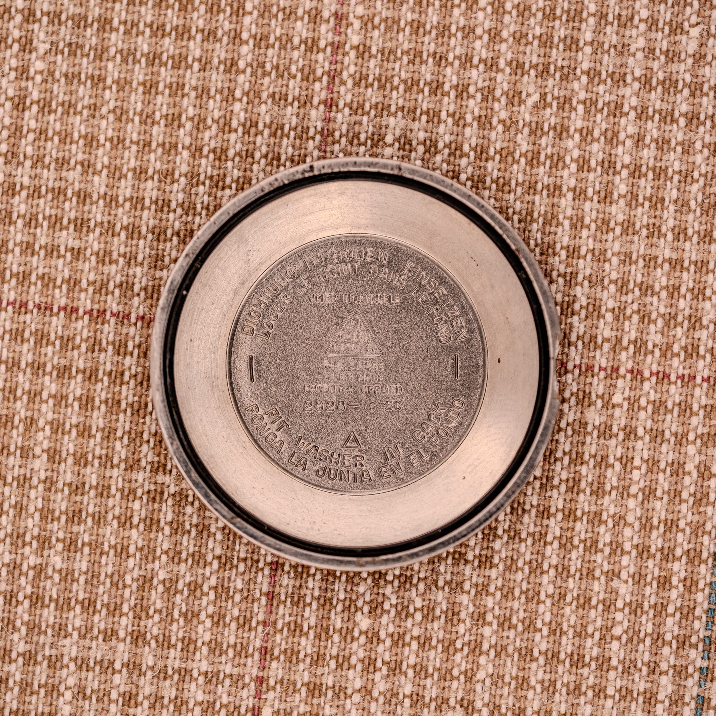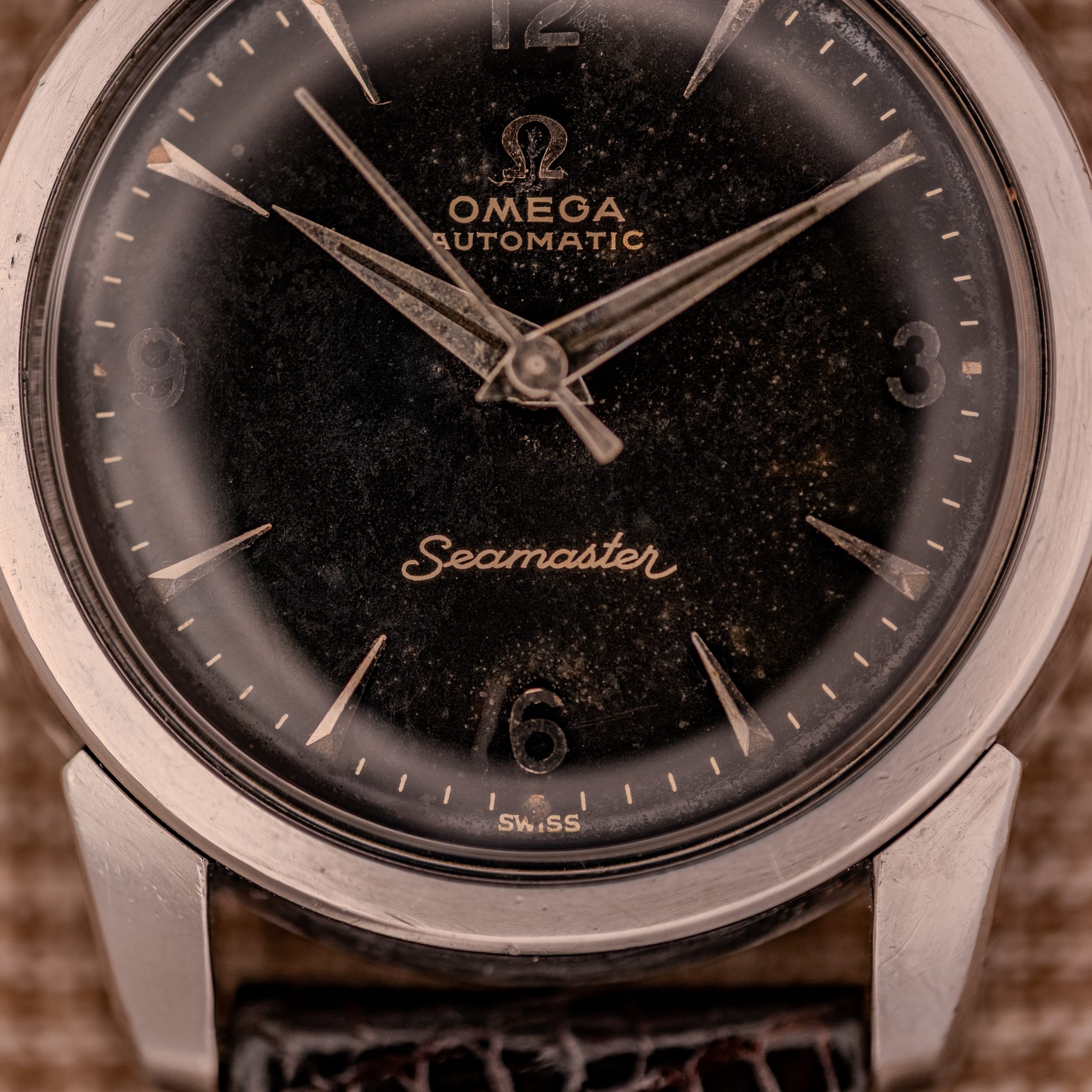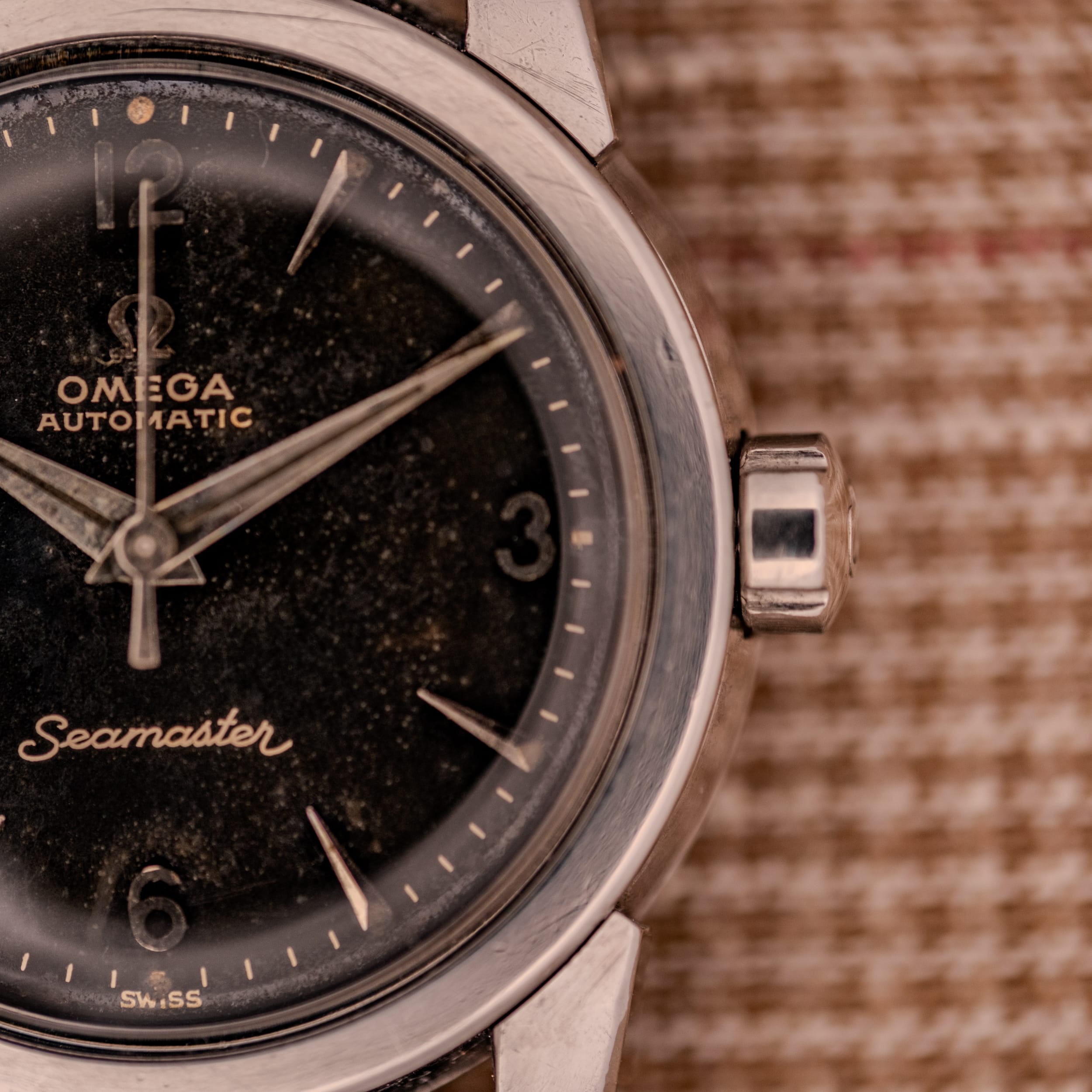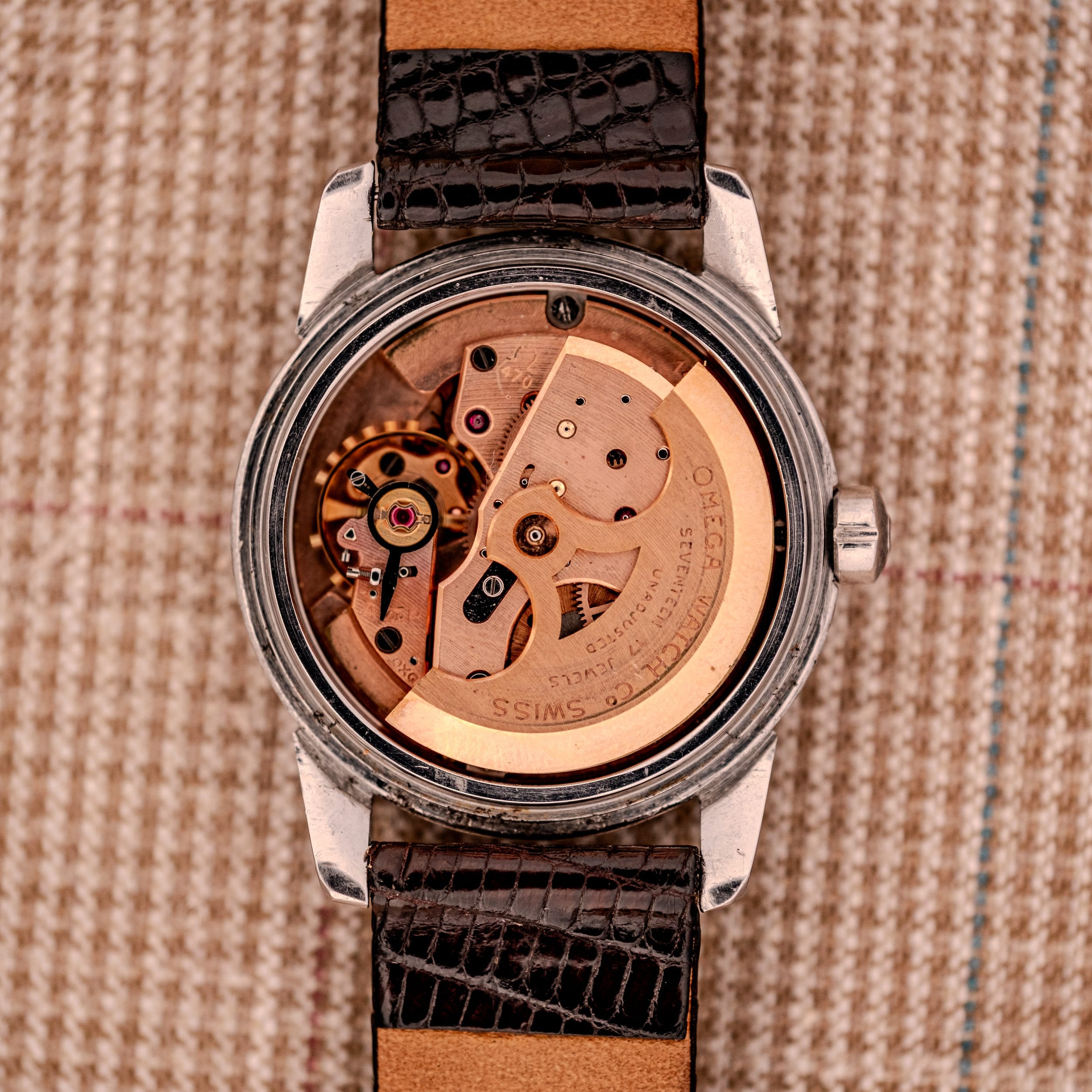 The stainless steel case wears its years honestly. The wide bezel and lugs show the kind of surface marks you’d expect from seven decades of genuine use, light scratches and micro-abrasions that tell a story of a life lived rather than a watch stored. Crucially, the case retains its original Omega-signed crown, a detail that matters enormously to the discerning collector. The screwback caseback carries its original Seamaster cartouche and Waterproof designation, unengraved and clean. The overall case architecture remains unpolished with definition still present in the lug chamfers, exactly the condition that serious collectors look for.