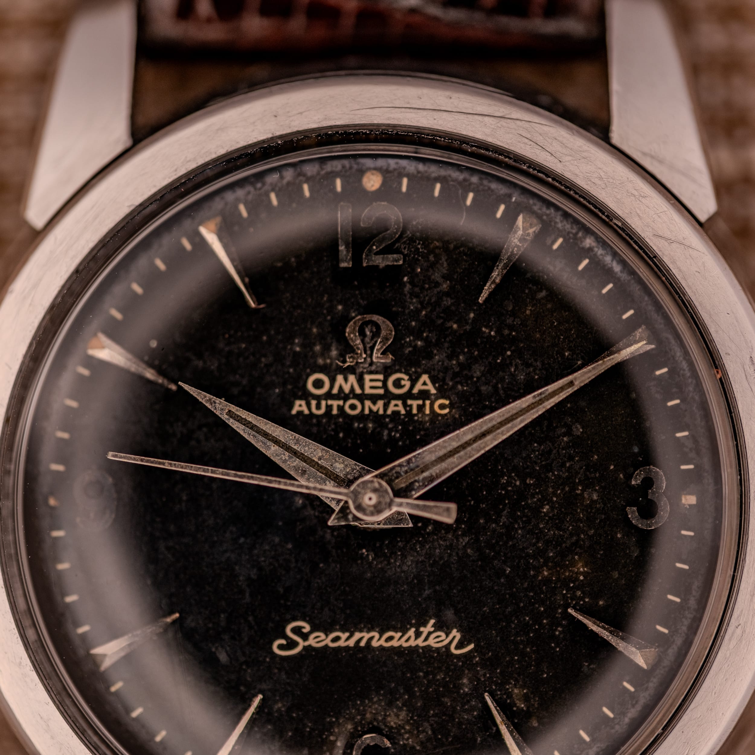 The dial has aged into something deeply atmospheric. Across the matte black surface, decades of gentle oxidation have produced a fine golden speckle, a “starry night” effect that transforms what was already a bold dial choice into something almost cosmic. It is the kind of patina that cannot be manufactured, only earned. The warm gilt printing of “OMEGA AUTOMATIC” and the flowing Seamaster script at six remain fully legible, their copper-rose tone providing a perfect counterpoint to the dark background. The applied baton indices carry their own soft patina, and the sword handset complements the period aesthetic with understated precision. The chapter ring’s minute track runs cleanly around the periphery, adding depth and structure to the composition.