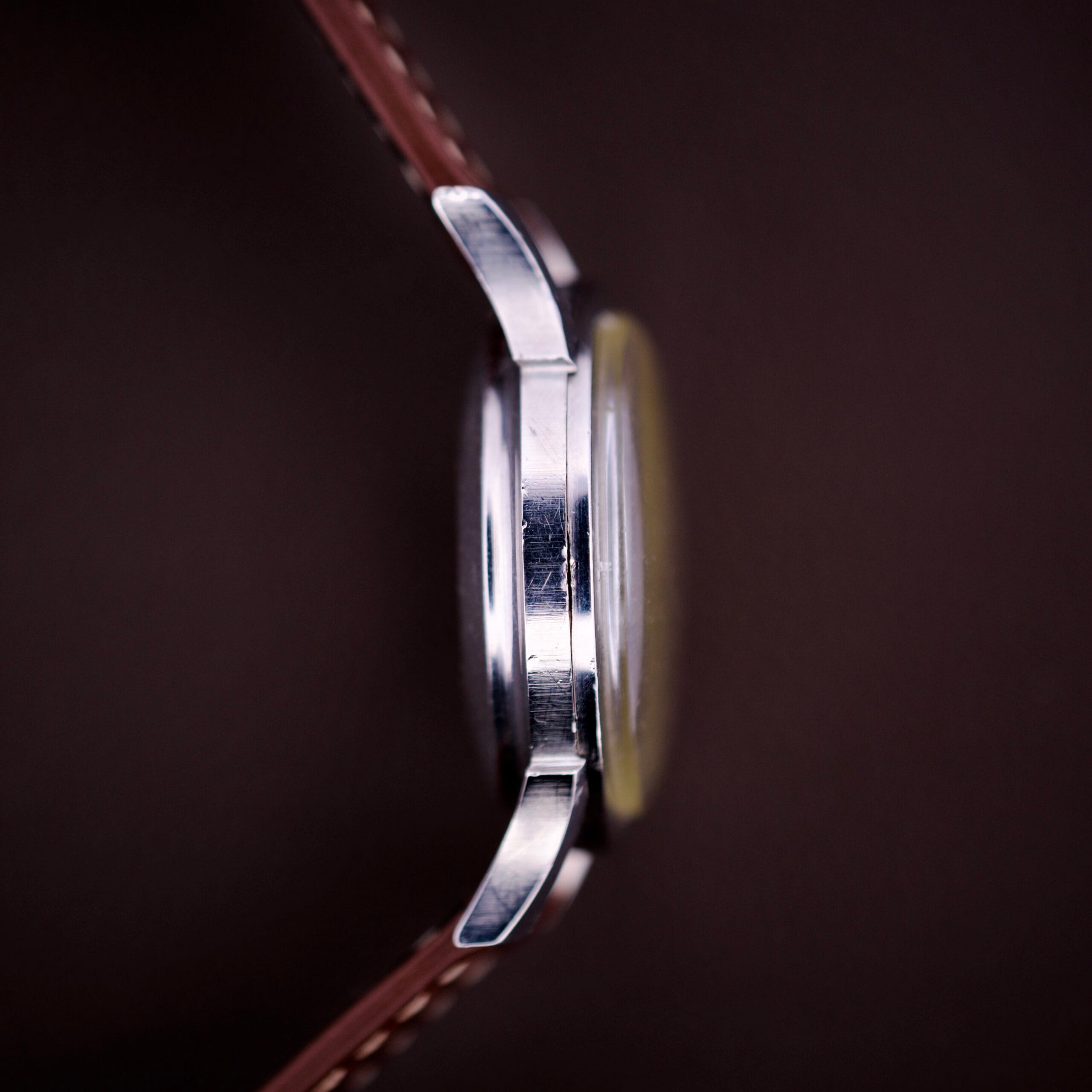 The true character of this watch comes from its honest aging. The dial has developed a heavy, uniform “stardust” patina, a speckled pattern of oxidation that gives the face a warm, textured appearance which looks almost like parchment. We find this kind of aging to be incredibly appealing, as it softens the starkness of a white dial and proves the watch has lived a full life. The case retains its sharp lines, particularly on those complex lugs, and the acrylic crystal adds a vintage distortion that complements the overall aesthetic.