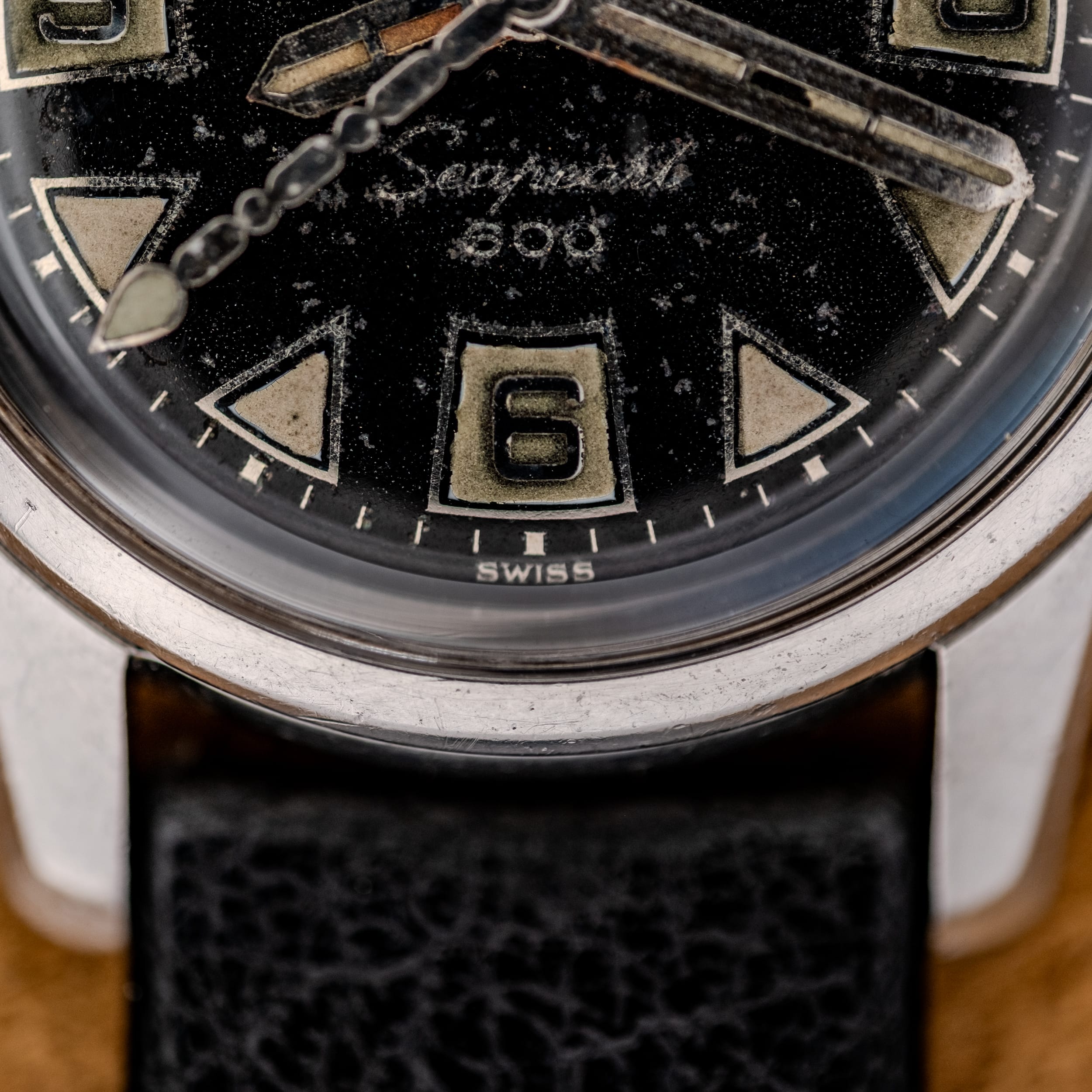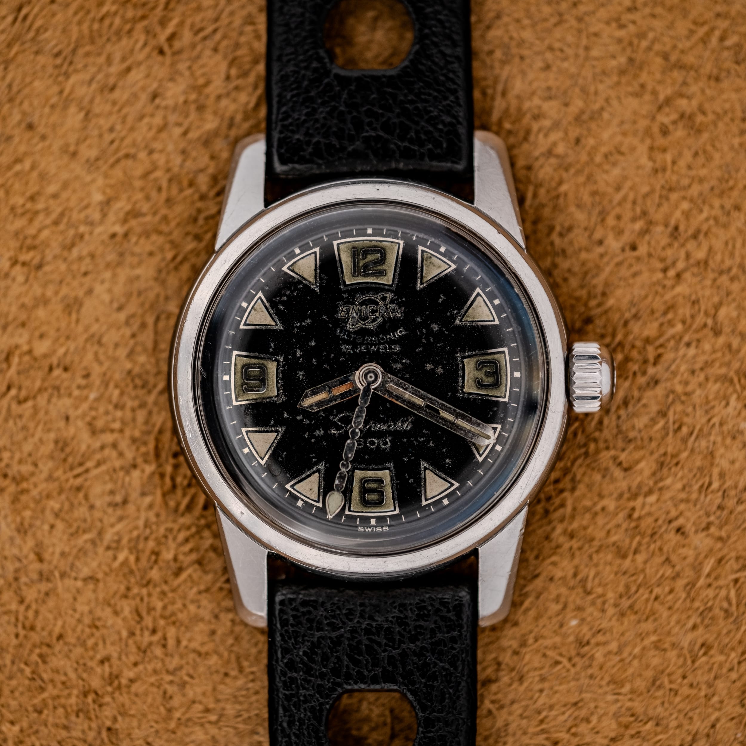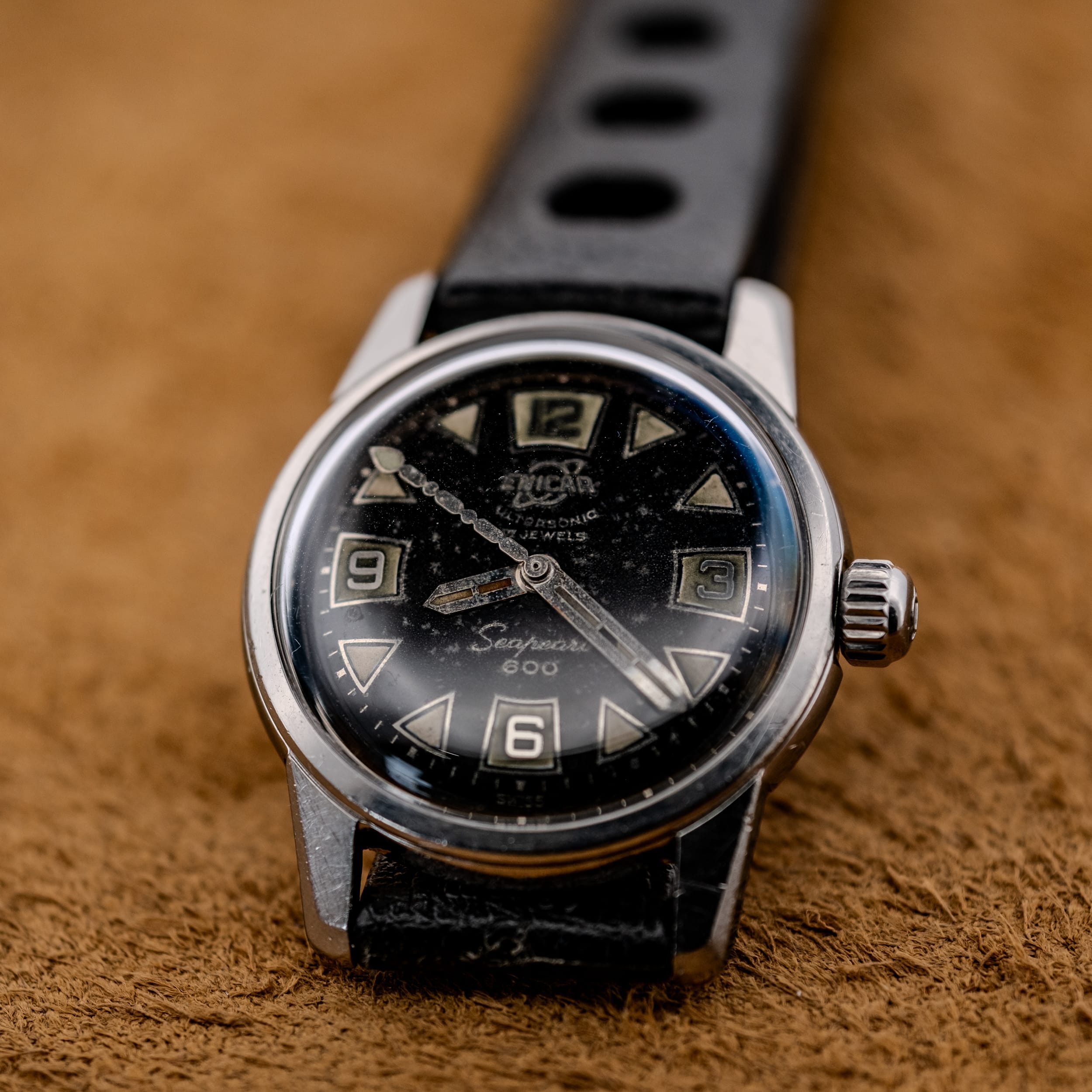 Presented on a black Tropic rubber strap, arguably the most period-correct pairing imaginable for a 1960s skin diver, this Seapearl 600 is a watch that commands attention without asking for it. For the collector who appreciates legitimate dive watch history, a movement tested against the most iconic names in the genre, and a dial that has aged into something genuinely singular, this is a rare opportunity. Enicar Seapearl 600s are increasingly difficult to find in honest, original condition, and this example’s combination of correct components and extraordinary patina makes it a compelling piece for any serious vintage dive watch collection.