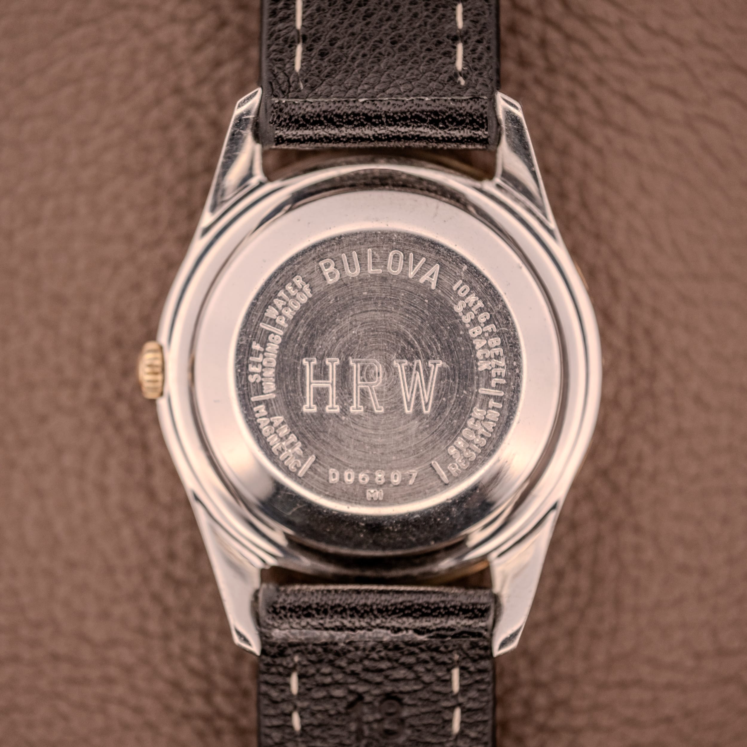 The 10K gold filled fluted bezel is arguably the most distinctive design element here. The coin edge pattern catches light from every angle and gives the watch a richness that belies its accessible positioning. It sits atop the stainless steel unishell body, and the contrast between the warm gold bezel and the brushed steel case flanks is striking, particularly visible in the profile shots where the sculpted, angular lugs show off their faceted geometry. The caseback reads “Bulova, Self Winding, Waterproof, Antimagnetic, Shock Resistant” in a circular pattern around the “HRW” monogram of the original owner, with serial D06897 and the M1 date code confirming 1961 production. The crown appears original and correct.