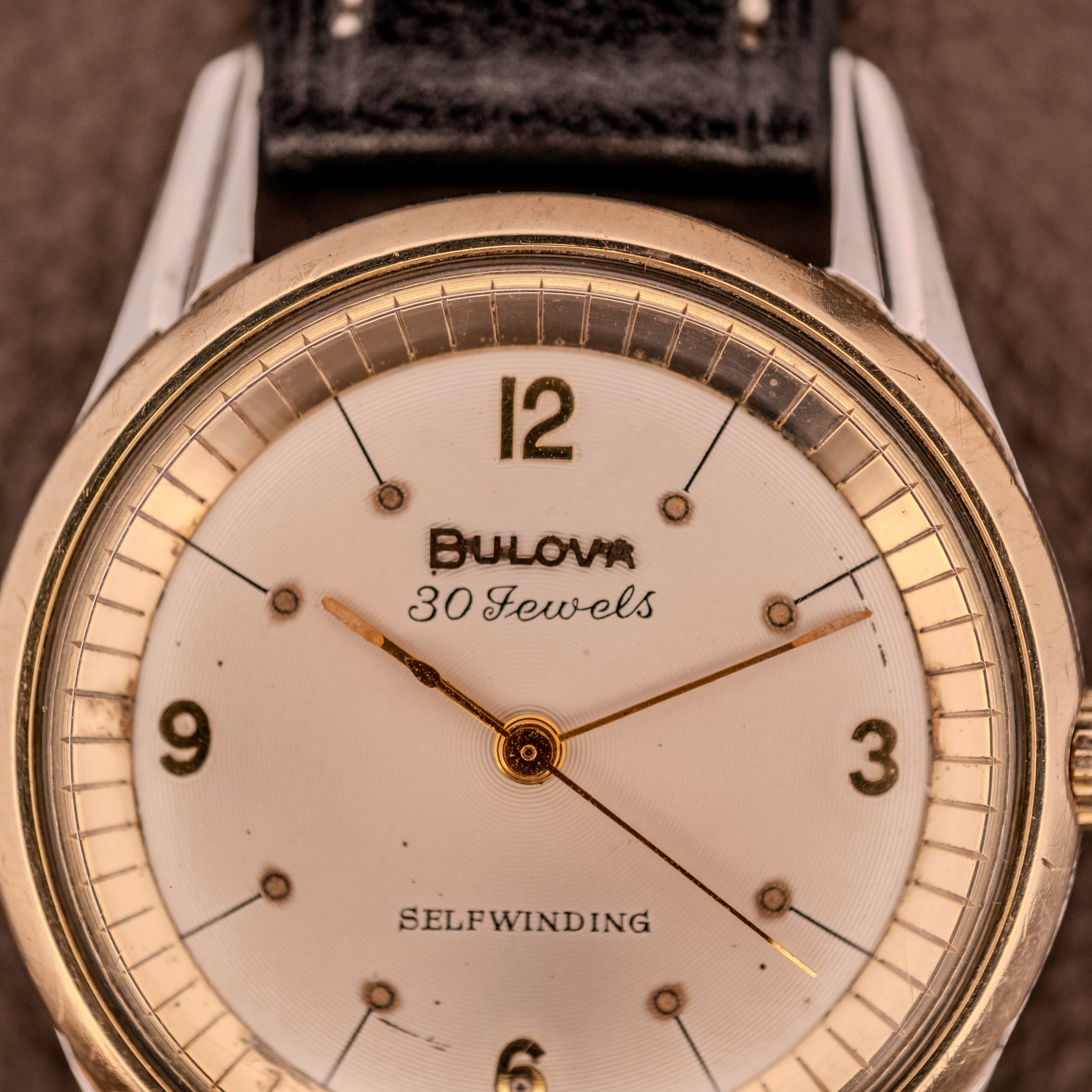 This particular example, dated to 1961 by its M1 date code on the caseback, is a wonderfully preserved specimen. The dial is the star, featuring a subtle concentric ring pattern radiating outward from the center that catches light beautifully, especially visible in the macro shots. Applied Arabic numerals at 12, 3, 6, and 9 in gold sit alongside raised dot markers at the remaining hours, with fine printed indices extending from the outer chapter ring. The “Bulova” and “30 Jewels” text is printed in a warm gold tone with an elegant italic script for the jewel count, and “Selfwinding” appears cleanly at 6 o’clock. The gold lance hands are original and show gentle aging consistent with the piece’s six decades.
