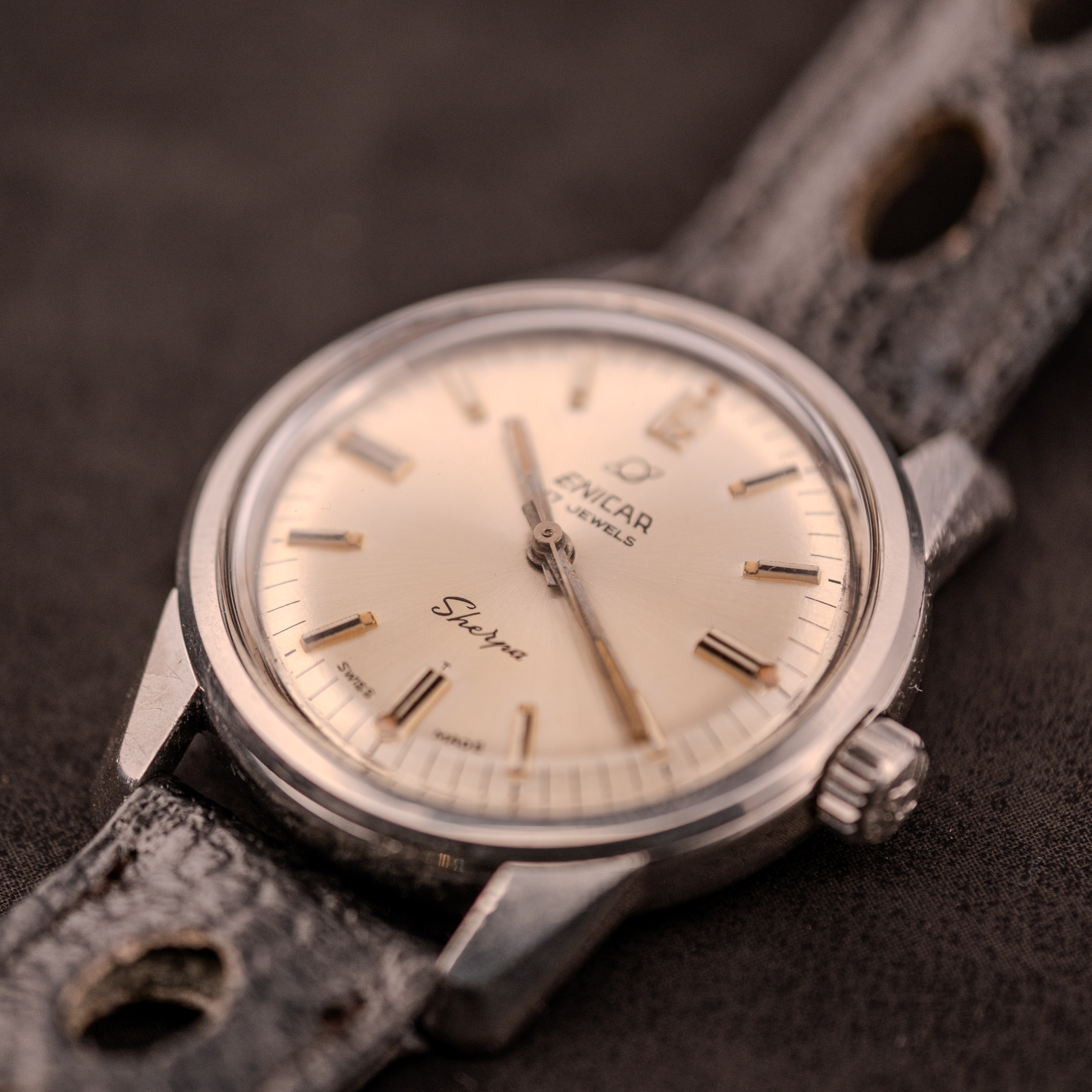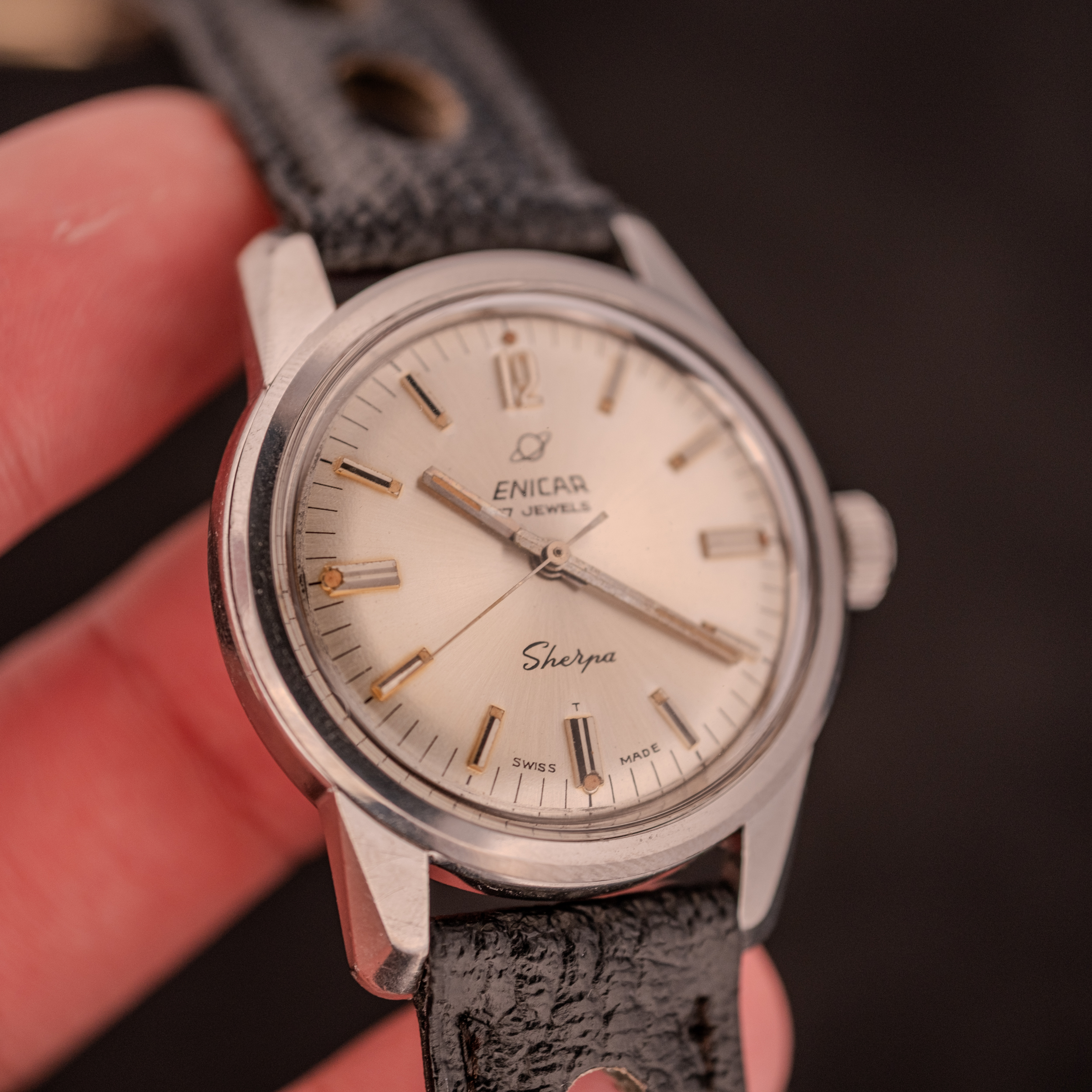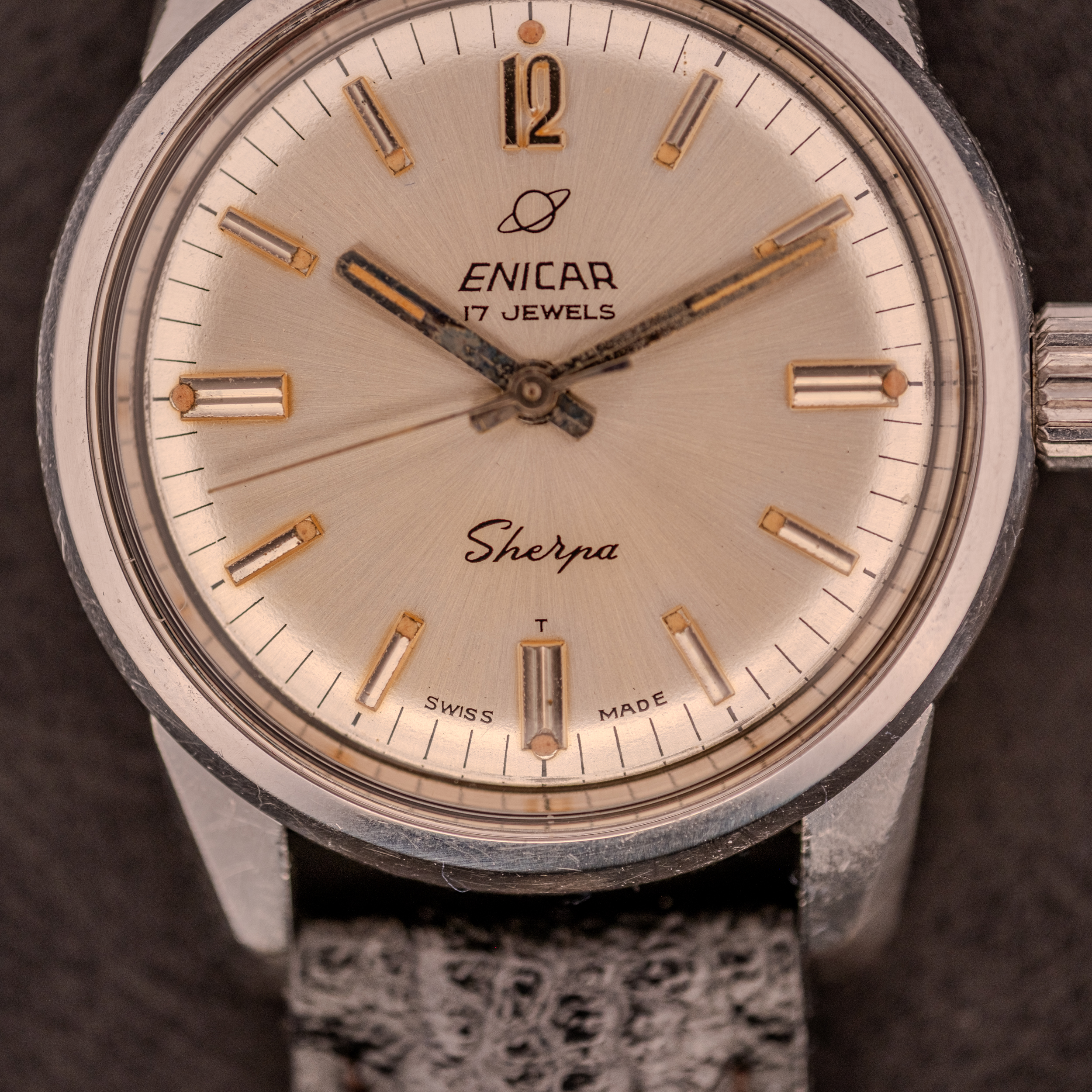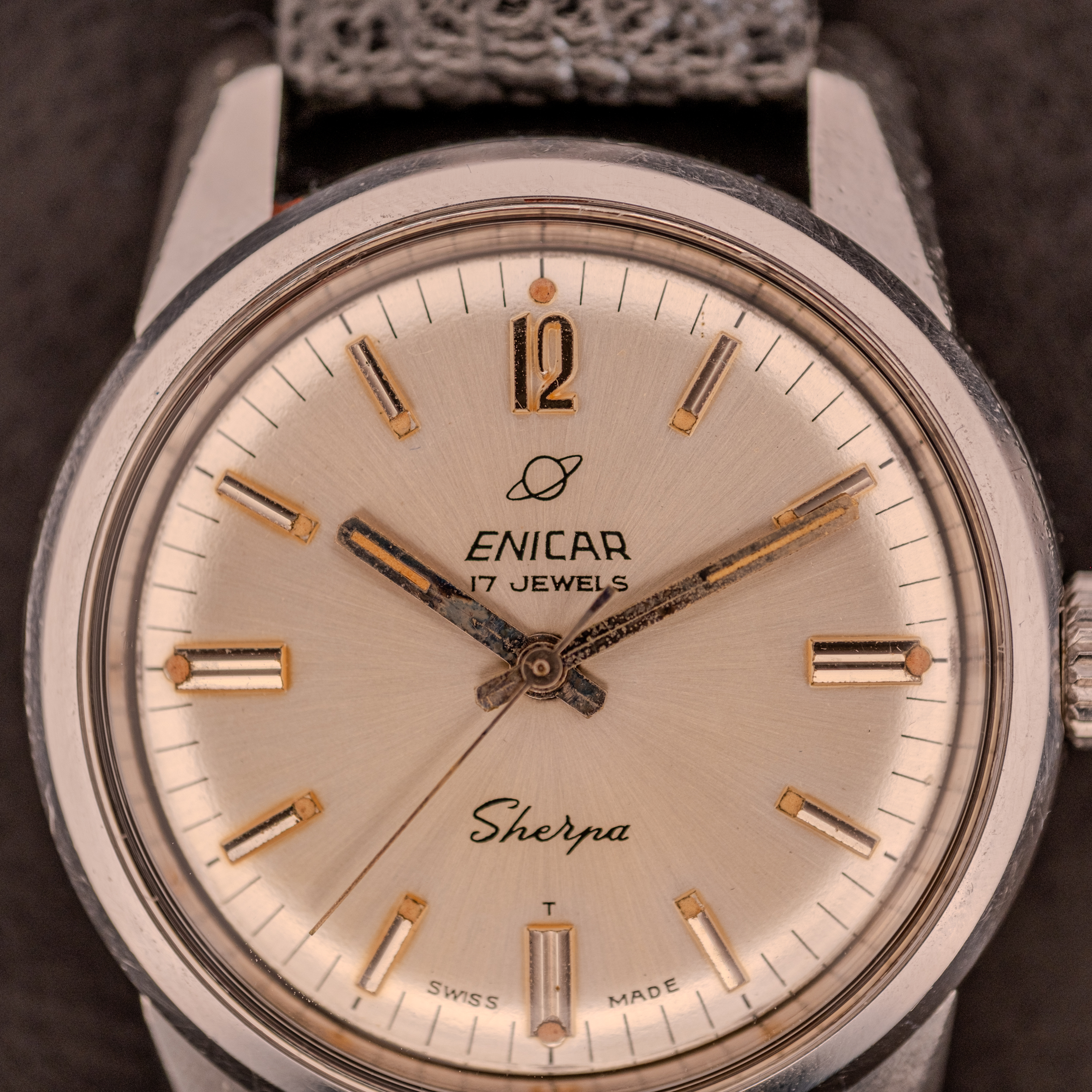 The dial on this example is equally noteworthy. The silver sunburst surface carries applied silver baton markers with lume fills at each hour, an applied Arabic numeral “12” at the top, and the Enicar planet logo above the brand name. “17 Jewels” is printed beneath the Enicar name, and the “Sherpa” script sits in its characteristic position at the lower half of the dial. The “T” designation and “Swiss Made” at 6 o’clock confirm tritium luminous material. The lume within the baton markers has aged to a warm, honeyed tone that catches light beautifully against the silver surrounds. This particular dial layout, with its combination of applied batons and the single Arabic numeral, appears to be an uncommon variant within the Seapearl 600 production run, and we believe it to be quite rare.