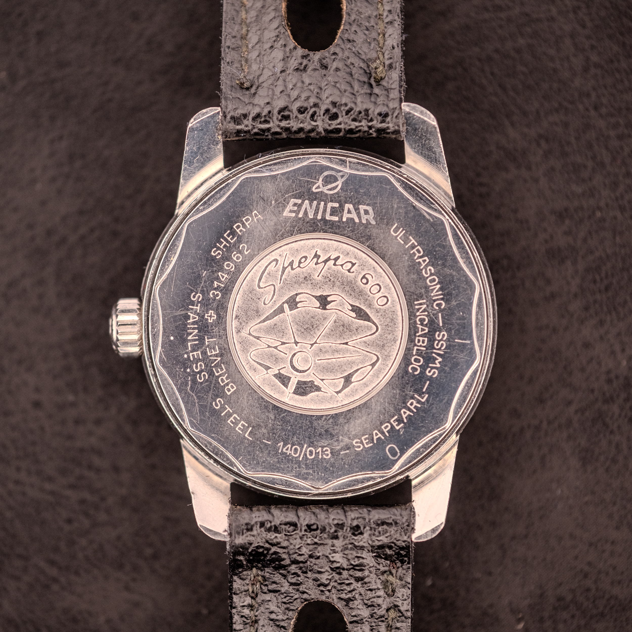 The stainless steel super compressor case is in honest condition, with surface wear consistent with a tool watch that was used as intended. The scalloped bayonet caseback is a beautiful detail, engraved with the Sherpa 600 pearl diver medallion at center and surrounded by “Enicar, Sherpa, Brevet + 314962, Ultrasonic, Incabloc, Swiss, Seapearl, 140/013, Stainless Steel.” The signed Enicar crown is original. The case profile shows the distinctive super compressor proportions, with the crown recessed between the case flanks.