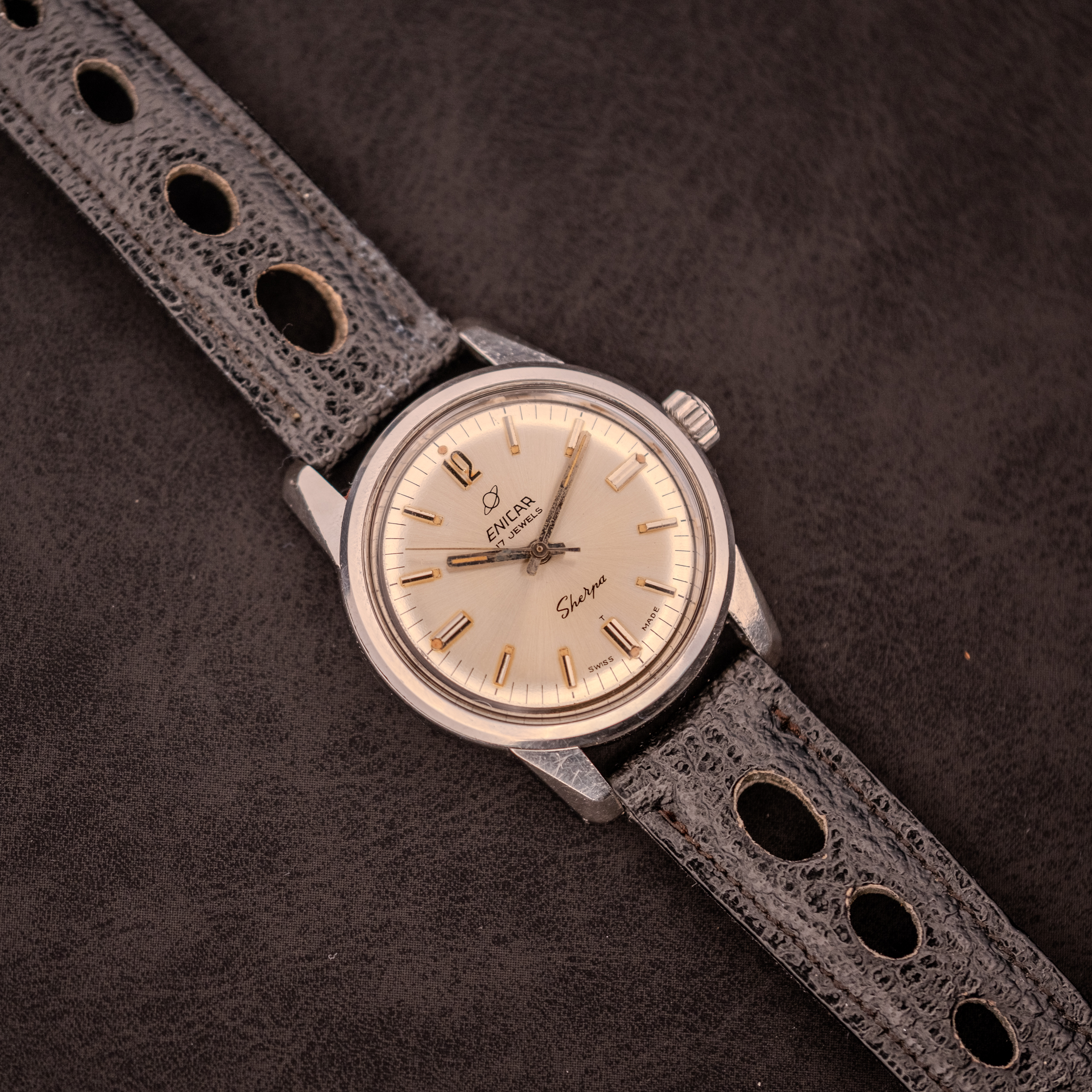 A silver sunburst dial with applied silver baton markers, an applied Arabic “12,” and the iconic “Sherpa” script, all housed in an EPSA super compressor case with its distinctive scalloped bayonet caseback featuring the Sherpa 600 pearl diver medallion. The gilt-finished AR 1140 manual-wind movement is a genuinely uncommon find inside this 600-foot rated case. Presented on a black rally strap.