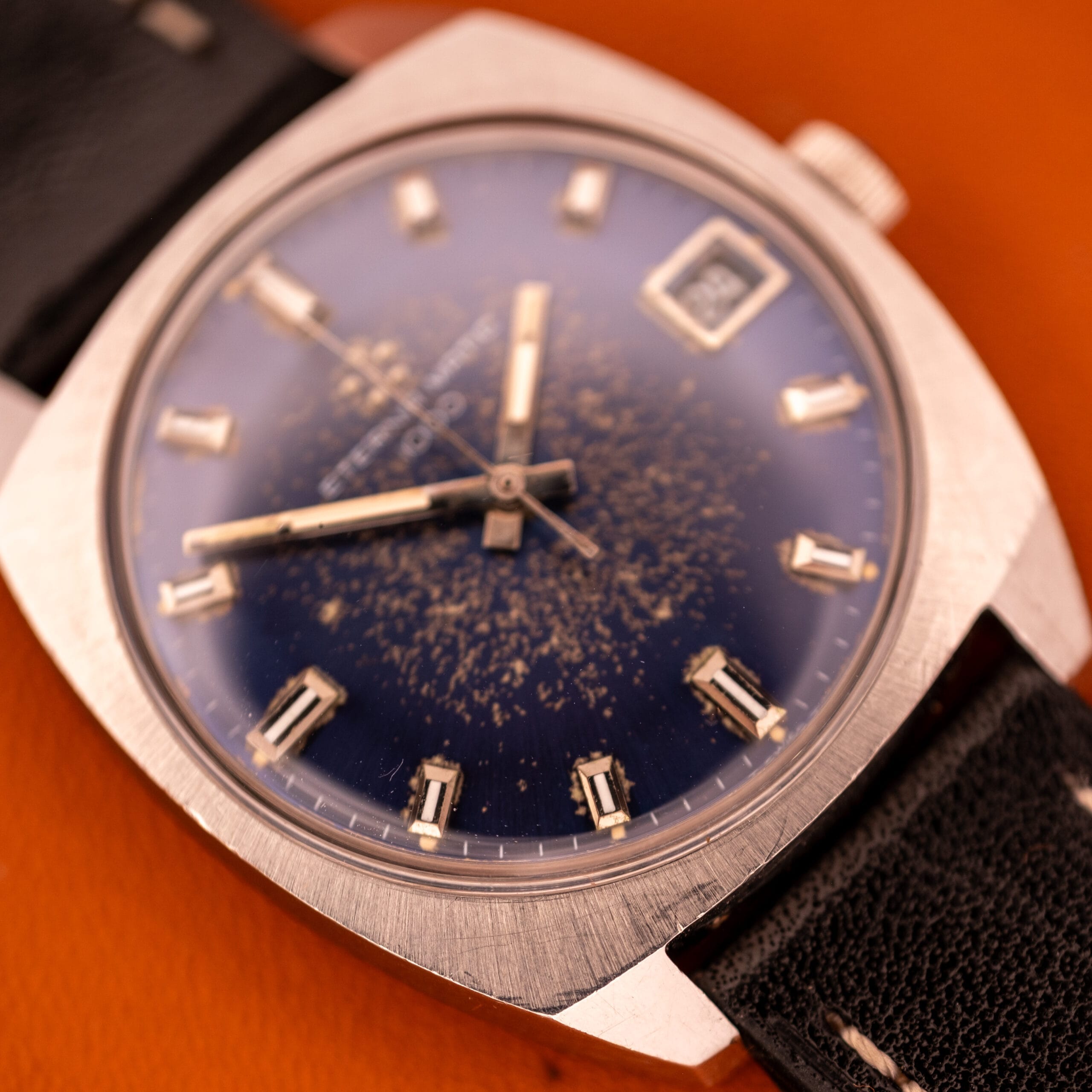This vintage Eterna Matic 1000, reference 110T, dates to the late 1960s and features a durable stainless steel case with straight, tapered lugs. The watch is defined by its striking blue dial, which has developed a heavy, unique patina over time, offering a “one-of-a-kind” aesthetic. Time is displayed via applied baton indices and baton hands. Inside beats the Eterna Caliber 1489K, a robust automatic movement featuring the brand’s signature ball-bearing rotor system. The watch is fitted on a period-appropriate leather strap that complements the cool tones of the dial.