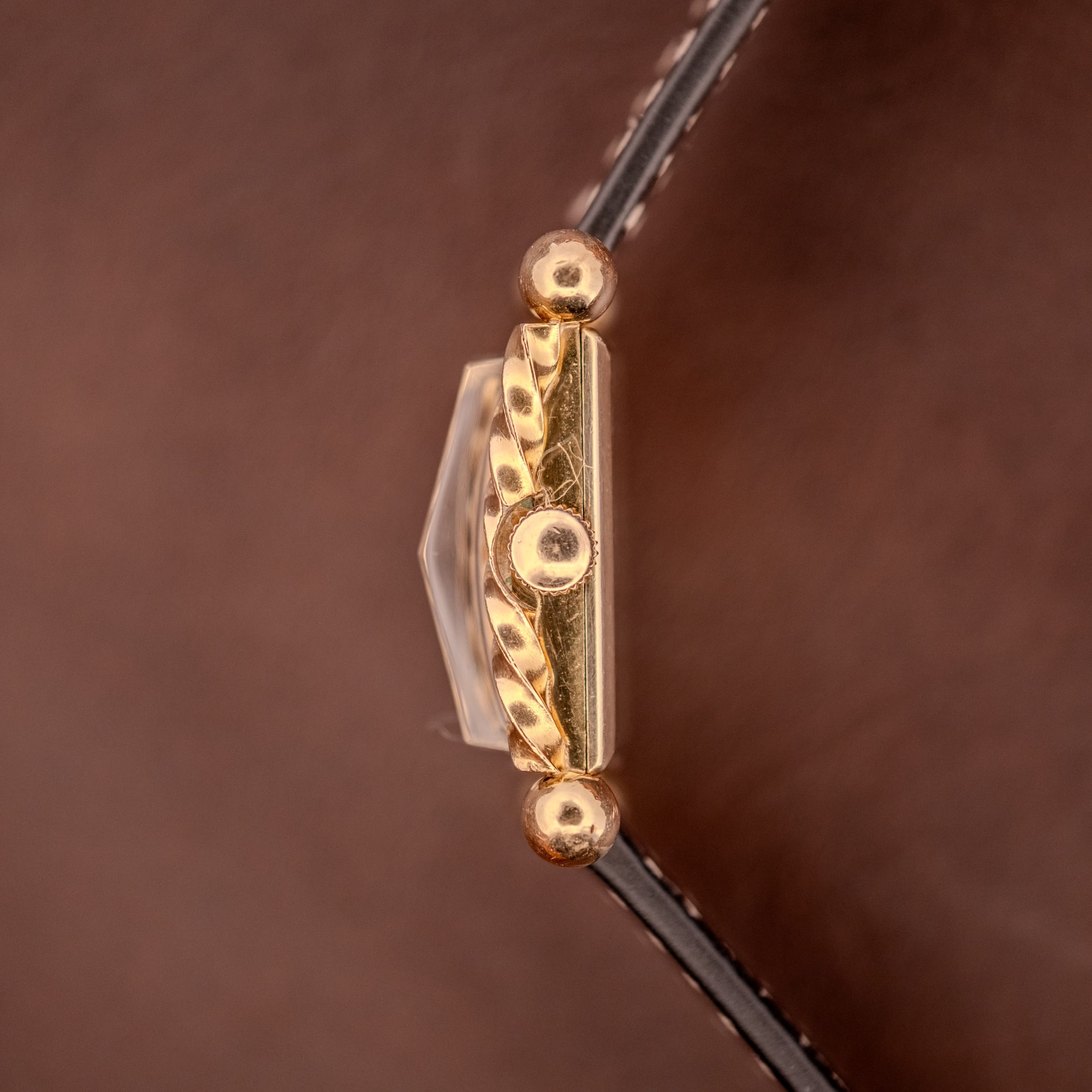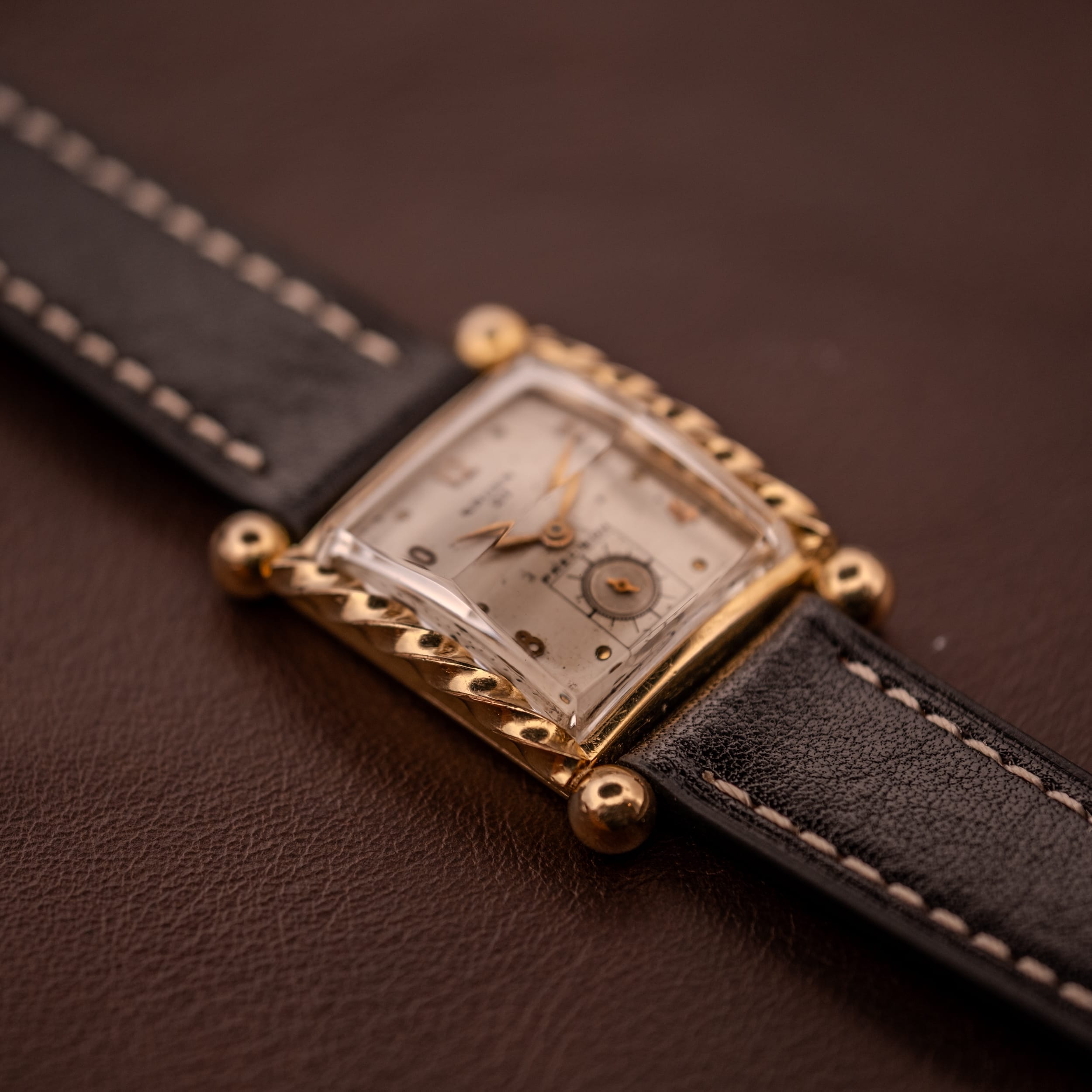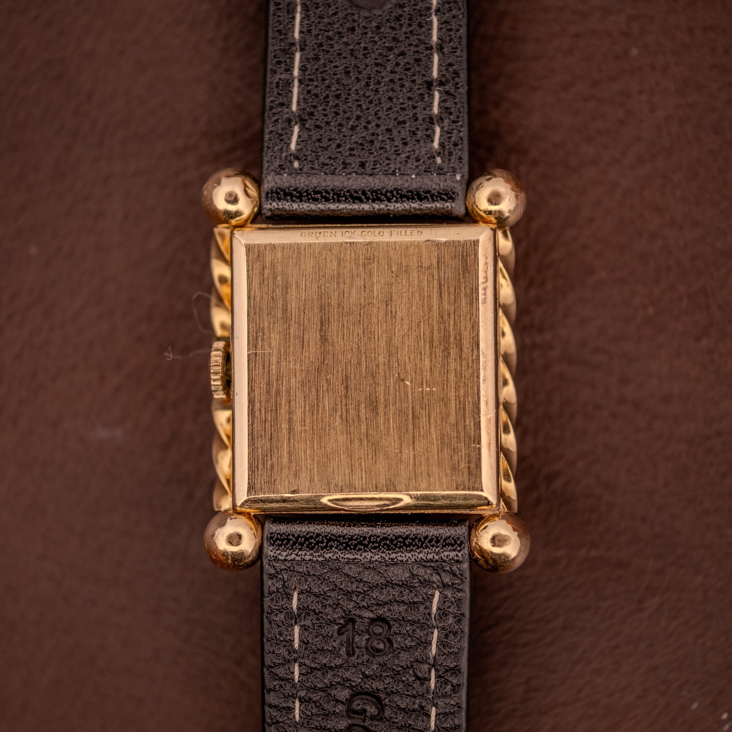 This particular example, Reference 335/530, is an absolute showstopper of mid-century case design. The square case features a dramatic twisted rope or barley twist motif running along both sides, flanked by four prominent polished ball lugs at each corner that serve as both decorative elements and functional strap attachments. The effect is unmistakably jewelry-like, evoking the kind of ornamental goldsmithing you might see on a fine bracelet or brooch rather than a conventional wristwatch. It’s bold, it’s unapologetically decorative, and to us, it’s absolutely fantastic. The faceted acrylic crystal adds another layer of visual interest, catching and refracting light in a way that gives the watch a brilliant, gem-like quality from certain angles. This is a watch that was designed to be noticed, and it succeeds spectacularly.