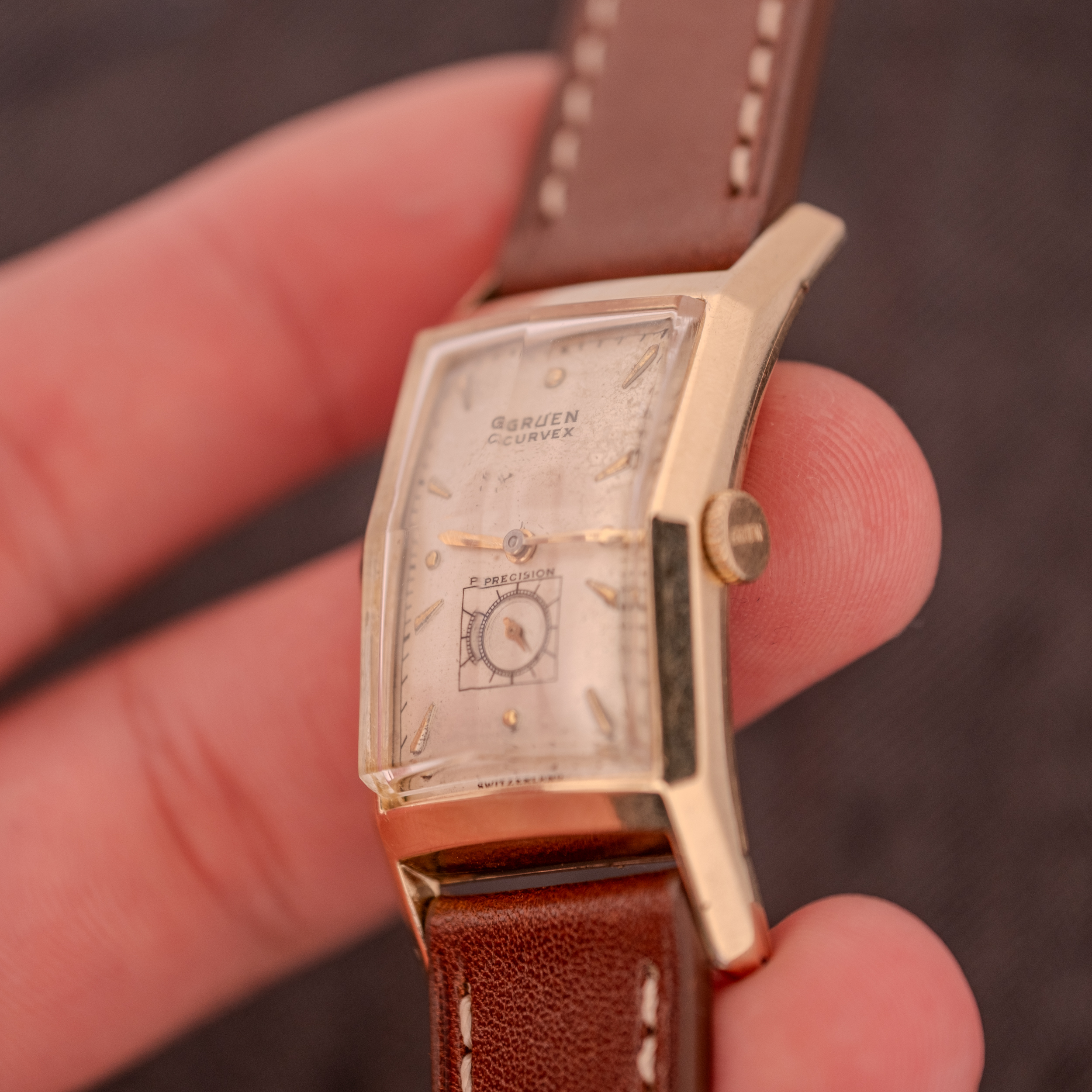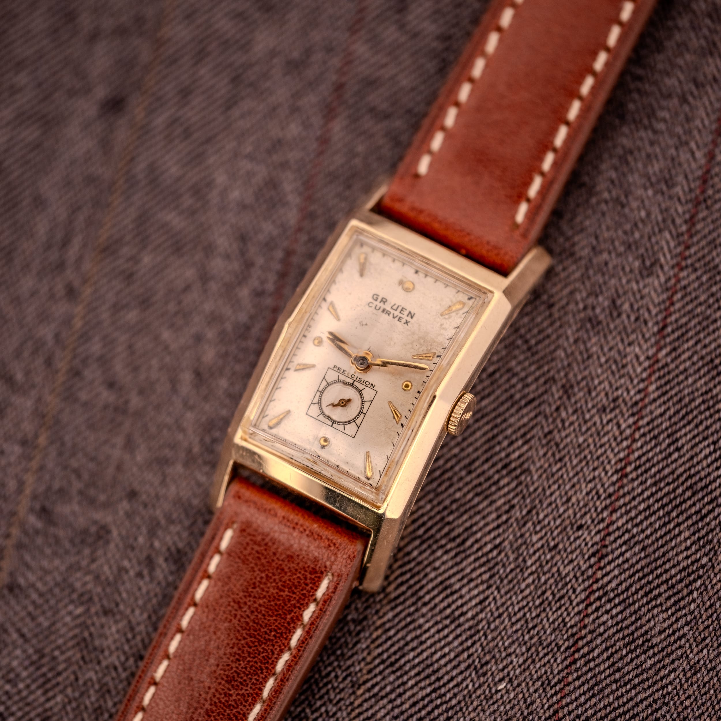 This particular example features the faceted pyramid crystal, which is one of the most visually striking details on any Curvex variant. Rather than a flat or simple domed crystal, this one is cut with angular facets that catch and refract light differently depending on the viewing angle. It gives the watch a presence that photographs struggle to fully capture; in person, the crystal plays with light in a way that draws the eye constantly. The silver dial carries “Gruen Curvex” in the upper half with applied gold spearhead markers at the hours and Arabic numerals at 12 and 6. The sub-seconds register at 6 o’clock is framed within a diamond shaped surround with “Precision” printed above it, a lovely period detail. The gold hands are original and show their age with gentle darkening of the luminous material.