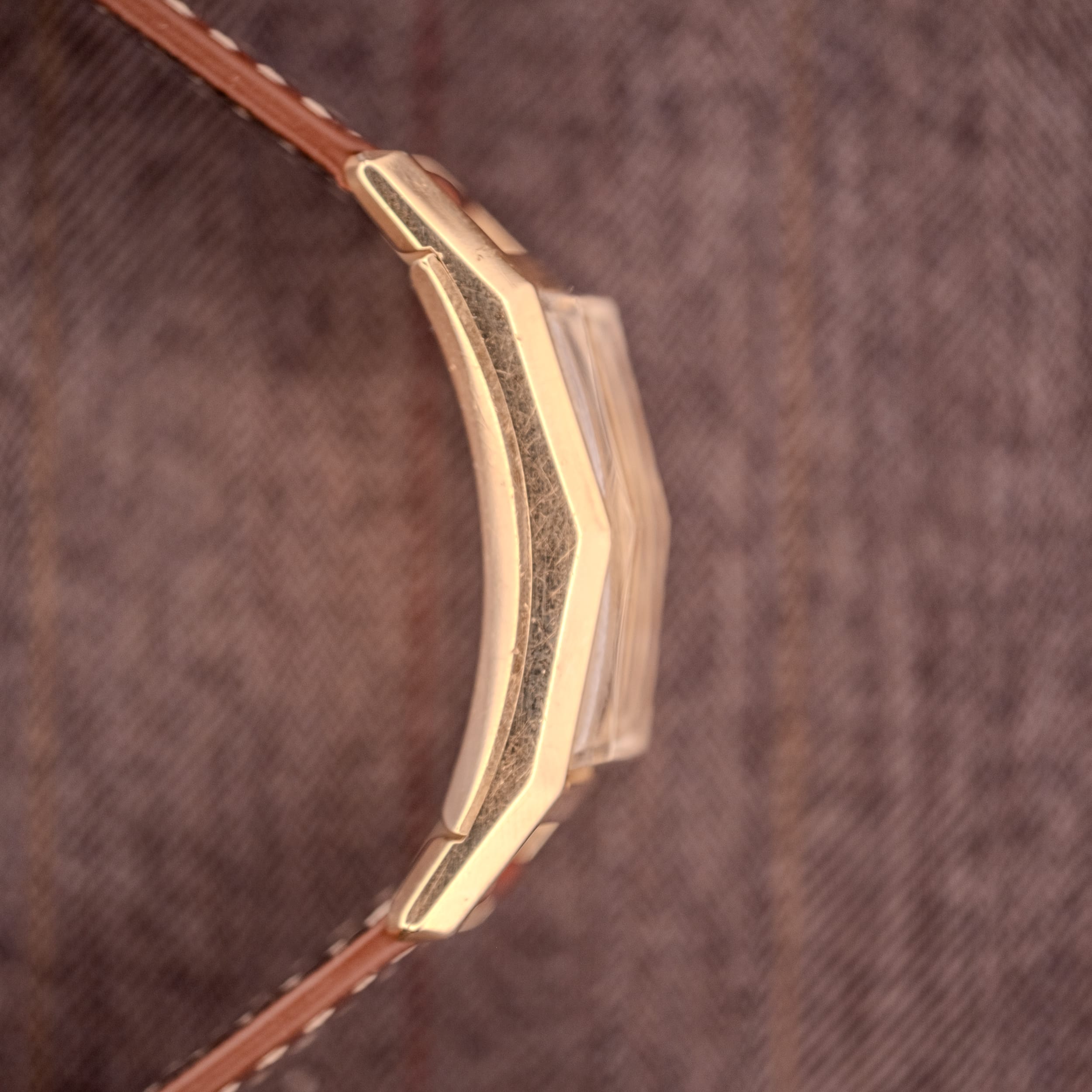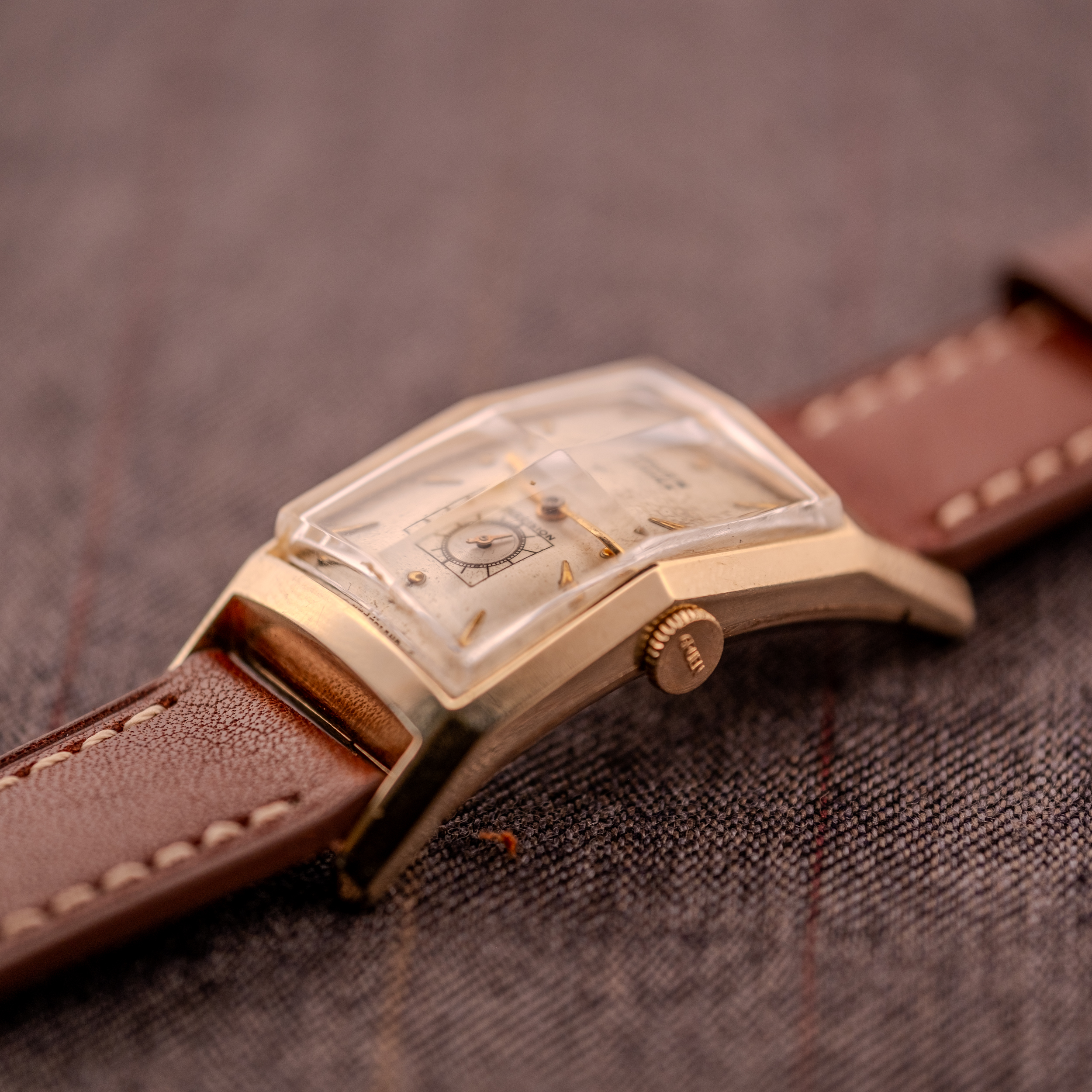 Paired here on brown leather strap that complements the gold tones perfectly, this Curvex is a masterclass in 1940s American design. The combination of the curved case, the pyramid crystal, and the balanced dial layout makes it one of the most distinctive vintage watches you can wear today, and at a fraction of what comparable rectangular dress watches from the Swiss houses command.
