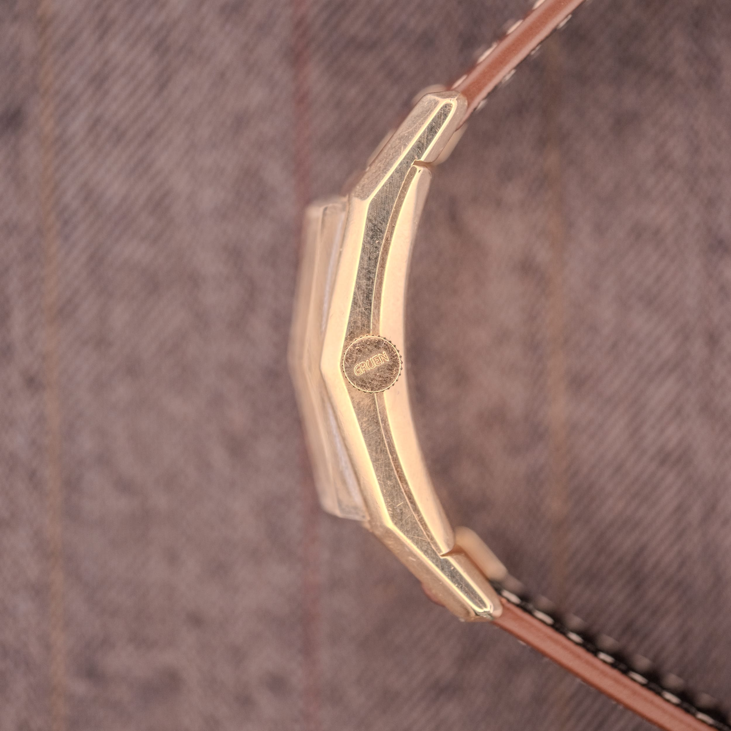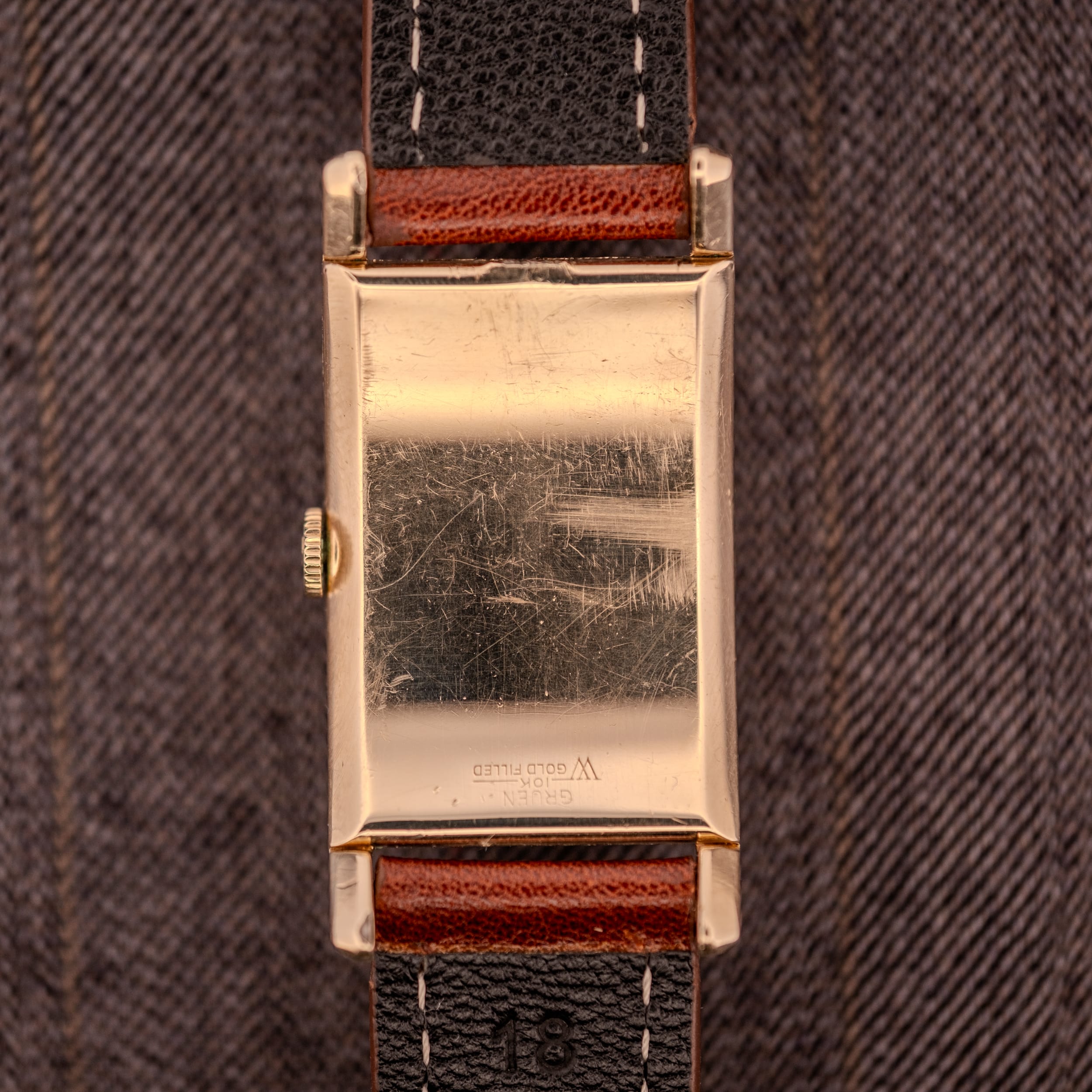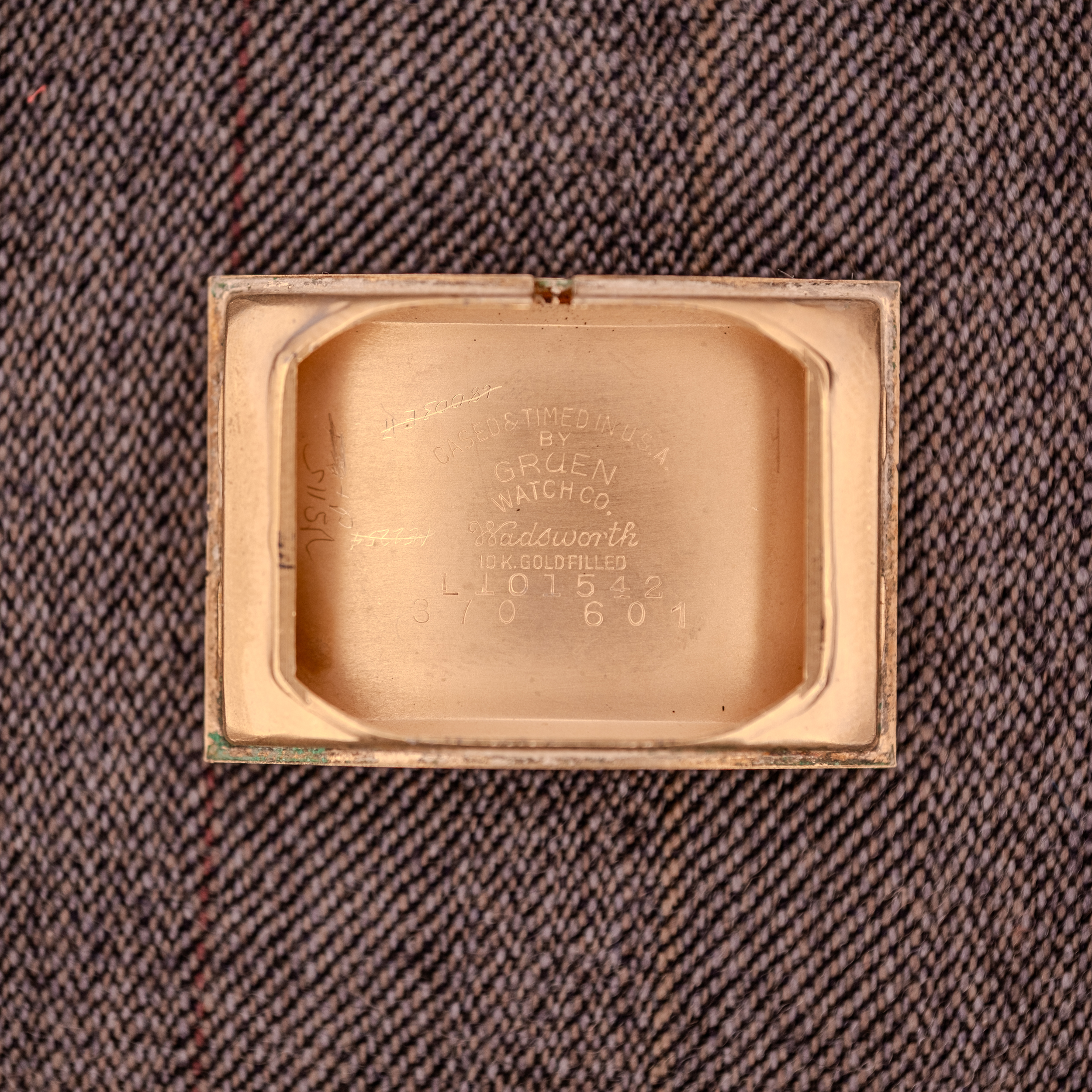 The 10K gold filled Wadsworth case shows honest wear consistent with eight decades of life. The profile shots reveal the signature Curvex curve beautifully, and the case retains crisp edges along its rectangular frame. The outer caseback is stamped “Gruen, 10K, W Gold Filled” with the Wadsworth hallmark, and the inner caseback reads “Cased and Timed in U.S.A. by Gruen Watch Co, Wadsworth, 10K Gold Filled, L101542, 370-601.” There is some green verdigris visible at the case edges where the gold fill meets the base metal, which is typical for gold filled cases of this era and does not affect the structural integrity. The Gruen signed crown is original.