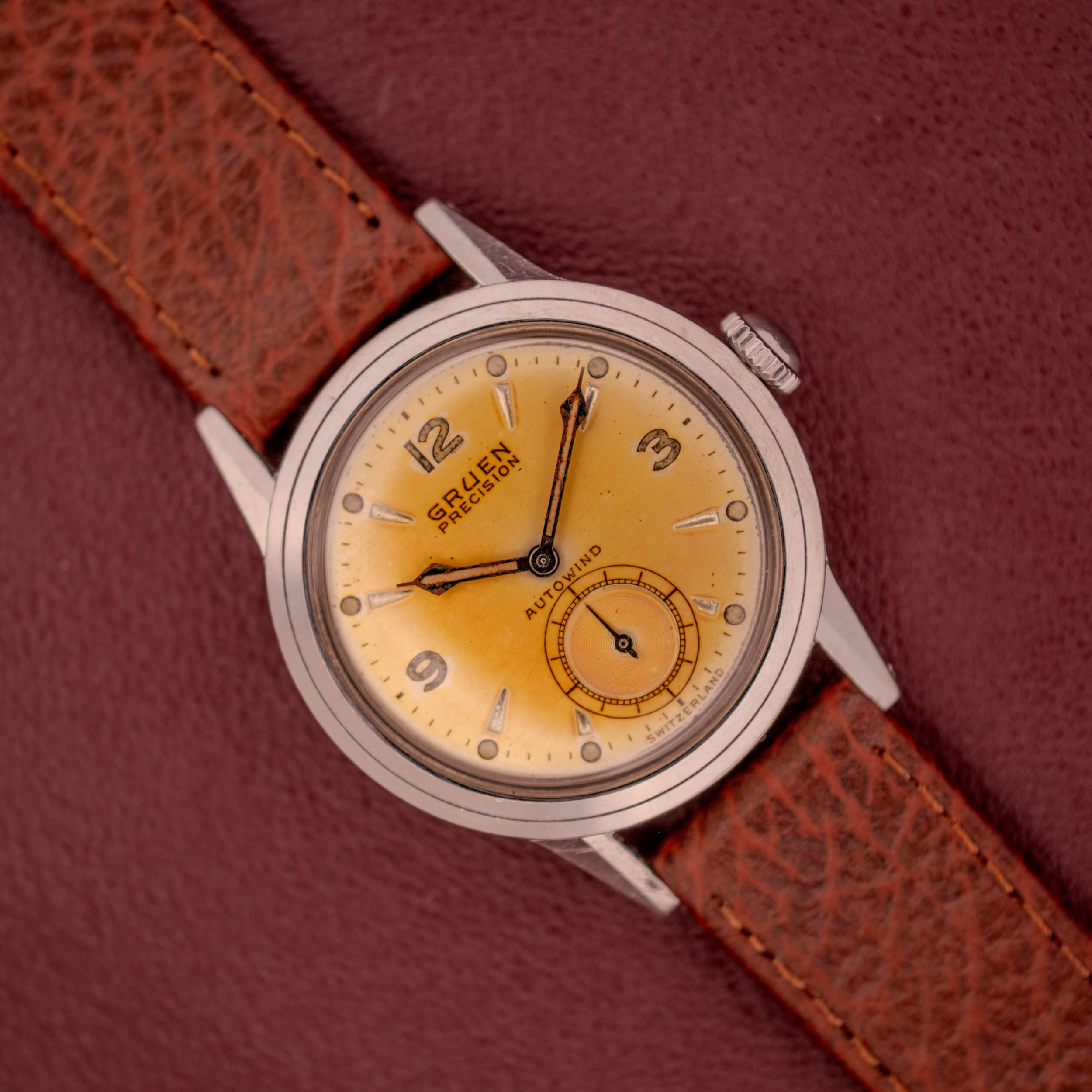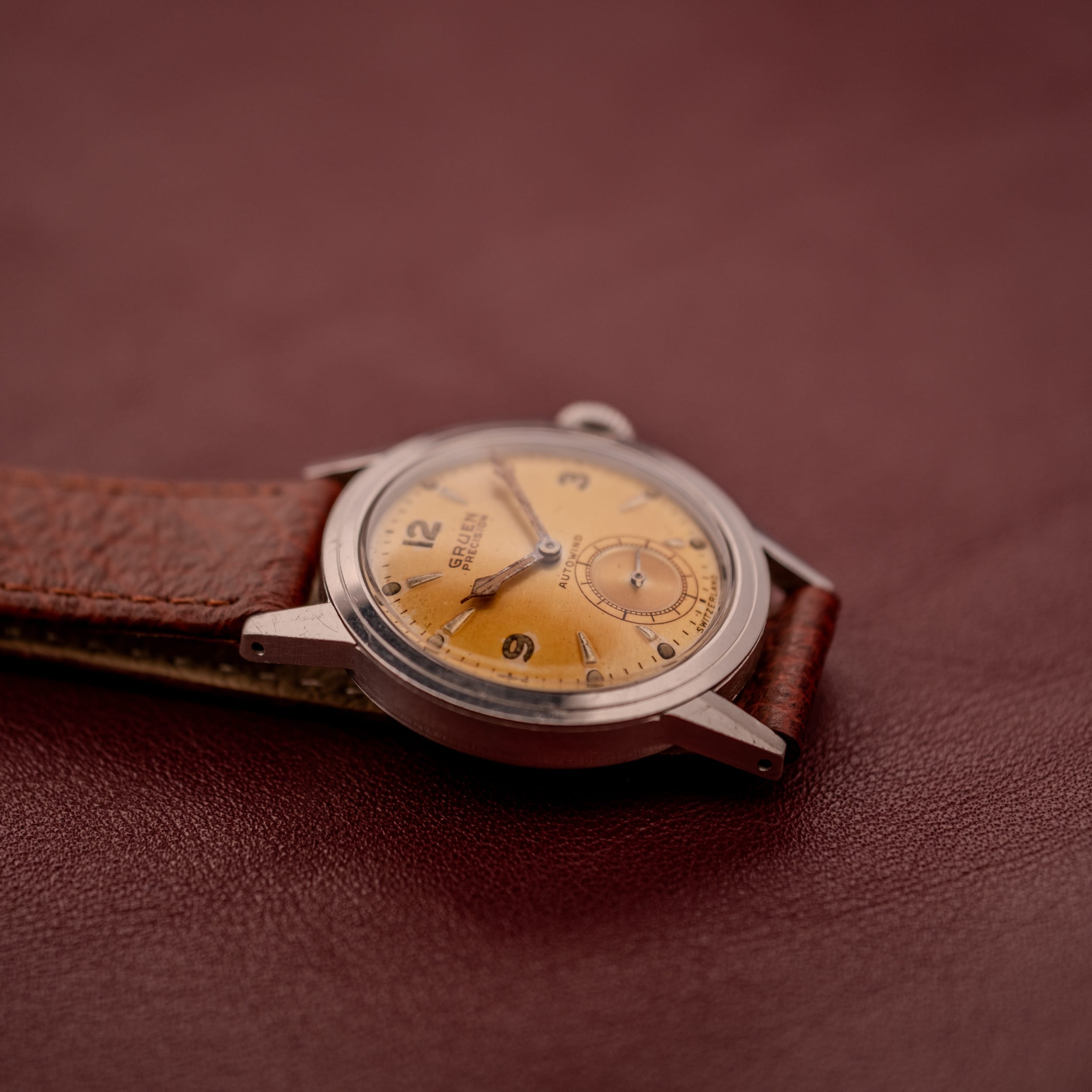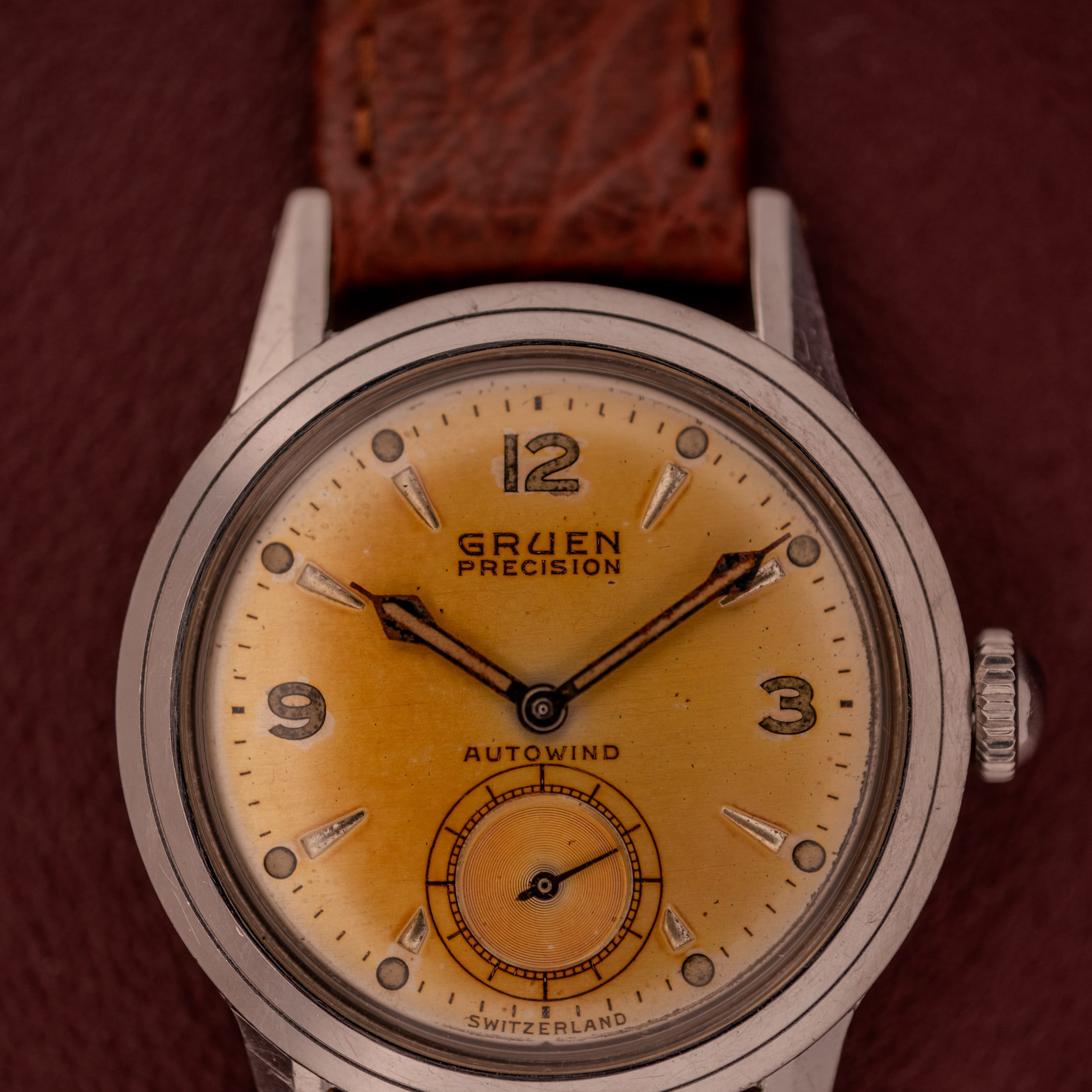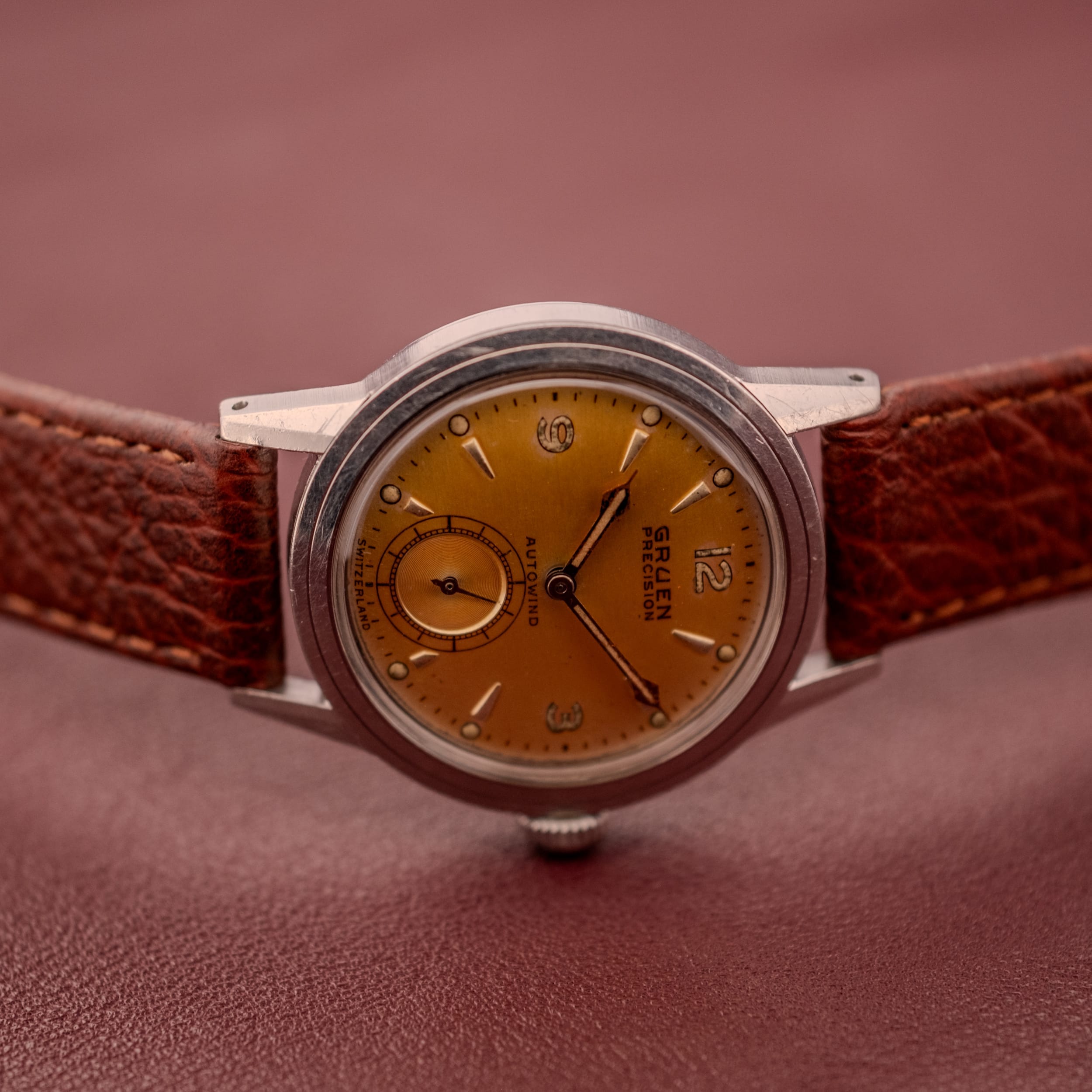This particular example is, without question, a showstopper, and it’s all about that dial. What was once a silver or cream-toned surface has transformed over the decades into a breathtaking tropical copper, a warm, amber-gold hue that deepens toward the edges and practically glows under warm light. This kind of natural patina is something that cannot be replicated or manufactured; it’s the result of decades of subtle chemical change, and collectors go absolutely wild for it. The applied dagger indices retain their crisp faceted edges and catch the light brilliantly against the warm dial surface, while the Arabic numerals at 12, 3, and 9 provide a classic mid-century anchor. The subsidiary seconds register at 6 o’clock is a wonderful detail, featuring a concentric guilloche pattern that adds visual texture and depth, ringed by a printed railroad track and flanked by small luminous dots and dagger markers. The “GRUEN PRECISION” branding sits prominently at 9 o’clock in Gruen’s distinctive block lettering, and the “AUTOWIND” designation below center confirms the automatic movement within.