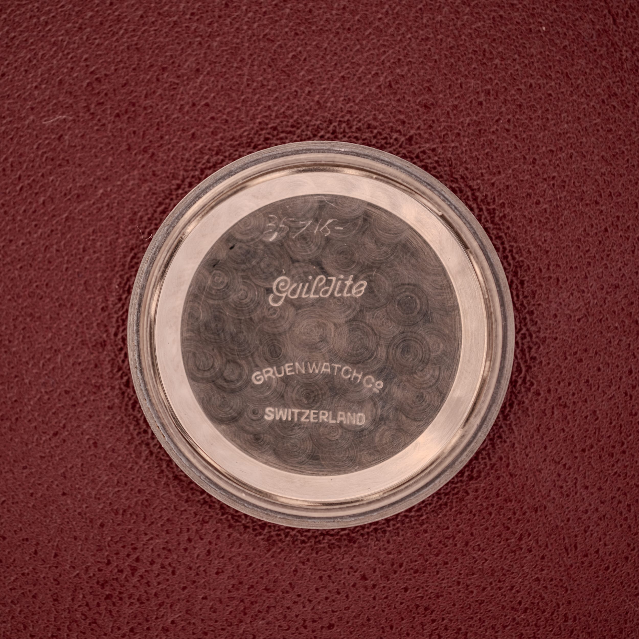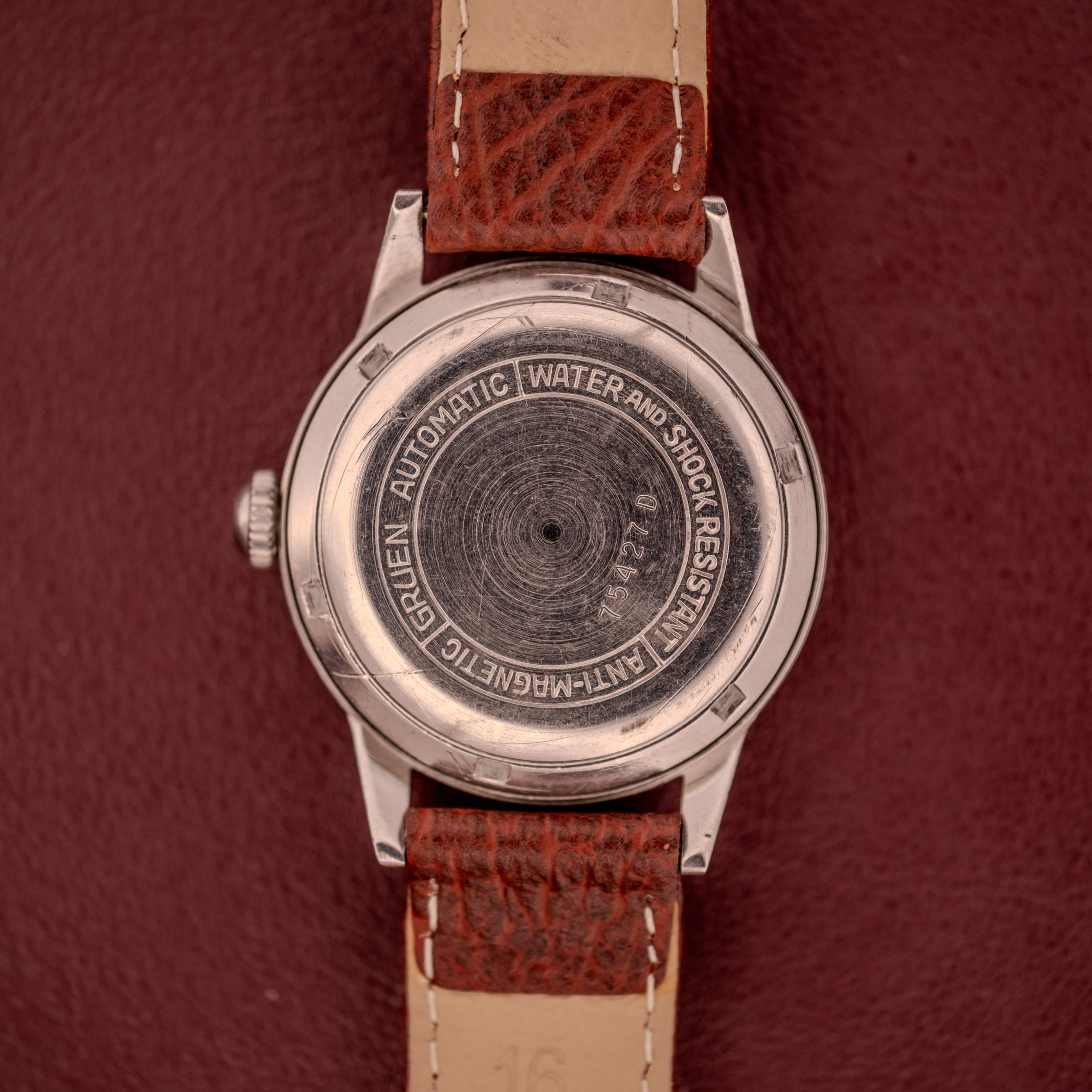 The stainless steel case is in strong, honest condition. The stepped bezel gives the watch a substantial, almost military feel, while the straight lugs with drilled lug holes provide both visual crispness and practical ease for strap changes. In profile, the case is impressively slim for a bumper automatic, a testament to the Veri-Thin engineering. The caseback carries the classic circular engraving denoting “Automatic,” “Water and Shock Resistant,” and “Anti-Magnetic,” while the inner caseback reveals the “Guildite” designation, Gruen’s proprietary stainless steel alloy known for its corrosion resistance. The case shows the kind of fine surface wear that speaks to a well-lived life, honest and character-building without any deep gouges or evidence of heavy-handed polishing. The lugs remain sharp and the proportions are fully intact.