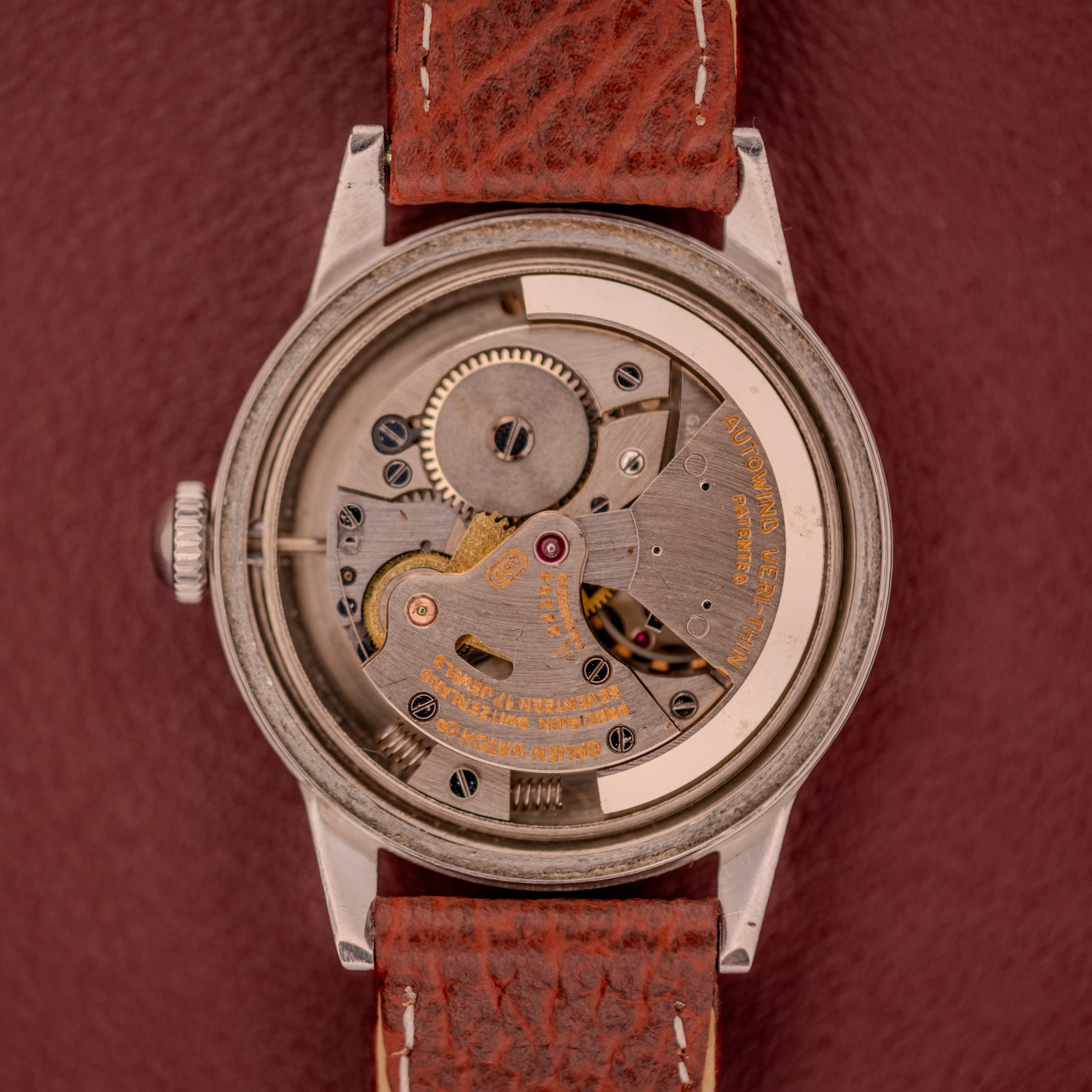 The Autowind series represents one of Gruen’s most important technical achievements. The Cal. 400, found in this watch, is a bumper automatic movement, meaning the rotor doesn’t spin a full 360 degrees but instead oscillates back and forth between two spring-loaded buffers, or “bumpers.” It’s a fascinating mechanical sensation on the wrist, you can actually feel the gentle thump of the rotor hitting its stops, something that modern full-rotor automatics simply don’t provide. The “Veri-Thin” designation was Gruen’s promise that despite the added complexity of an automatic winding system, the movement remained slim enough for an elegant dress watch profile. The Cal. 400 is a 17-jewel Swiss movement, beautifully finished with Côtes de Genève striping on the bridges and gilt lettering that spells out “AUTOWIND VERI-THIN PATENTED” across the rotor bridge. It’s a movement that tells you Gruen took pride not just in function, but in presentation.