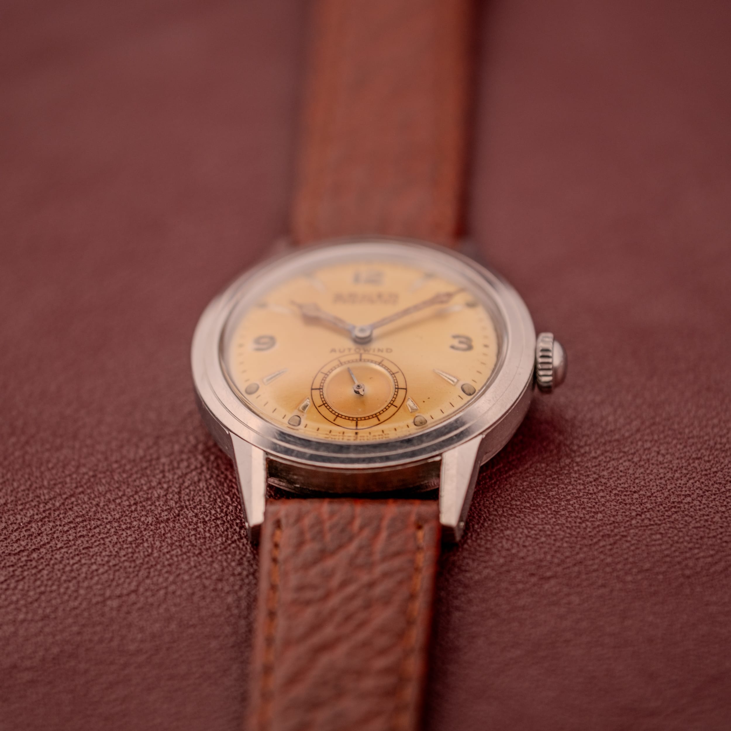 To us, this Gruen Precision Autowind is one of the most compelling vintage watches we’ve had the pleasure of offering. The tropical dial alone elevates this piece into rarefied territory, the kind of organic, unrepeatable aging that serious collectors spend years hunting for. Pair it with the historically significant bumper automatic movement, the beautiful Guildite case, and Gruen’s rich American-Swiss heritage, and you have a watch that punches so far above its weight class it’s almost unfair. Whether you’re a seasoned collector looking for a truly unique dial or someone just discovering the joy of mid-century automatics, this is a piece that demands attention and rewards it handsomely. On a warm leather strap, it’s pure vintage perfection.