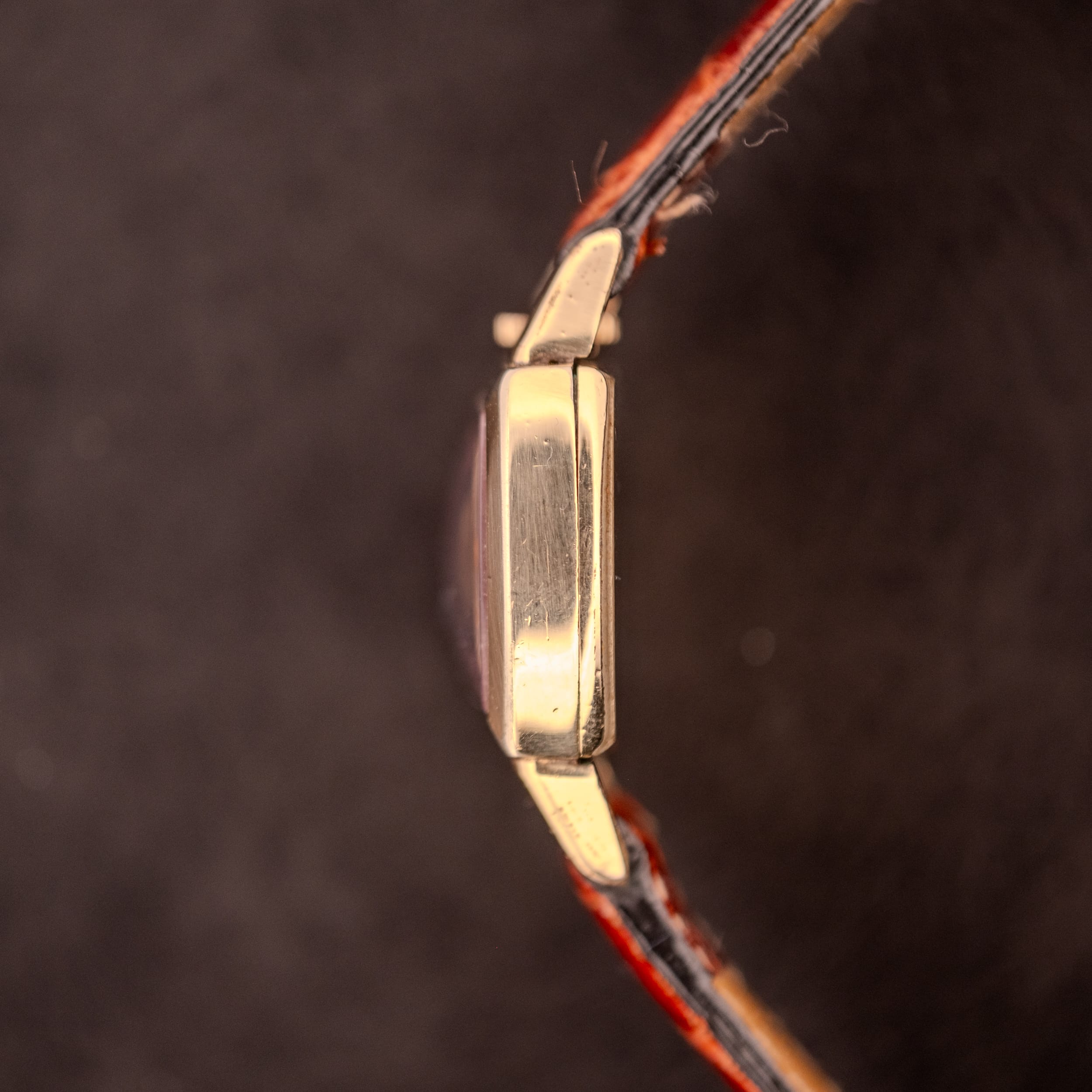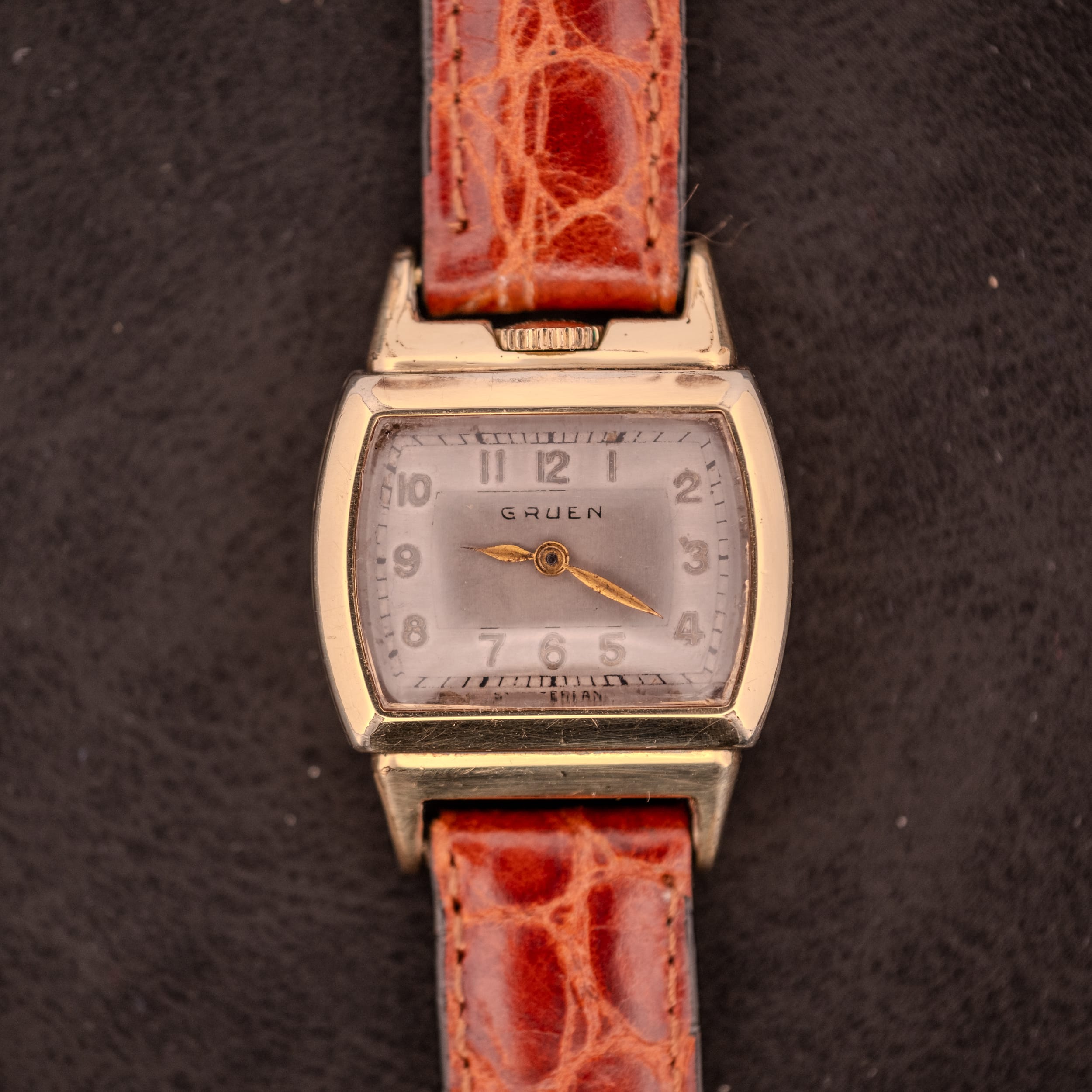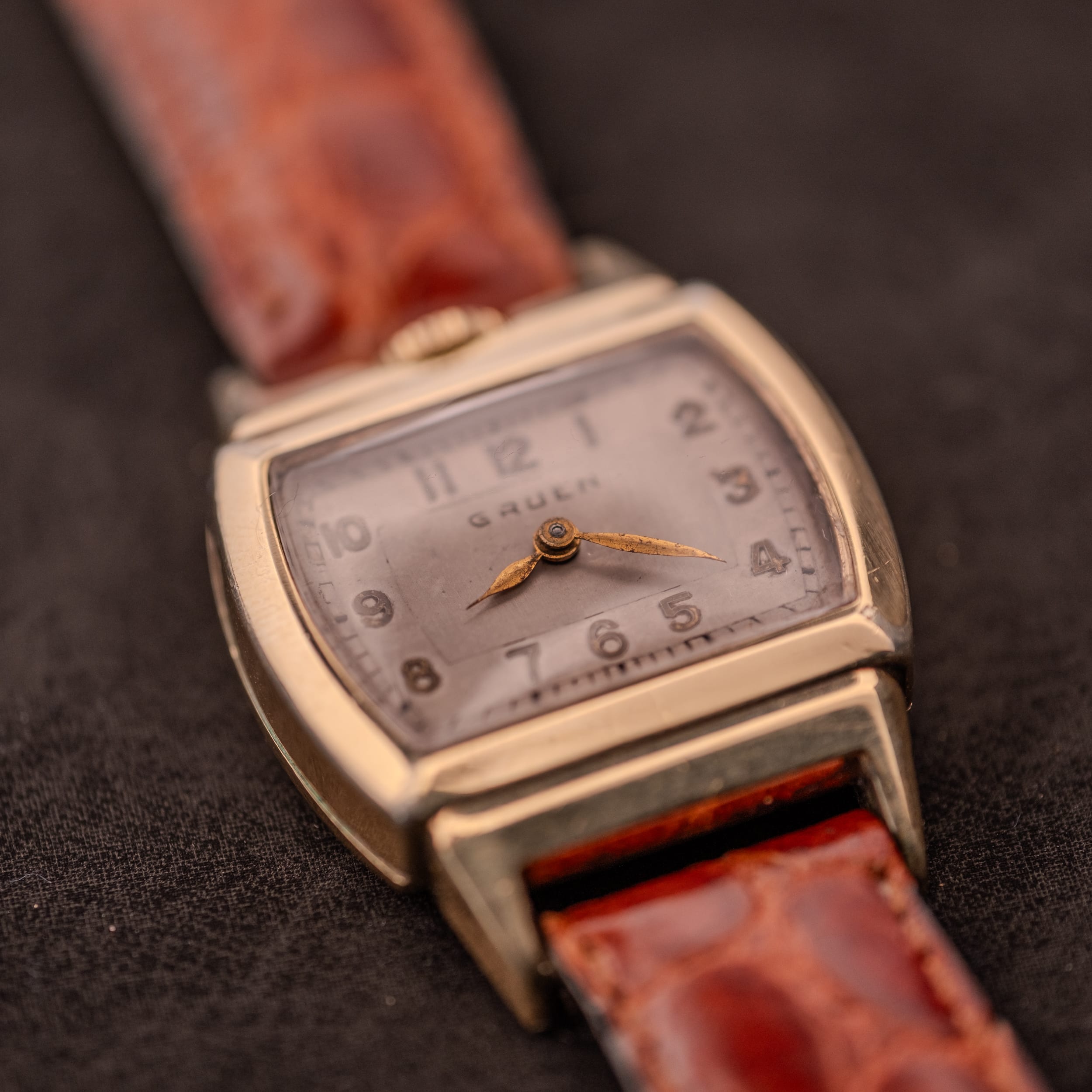 This particular example shows its eight decades with honest character. The silver dial has developed a gentle warm patina, and the full Arabic numeral chapter ring remains clearly legible around the perimeter. The numerals are printed in a period-correct font that wraps beautifully around the cushion-shaped dial opening, with fine hash marks forming the outer minute track. The “Gruen” name sits centered below 12, and “Switzerland” is just visible at 6. The gold leaf hands have aged gracefully and retain their original warmth. The 10K gold filled case shows surface wear consistent with regular enjoyment, with scratching visible on the caseback and light marks on the case flanks, but the tonneau proportions remain well defined and the crown at 12 operates smoothly. The profile shots reveal just how compact and elegant this case is, a watch designed for the smaller wrist proportions of the era that feels perfectly scaled today for anyone who appreciates a vintage-correct wearing experience.