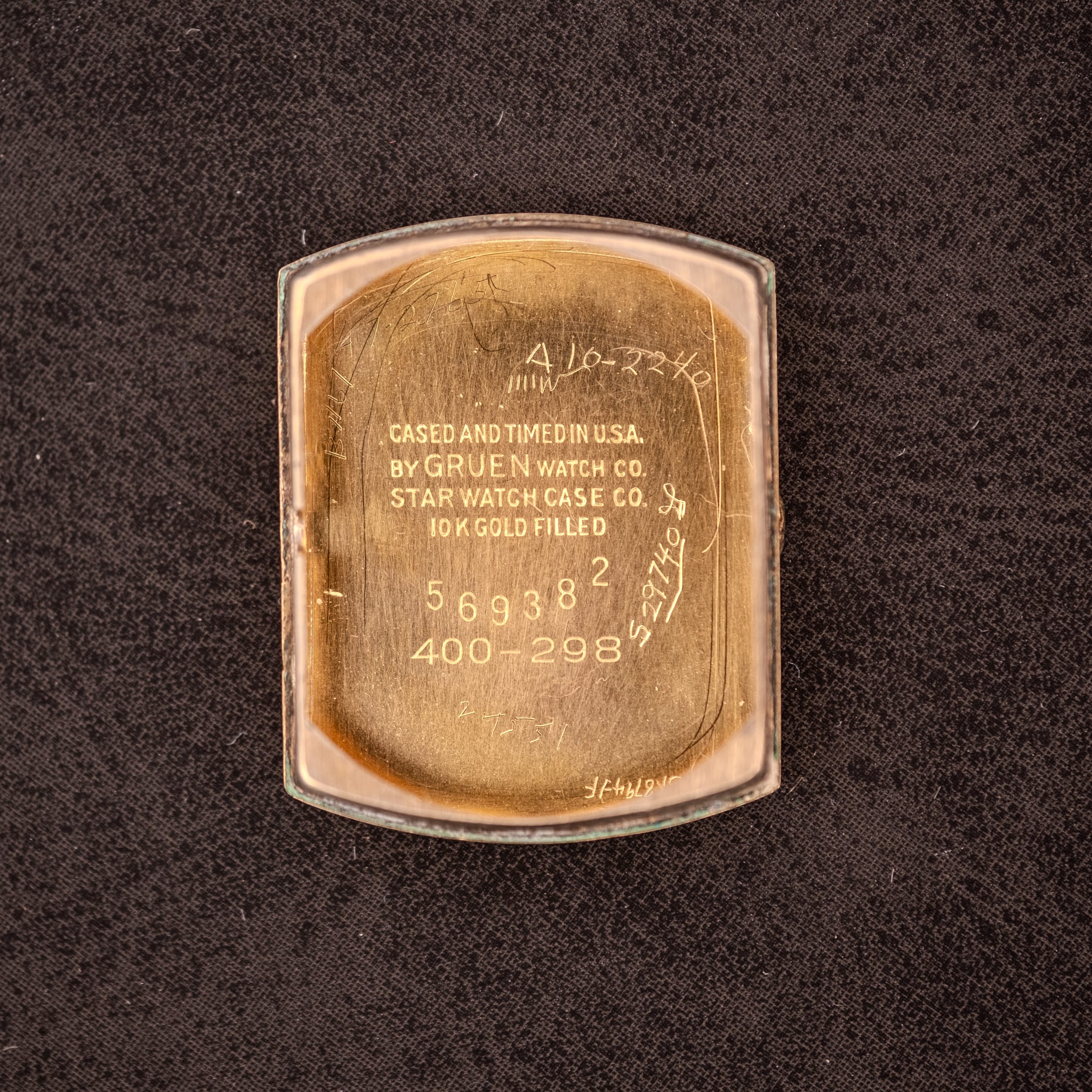 Gruen was one of the great names in American watchmaking during the first half of the twentieth century. Founded in 1874 by Dietrich Gruen, the company maintained a unique transatlantic structure, designing and assembling watches in Cincinnati while manufacturing movements at its own facility in Biel, Switzerland, a factory the company called “Time Hill.” This arrangement gave Gruen access to Swiss craftsmanship while maintaining its American identity, and the result was a catalog of watches that blended European movement quality with American case design sensibility. The Star Watch Case Co. produced many of Gruen’s cases during this period, and the inner caseback of this example confirms the partnership with its “Cased and Timed in U.S.A. by Gruen Watch Co, Star Watch Case Co, 10K Gold Filled” stamping, along with case number 56938 and ref. 400-298.
