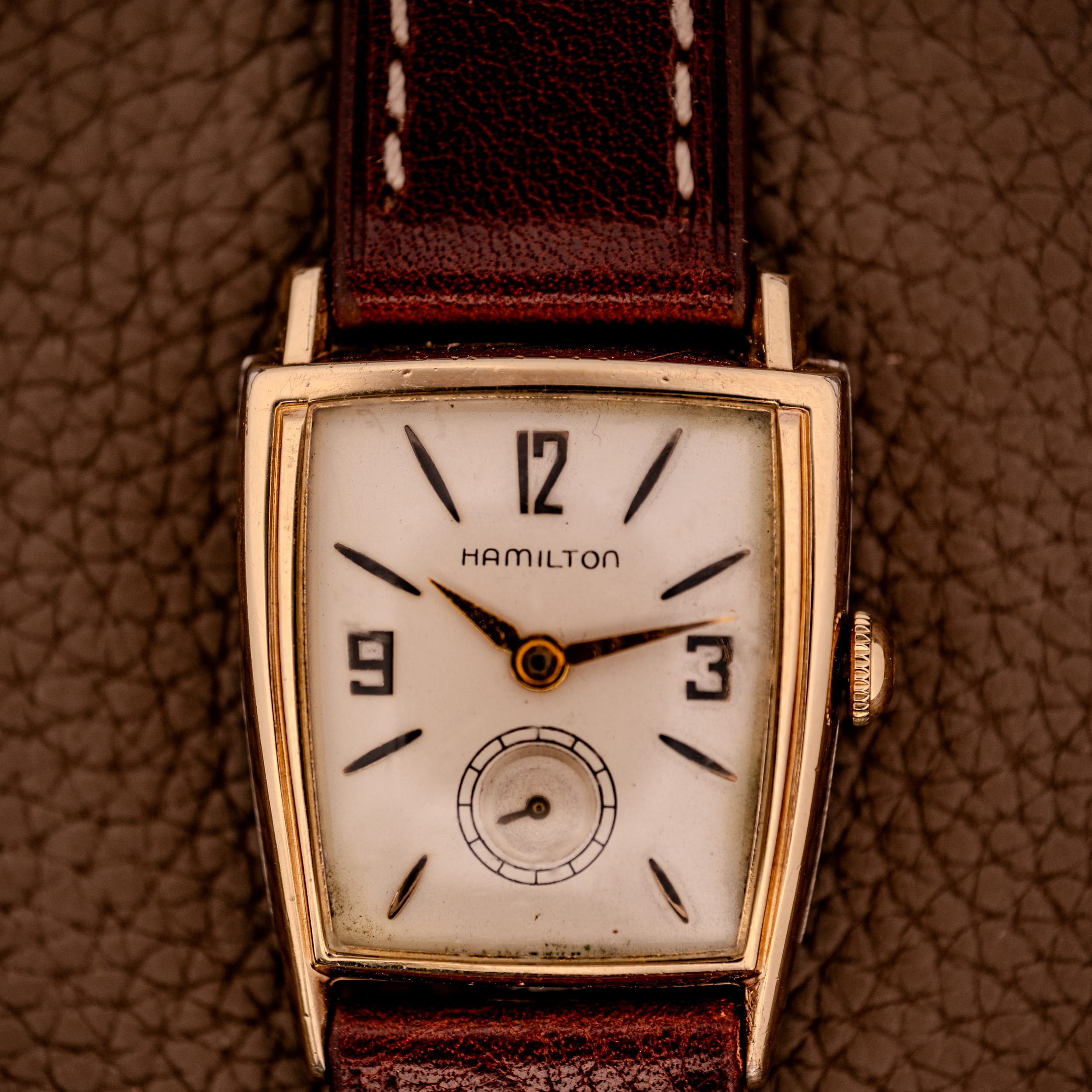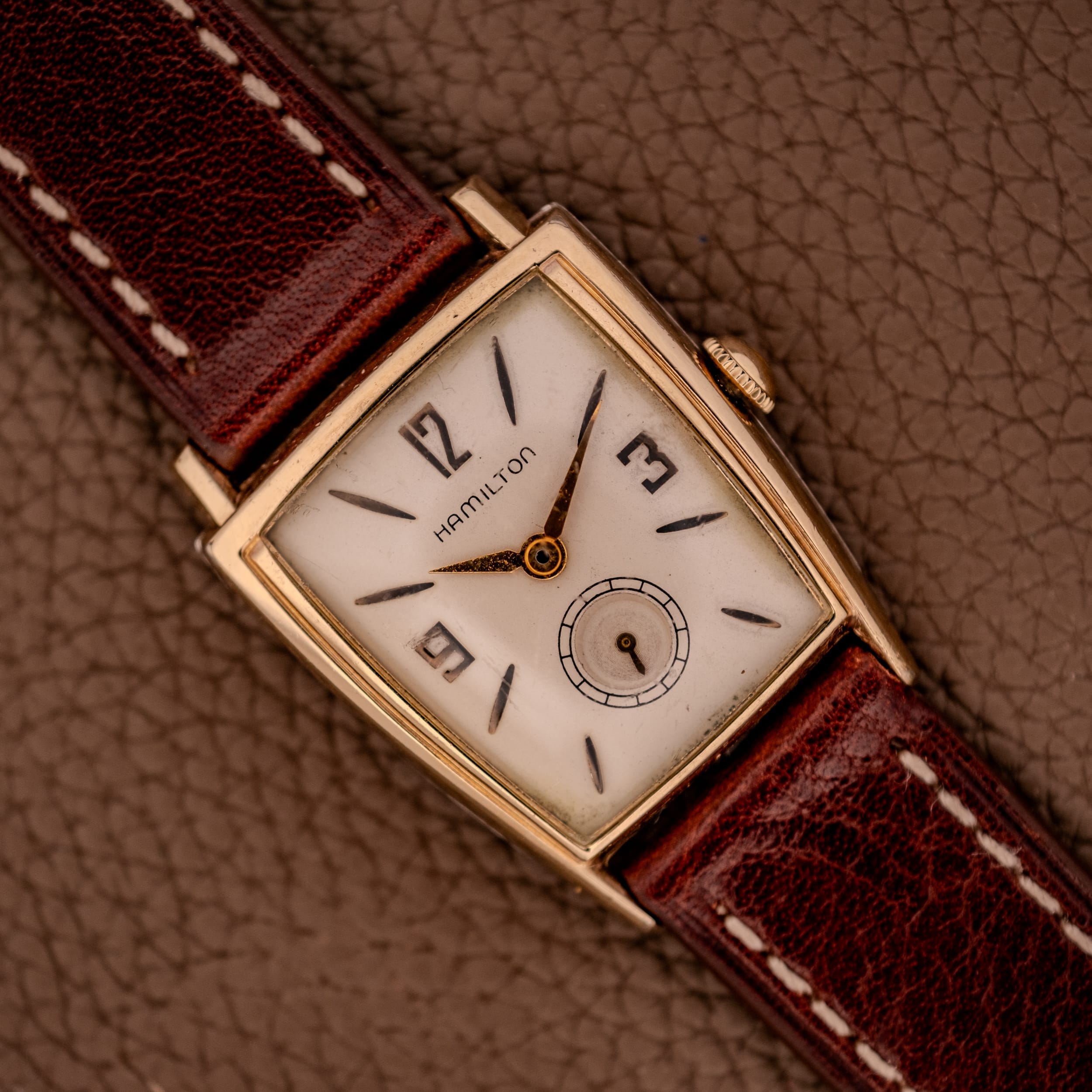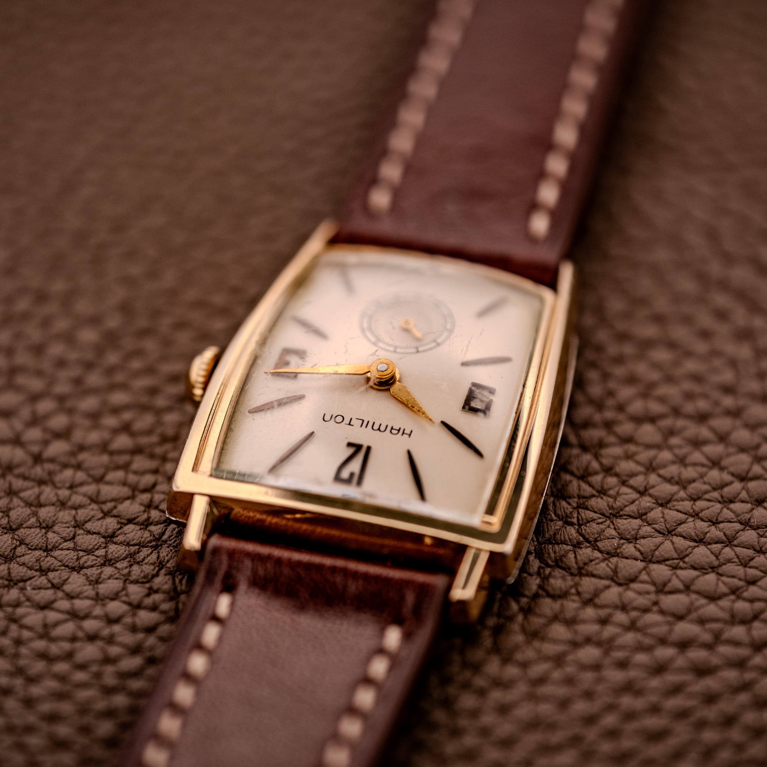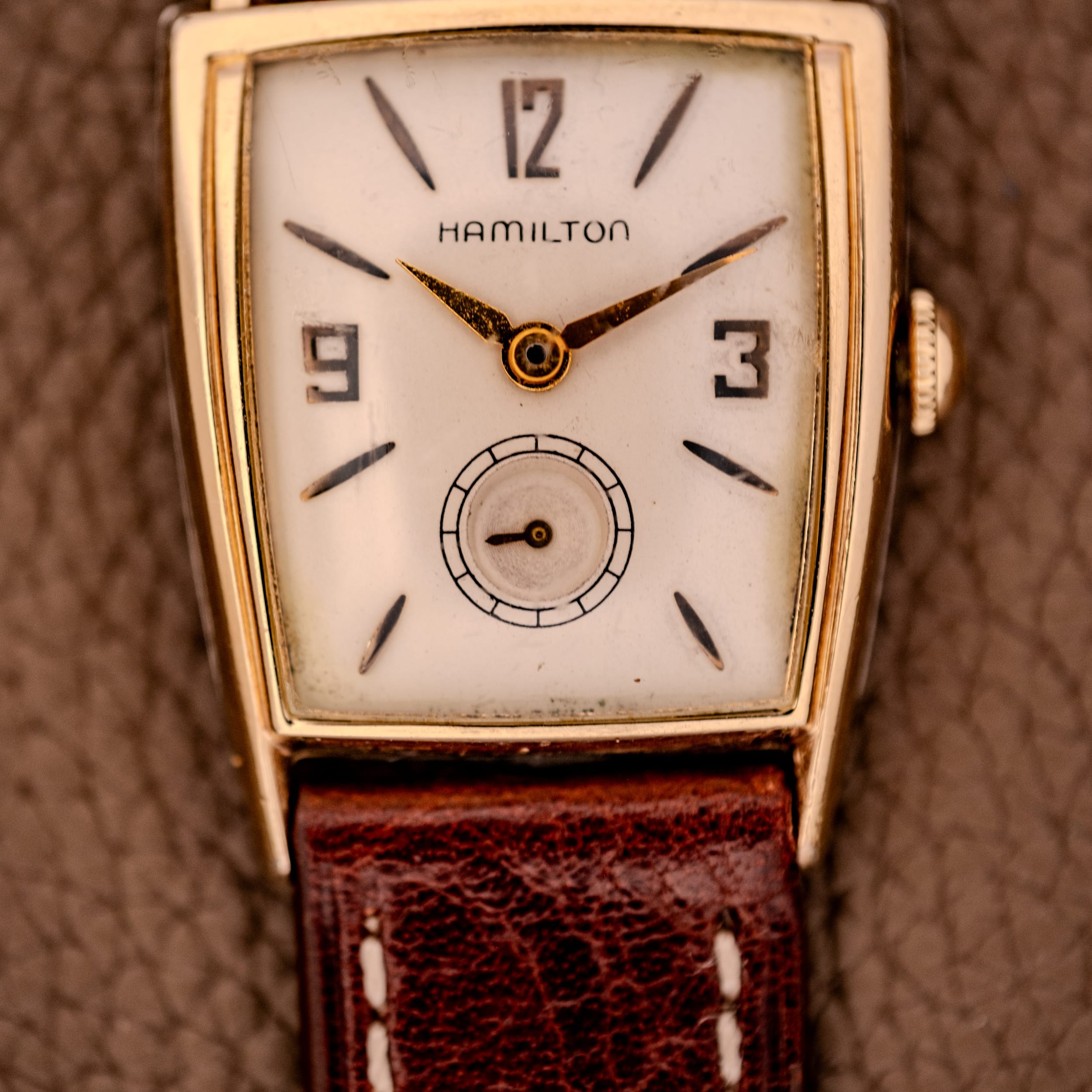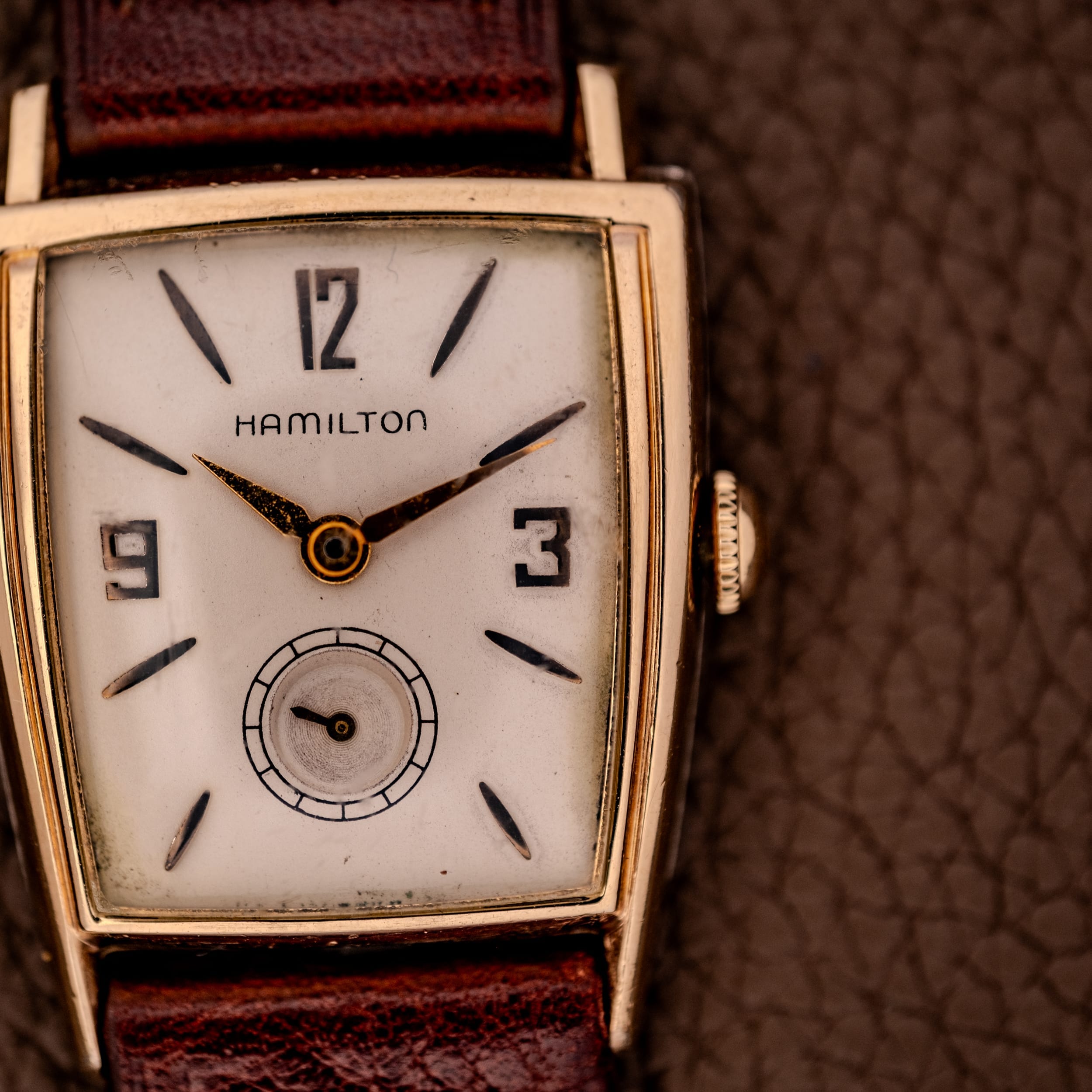 This particular example features the earlier dial variant with embossed numerals and markers, placing it in the 1958 to 1959 production window. The warm cream dial carries stylized Arabic numerals at 12, 3, and 9, rendered in a bold, slightly Art Deco-influenced typography that is quintessentially Hamilton. Sharp dagger indices mark the remaining hours, and a subsidiary seconds register at six o’clock adds classical depth to the layout. The Hamilton name is printed cleanly, and the original gold lance-shaped hour and minute hands show warm, honest patina that has mellowed beautifully. The dial itself shows gentle aging consistent with its nearly seven decades, with light marks and a creamy warmth that has developed over the years, lending it real character and authenticity.