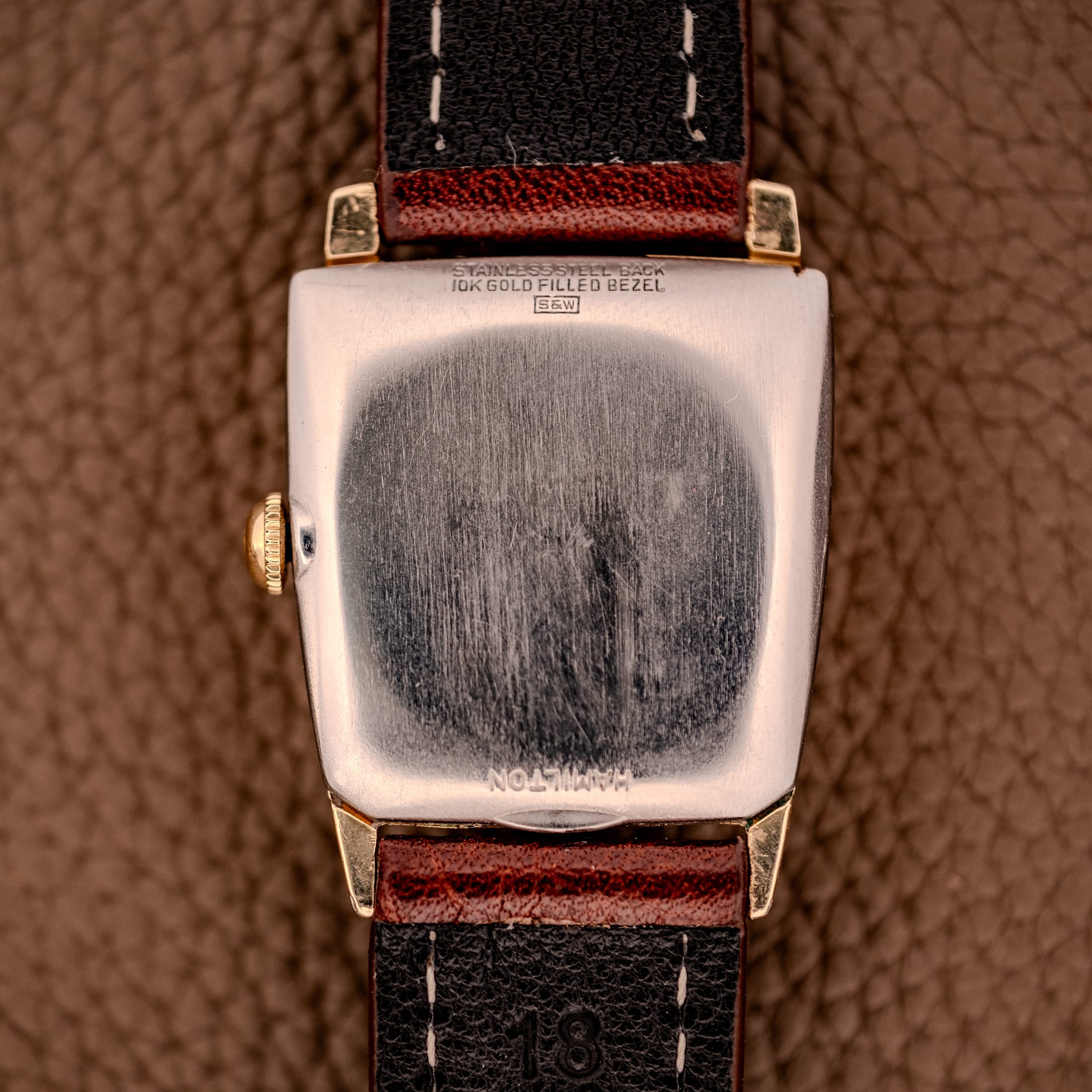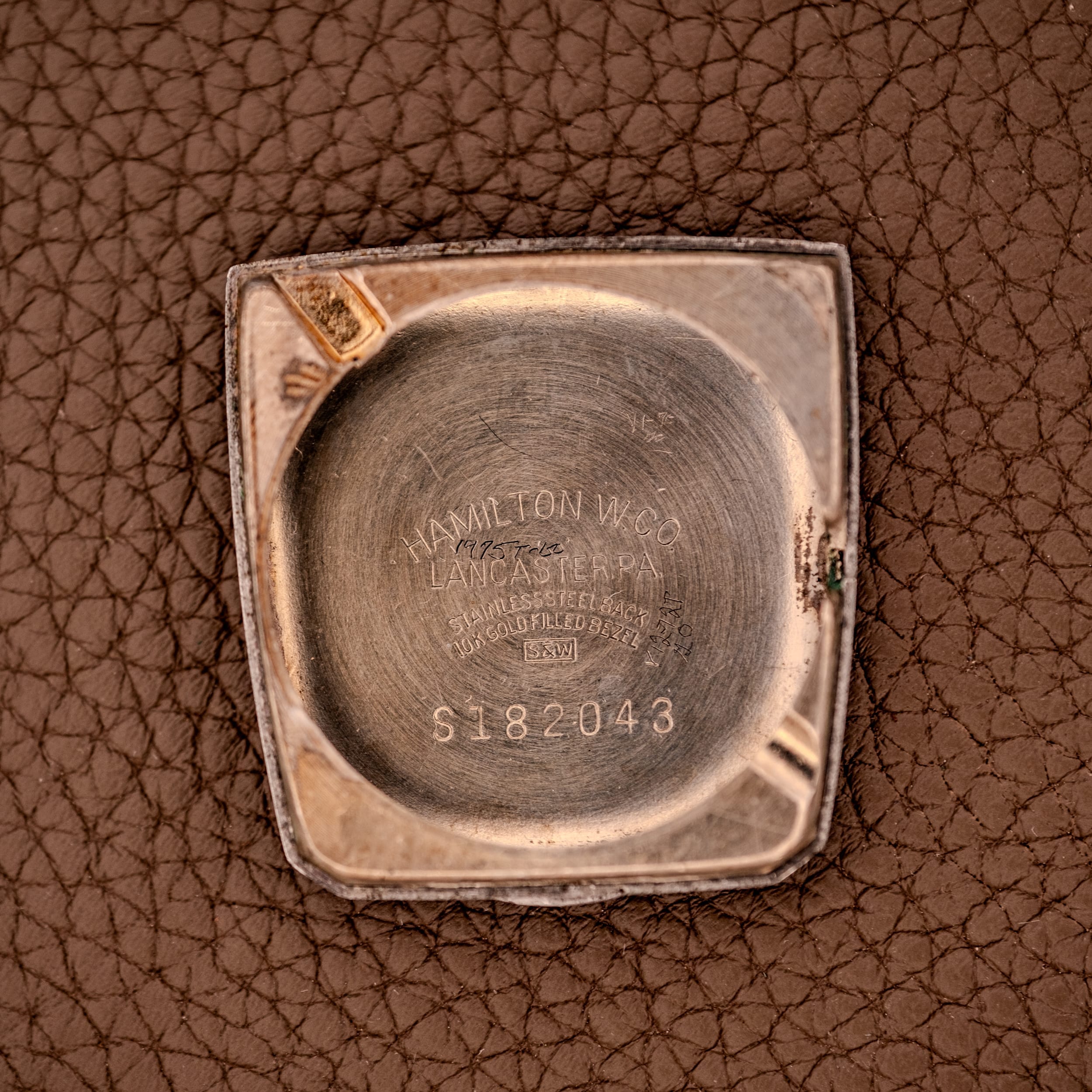 The Khyber’s keystone-shaped case is its defining feature. Wider at the top than at the bottom, it creates a trapezoidal silhouette that is both bold and surprisingly elegant. It’s the kind of design that could easily have tipped into gimmickry, but Hamilton’s proportions are so carefully considered that the result is instead a watch that feels architecturally purposeful, as if the case were designed around the idea of drawing the eye upward toward twelve o’clock. The 10K gold filled construction provides genuine warmth and weight, and the stainless steel caseback is stamped “Hamilton” and “Stainless Steel Back, 10K Gold Filled Bezel, S&W.” The inner caseback confirms the Lancaster, PA provenance with serial number S182043 and the S&W case manufacture.
