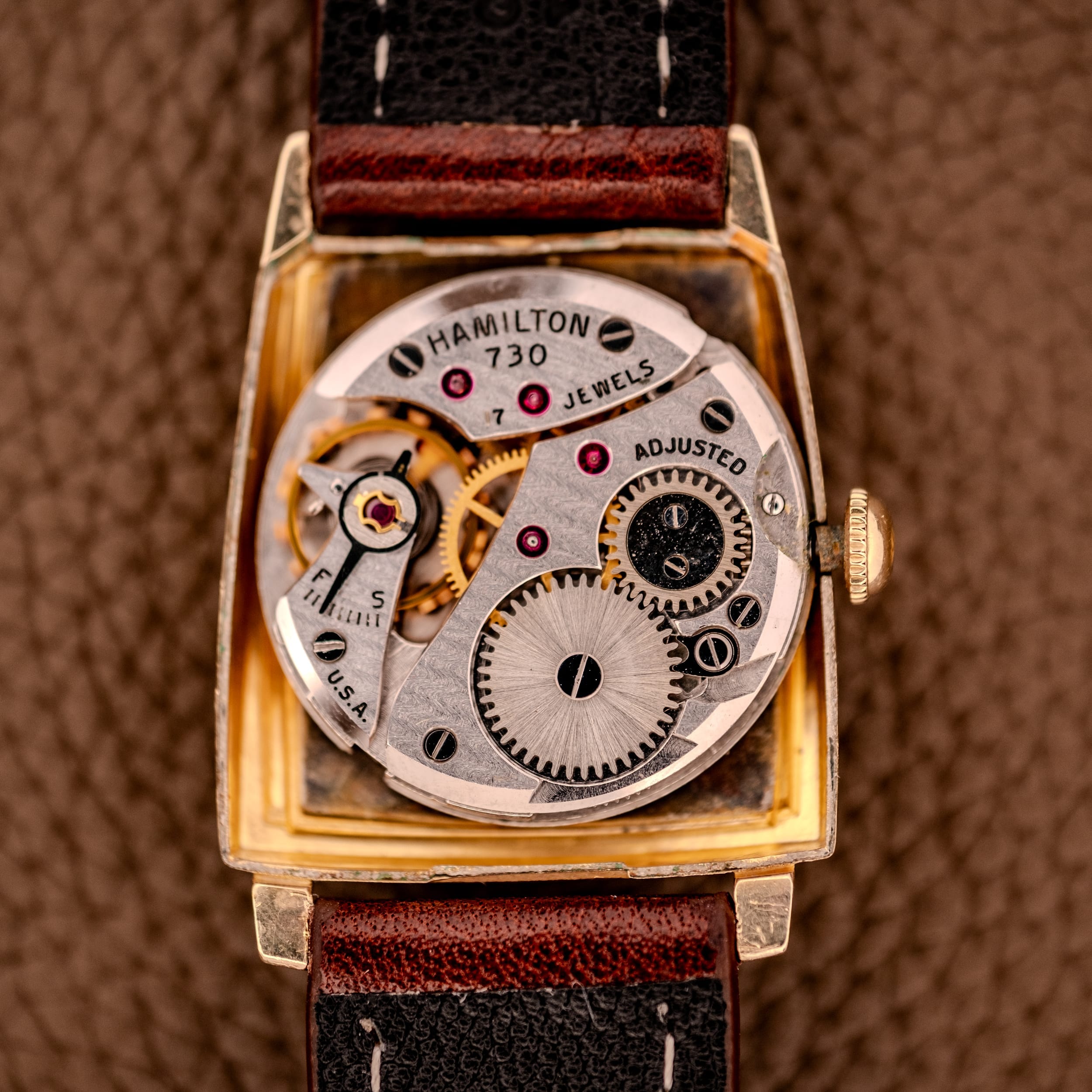 Powering the Khyber is Hamilton’s Caliber 730, a 17-jewel, American-made manual-wind movement. This is a proper Lancaster caliber, the 8/0 size movement that Hamilton deployed across many of their finest mid-century wristwatches. Engraved “Hamilton 730, 17 Jewels, Adjusted, U.S.A.,” it is a beautifully constructed movement with visible ruby jewels, Geneva striping on the bridges, and gilt gear train. The “Adjusted” designation indicates that this movement was regulated for positional accuracy, a mark of quality that Hamilton reserved for their better calibers. There is something deeply meaningful about a watch that still carries an American-made, American-adjusted movement inside its original American-designed case, and the Khyber delivers on that promise.