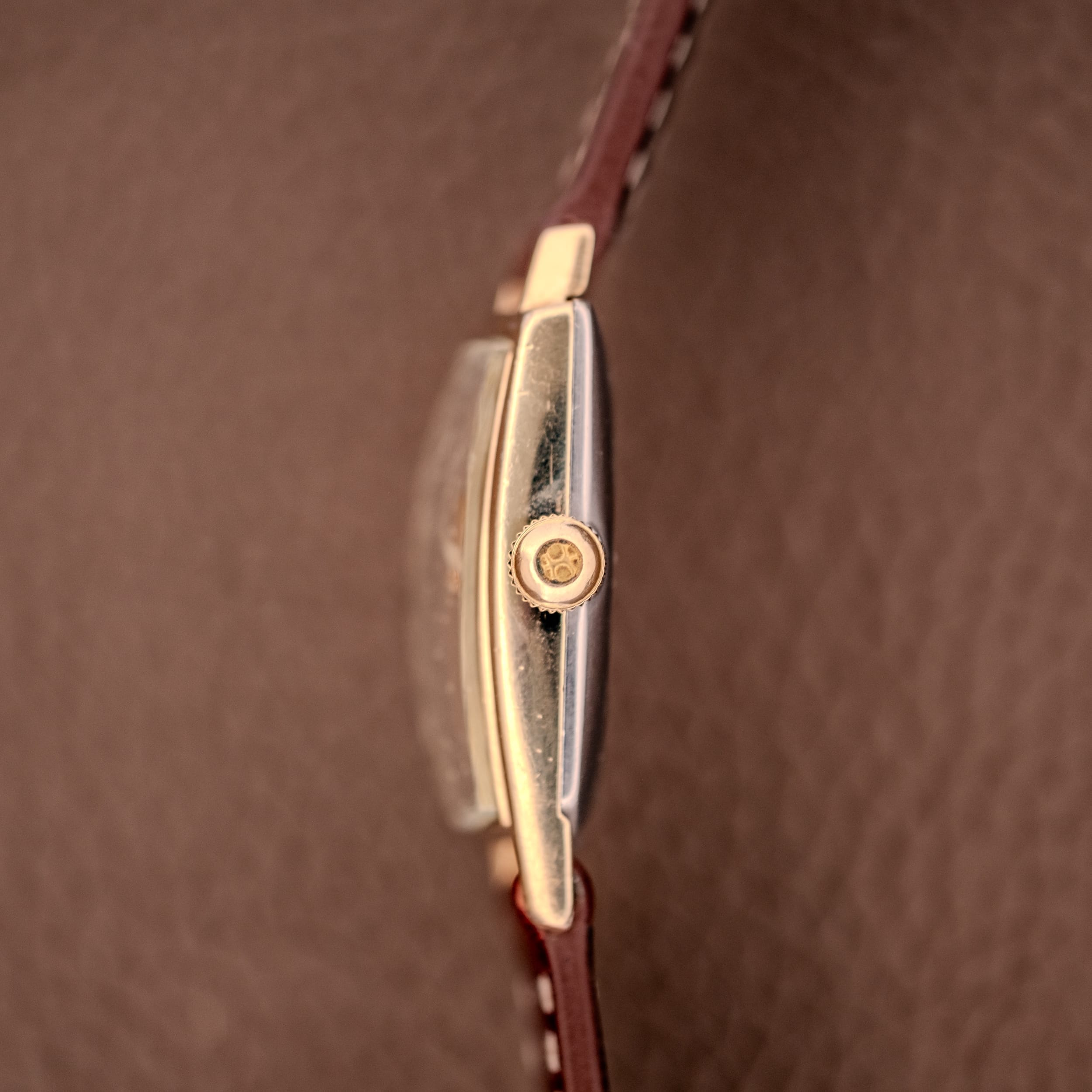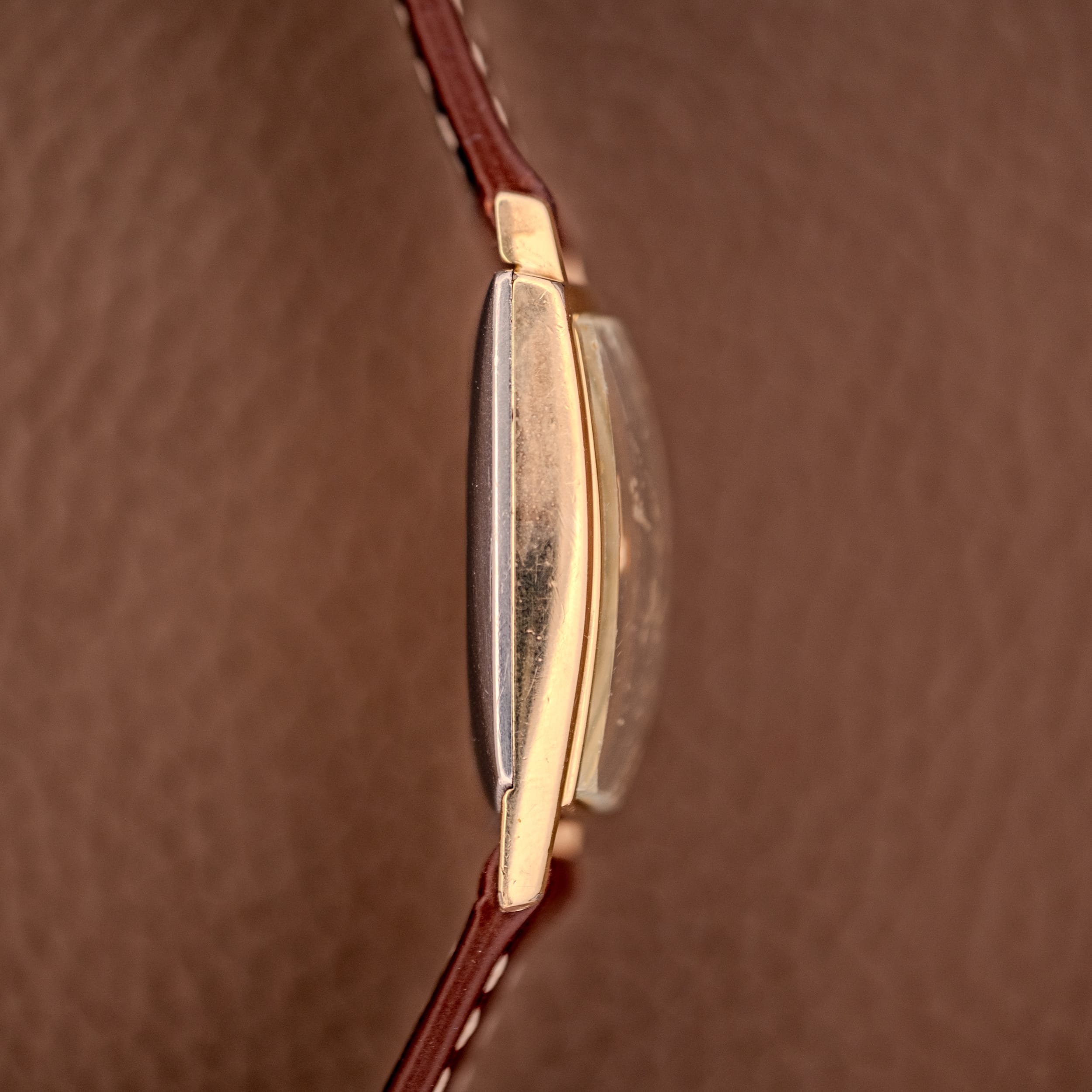 The 10K gold filled case is in good condition, with the broad “shoulders” at twelve retaining their sharp angular lines and the tapering sides flowing smoothly toward the narrower base at six. The profile shots reveal a slim, refined case that sits close to the wrist despite its visual presence. There is honest surface wear throughout, consistent with a watch that was worn and enjoyed as intended.