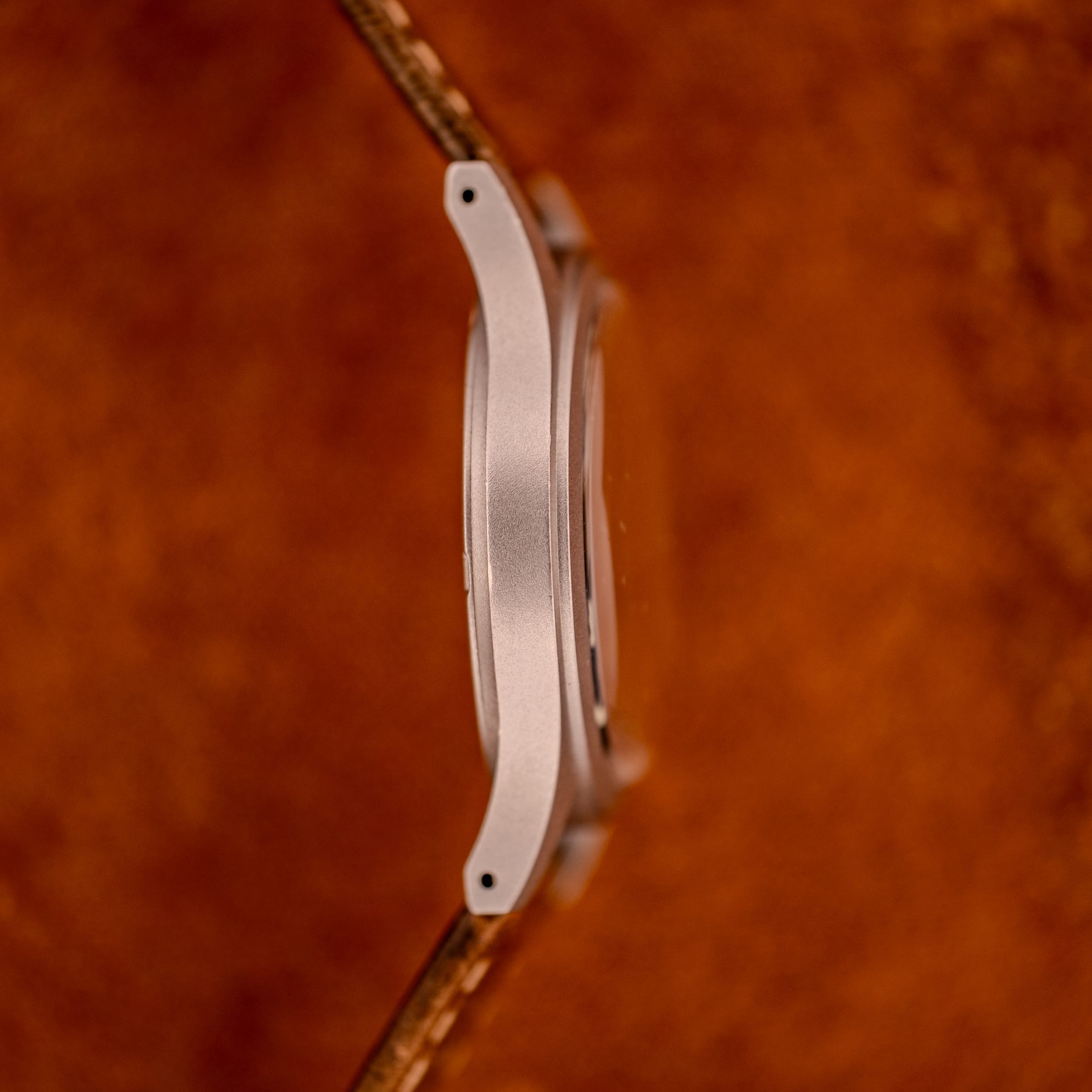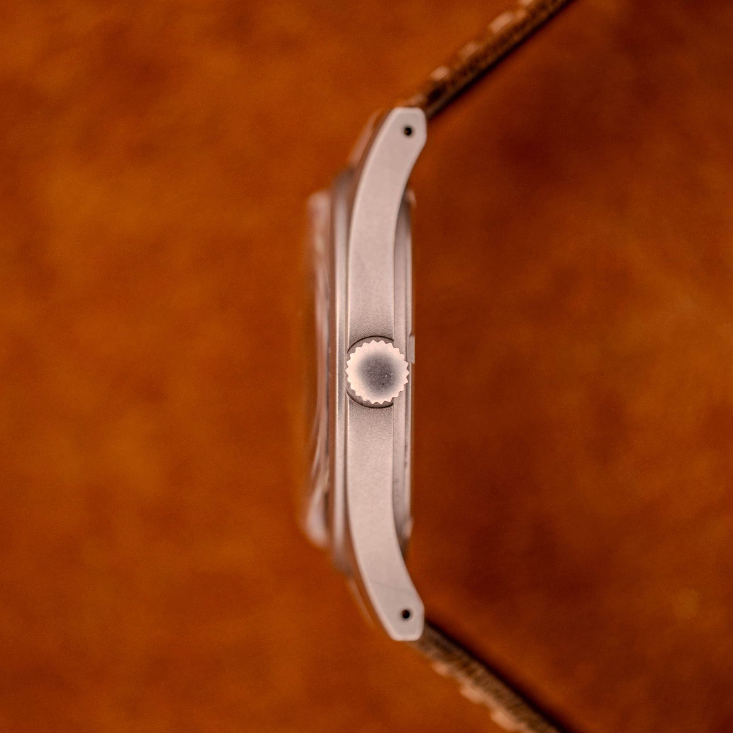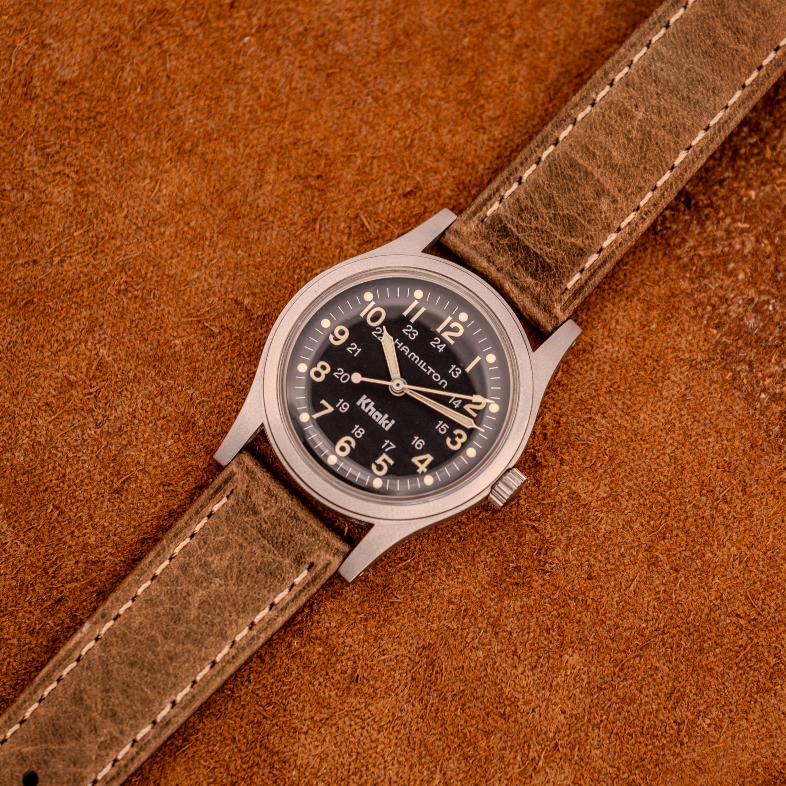 The stainless steel case measures approximately 33mm across, which may sound modest by today’s standards, but it is identical in size to the original military-issue watches from the Vietnam era through the early 1990s. The bead-blasted, matte finish eliminates all reflections, a deliberate design choice carried over from military specification to prevent the enemy from spotting a glint of light on a soldier’s wrist. It gives the case a utilitarian, almost parkerized appearance that is absolutely integral to the Khaki’s character. The profile is slim and elegant at roughly 9mm thick, with a domed acrylic crystal that adds a subtle curve to the face and eliminates the harsh reflections that plague many modern mineral and sapphire crystals. The caseback is engraved “9415A © Hamilton, Stainless Steel, Water Resistant, 3 ATM,” and the drilled lugs accept an 18mm strap. Paired here with a distressed brown leather strap, the watch looks every bit the seasoned field companion it was designed to be.