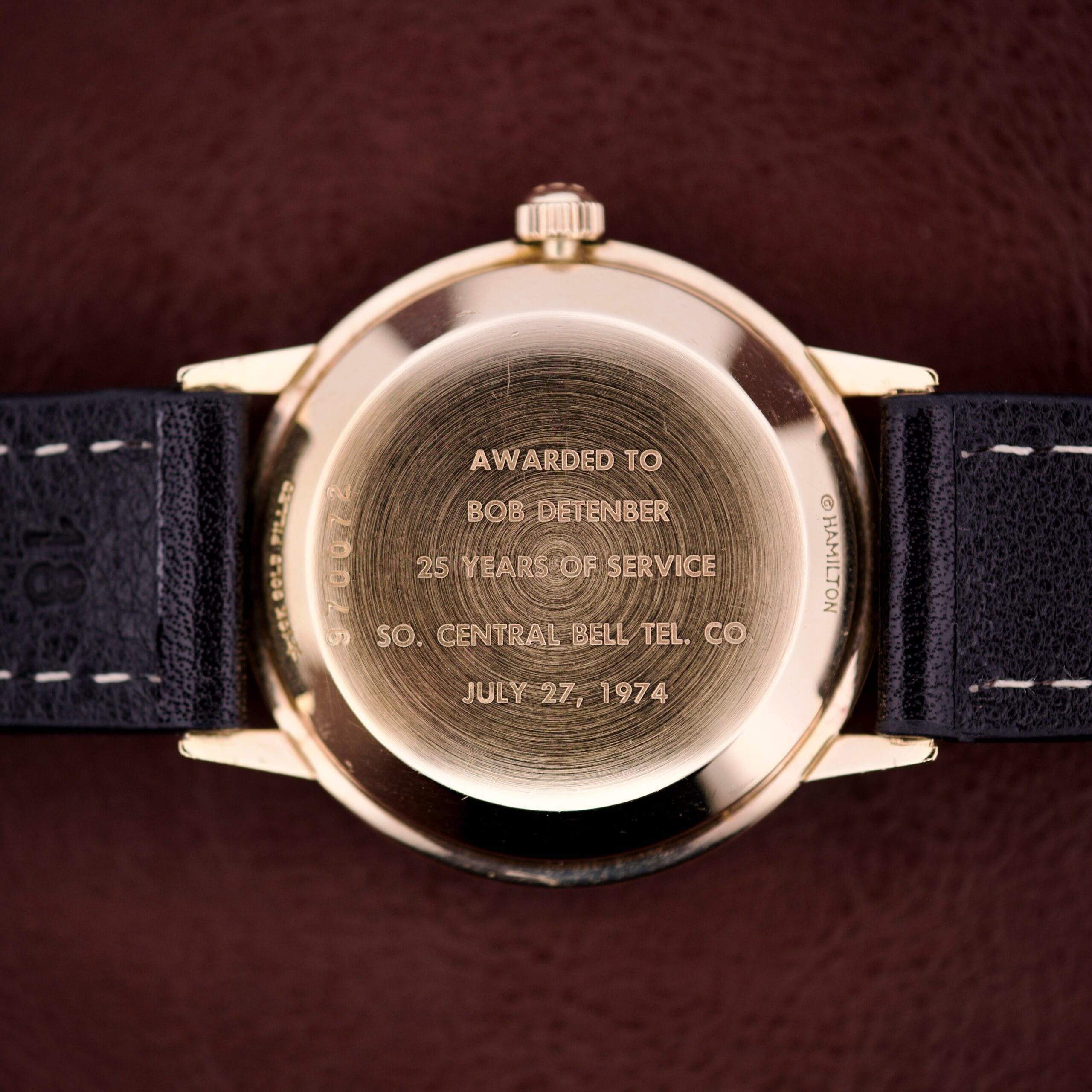 The true charm of this watch, however, lies in its provenance. The caseback bears a crisp, deep inscription: “Awarded to Bob Detenber, 25 Years of Service, So. Central Bell Tel. Co., July 27, 1974”. This is not just a watch, it is a memento of a quarter-century career at the Southern Central Bell Telephone Company, a tangible piece of personal and industrial history. The case remains in sharp condition, with the hallmark “H” signed crown still present. The dial is remarkably clean, suggesting that Bob Detenber likely saved this watch for special occasions rather than wearing it daily.