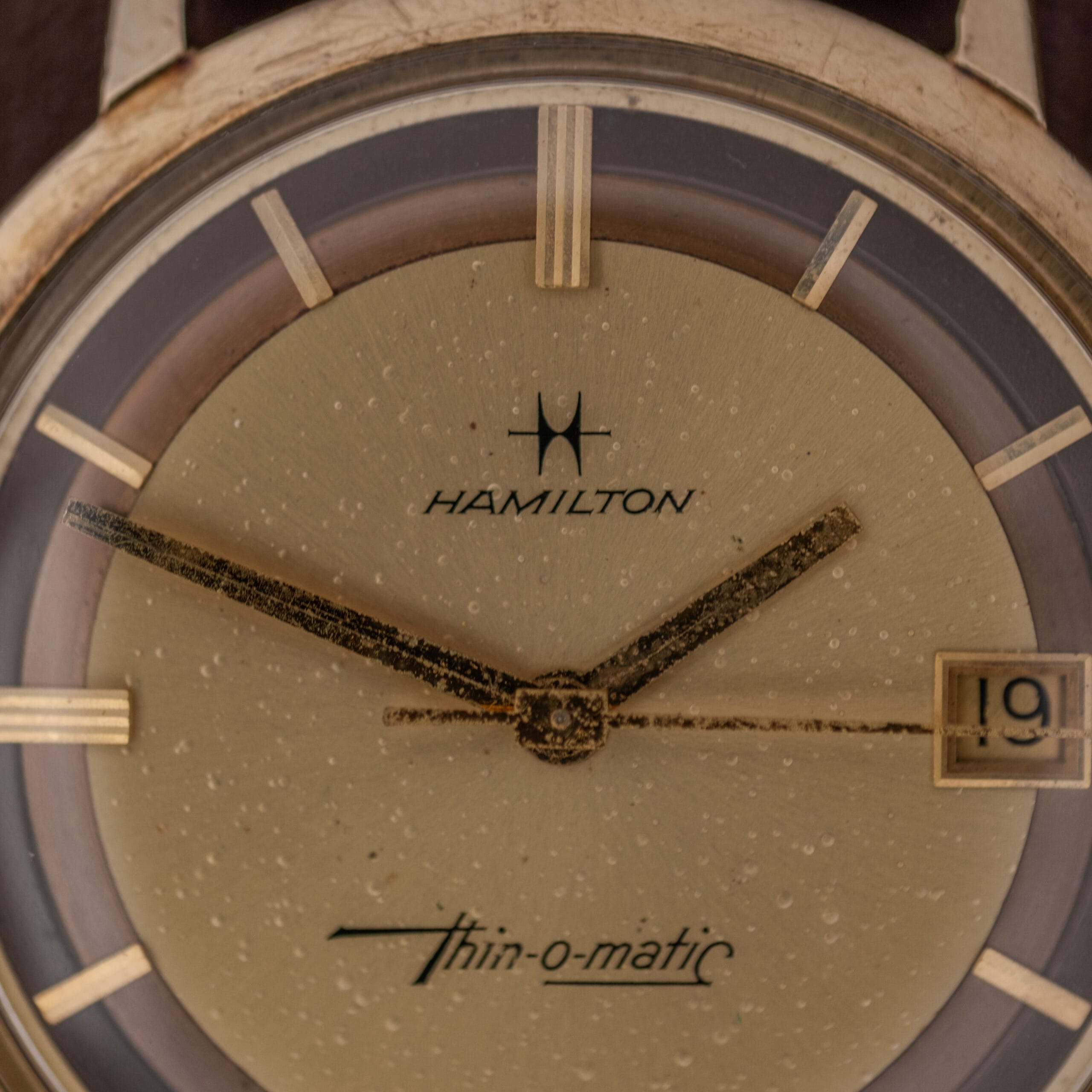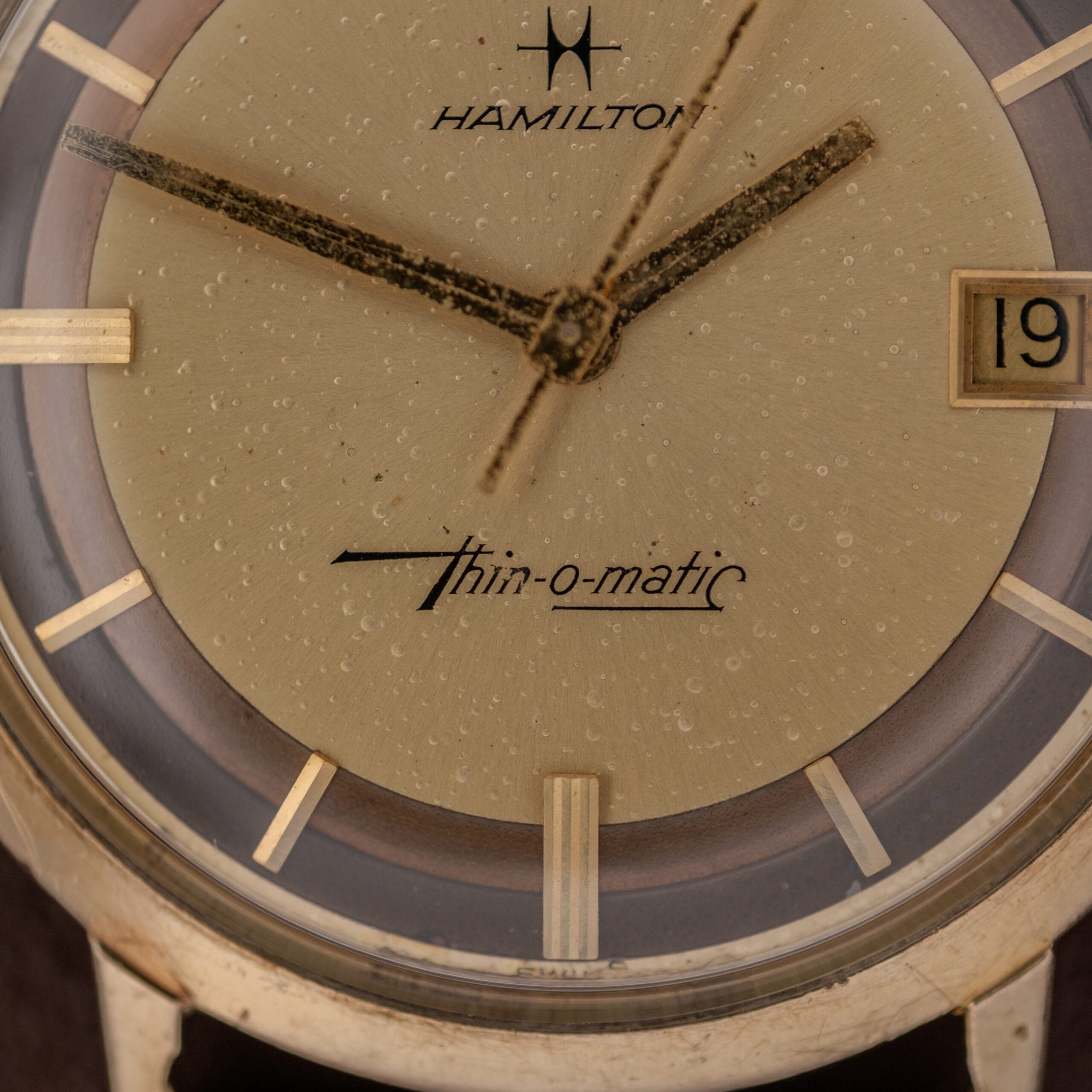 The design language of the Thin-O-Matic speaks fluently in the idiom of 1960s American elegance. This particular example features one of the more visually compelling dial configurations: a two-tone layout with a warm champagne gold center and a smoky charcoal grey outer chapter ring. The effect is striking, almost architectural, creating a sense of depth and contrast that gives the watch far more visual presence than its slim proportions might suggest. The applied gold double-bar stick indices bridge the two zones beautifully, and the “Thin-o-matic” script rendered in Hamilton’s signature cursive at 6 o’clock is a lovely period touch. A framed date aperture at 3 o’clock adds everyday functionality without disrupting the dial’s balance. The Hamilton star logo and brand name sit cleanly at 12, and the original gold lance-style handset ties the whole composition together.