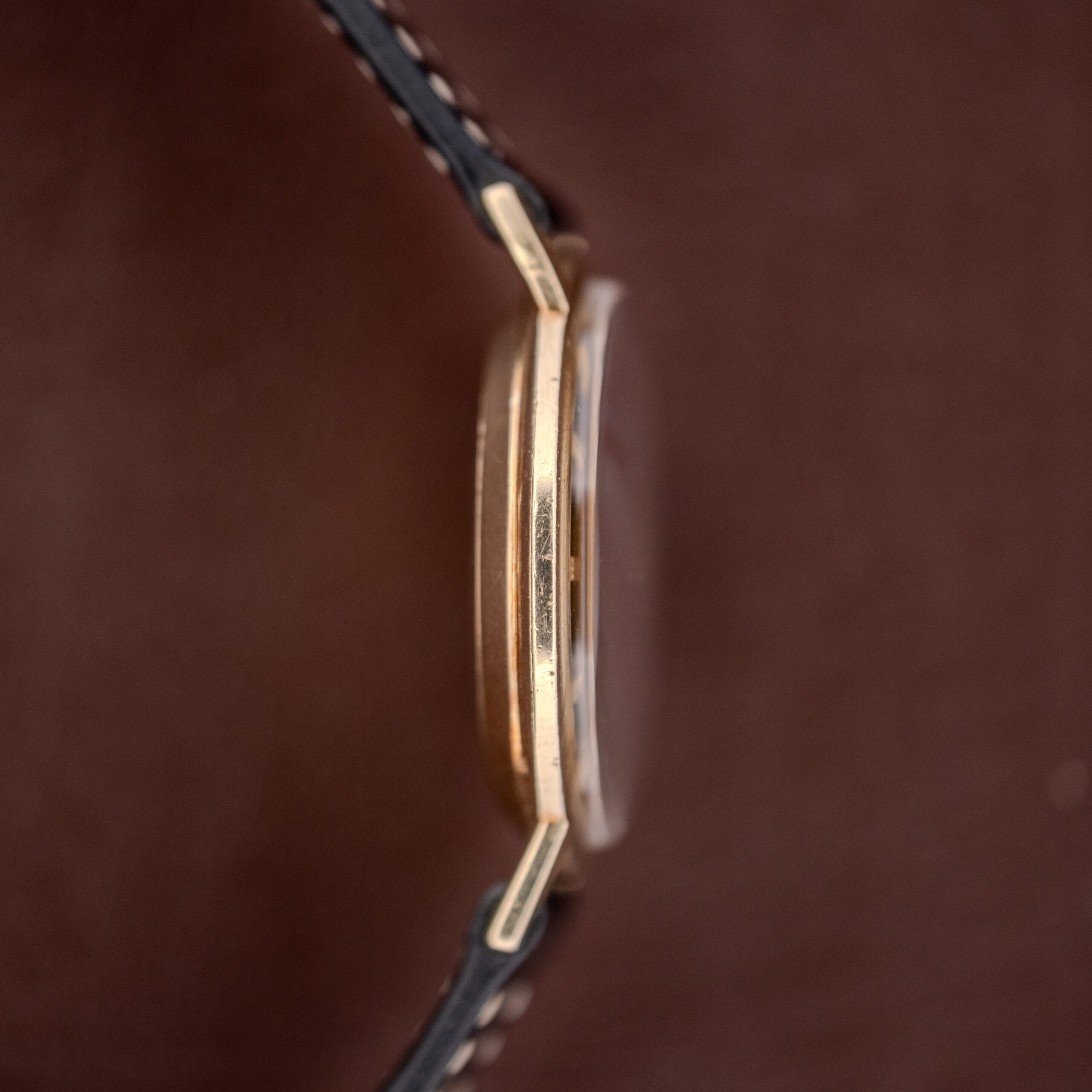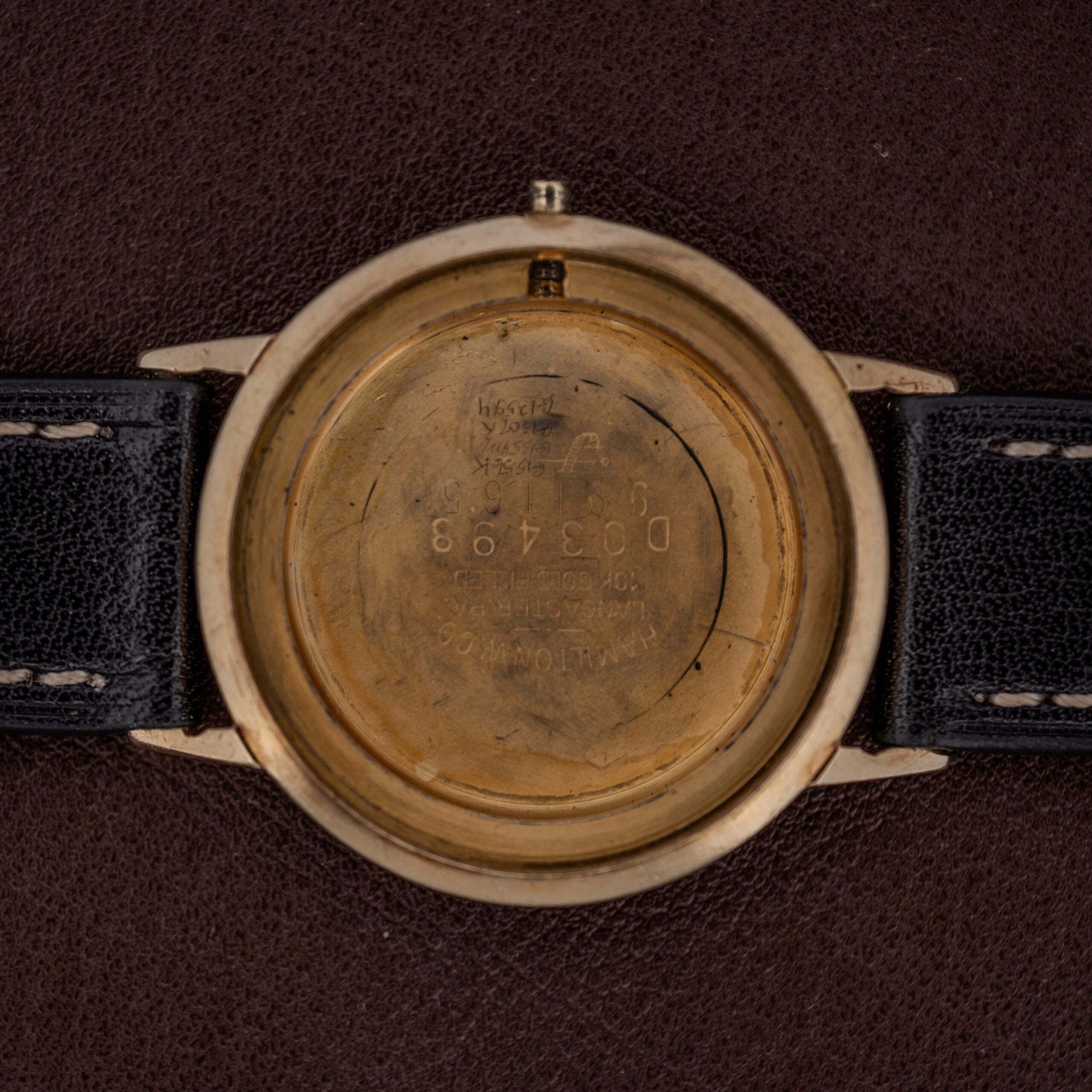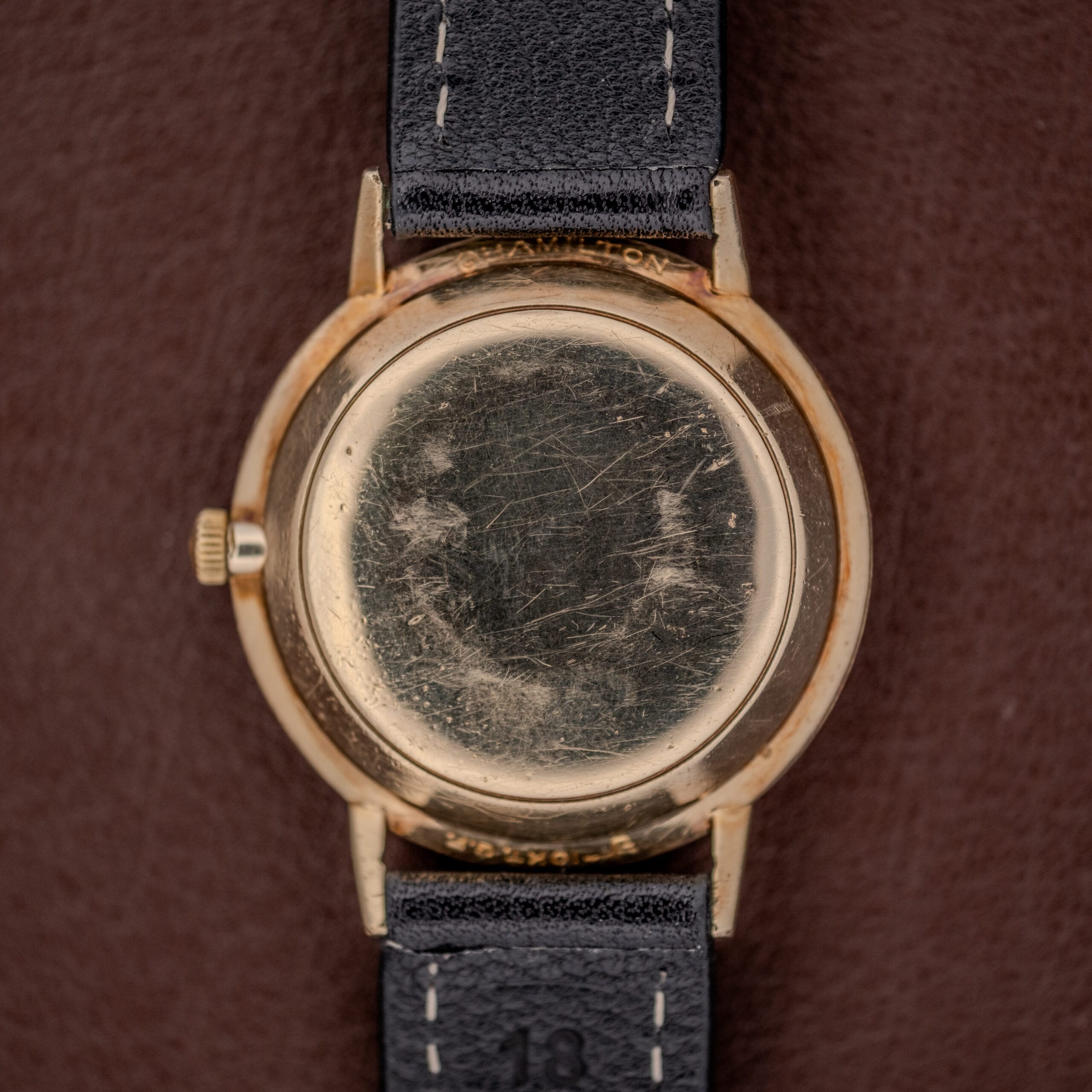 This particular example, housed in a 10K gold-filled case stamped with Hamilton’s Lancaster, Pennsylvania address, shows the kind of honest, lived-in character that tells you this watch was genuinely cherished. The gold fill retains a warm luster on the top surfaces, with some expected wear and thinning visible on the lug edges and sides, which is par for the course on a gold-filled case of this vintage. The case profile reveals just how remarkably thin this watch is, a testament to the micro-rotor engineering underneath. The caseback carries light scratching and the original Hamilton stampings remain legible. The dial, upon close inspection, shows some fine spotting across the champagne center, a sign of moisture exposure at some point in its life, which in our view adds a textural quality rather than detracting from the overall presentation. The handset shows some patina and oxidation consistent with its age. Pop the caseback off and the Caliber 624 is revealed with its signed Hamilton rotor, côtes de Genève finishing, and gilt lettering, all in presentable condition.
