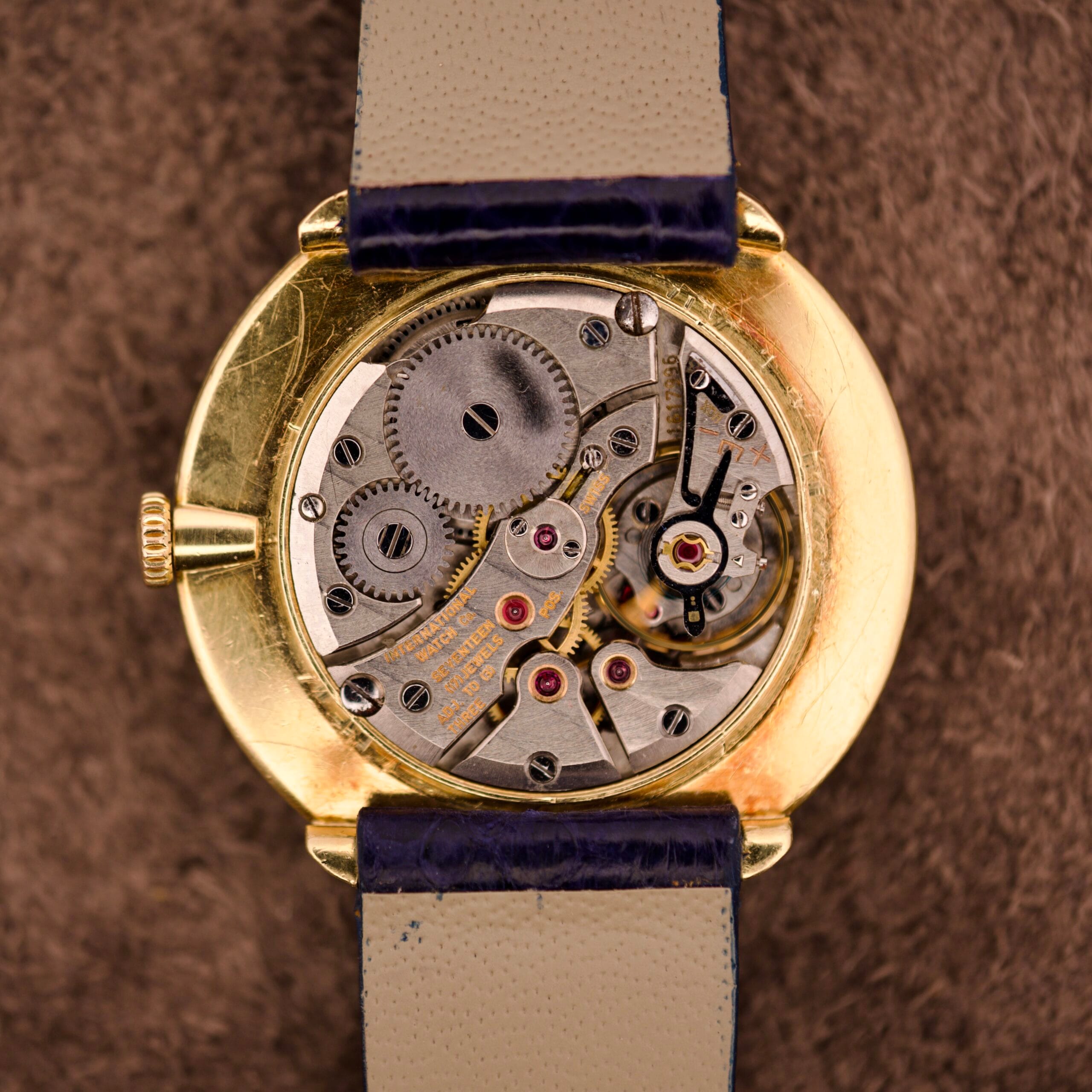 And what a dial it is. The original silver sunburst finish has aged with an honest and compelling character. It has developed a light, scattered “stardust” patina across its surface, giving it a unique personality that no modern watch can replicate. The simple, applied gold indices and slim stick hands are pristine, offering perfect legibility and a touch of warmth against the silvered face.