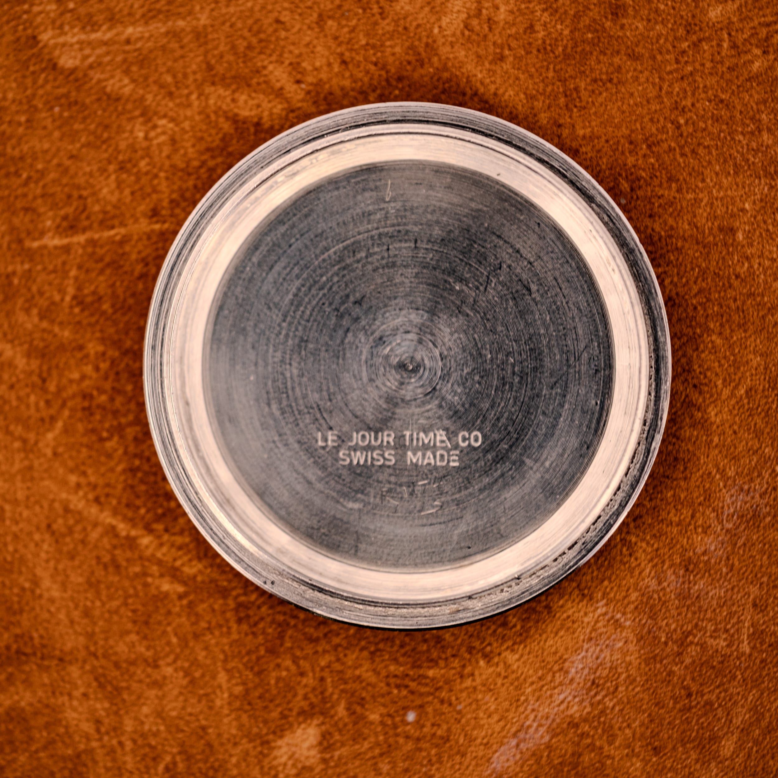 At the heart of the Triton beats the Landeron caliber 248, a hand-wound chronograph movement that belongs to one of the most successful families of chronograph ébauches ever produced. Landeron, founded in 1873, made its most enduring contribution to watchmaking with the invention of the cam-operated chronograph just before the Second World War, a mechanism that dramatically lowered the cost of producing chronograph watches and put complicated timekeeping within reach of ordinary people for the first time. The original cal. 48 was carefully refined over the decades into the 148 and finally the 248, with more than three million movements produced across the family. The 248, with 17 jewels beating at 18,000 vibrations per hour and a 42-hour power reserve, is the mature expression of that lineage. Our movement photograph shows the cam-lever mechanism clearly, along with the Incabloc shock protection system and the characteristically clean, no-nonsense Landeron architecture. The inside of the caseback is stamped “LE JOUR TIME CO / SWISS MADE.”