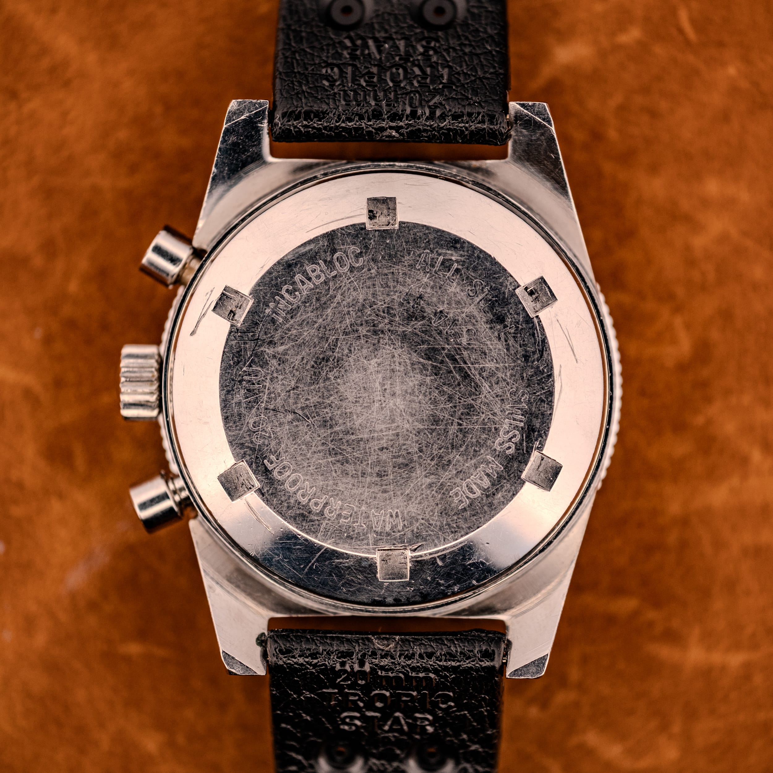 The stainless steel case measures approximately 38mm and wears with the kind of thick, substantial presence that defines the best skin-diver chronographs of the period. The black rotating dive bezel retains its original insert with white minute markings, showing honest fading and wear that only add to its character. Round pump chronograph pushers sit at 2 and 4 o’clock, flanking the crown, and the screw-down caseback is stamped “ALL ST.” (all stainless), “INCABLOC,” “SWISS MADE,” and “WATERPROOF.” The case profile, visible in the side photographs, reveals the satisfying thickness of a watch built to go underwater, with chunky lugs that give the Triton an assertive stance on the wrist.