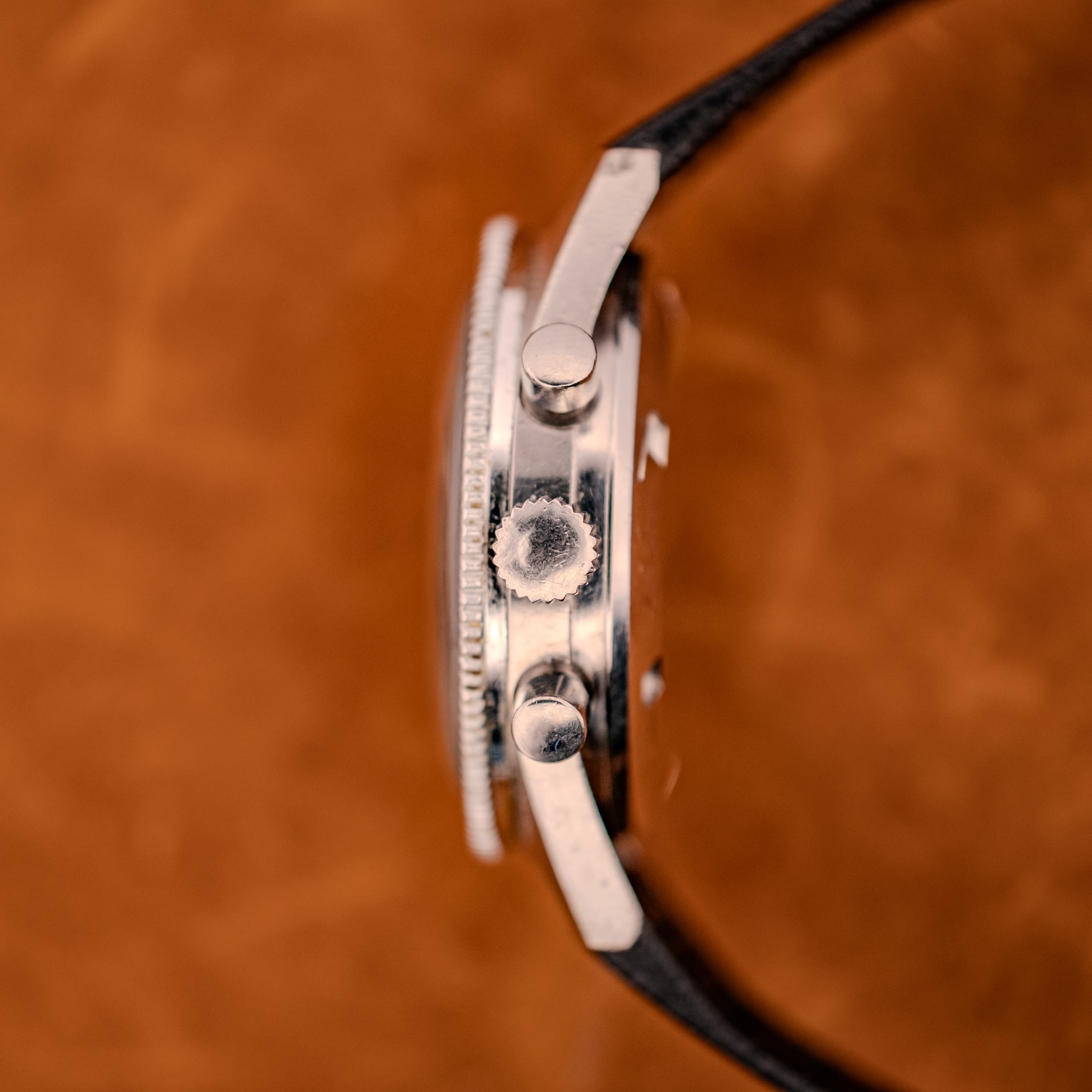 For the collector who appreciates the romance of the 1960s dive chronograph but prefers to chart a course outside the usual Heuer and Breitling territory, the Le Jour Triton offers everything that makes the genre so compelling: a purposeful case, a proven hand-wound chronograph caliber, a reverse panda dial with genuine character, and the kind of honest, lived-in condition that simply cannot be faked. This is a tool watch that looks like it has actually been used as one, and it is all the better for it. Presented on a period-correct Tropic Star rubber strap.