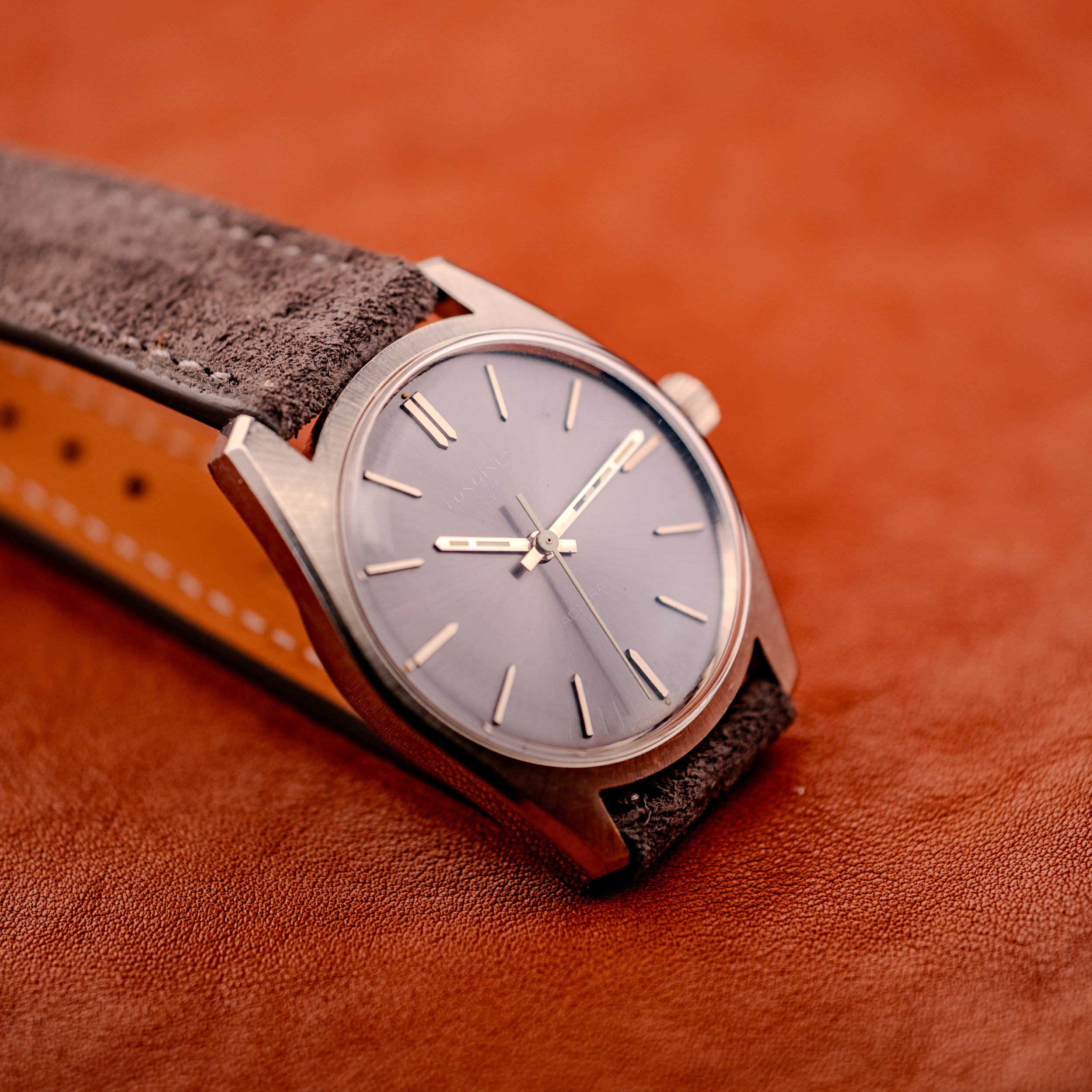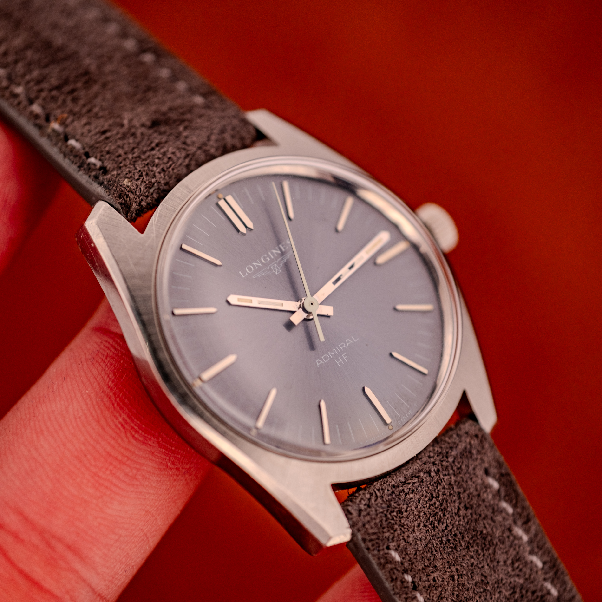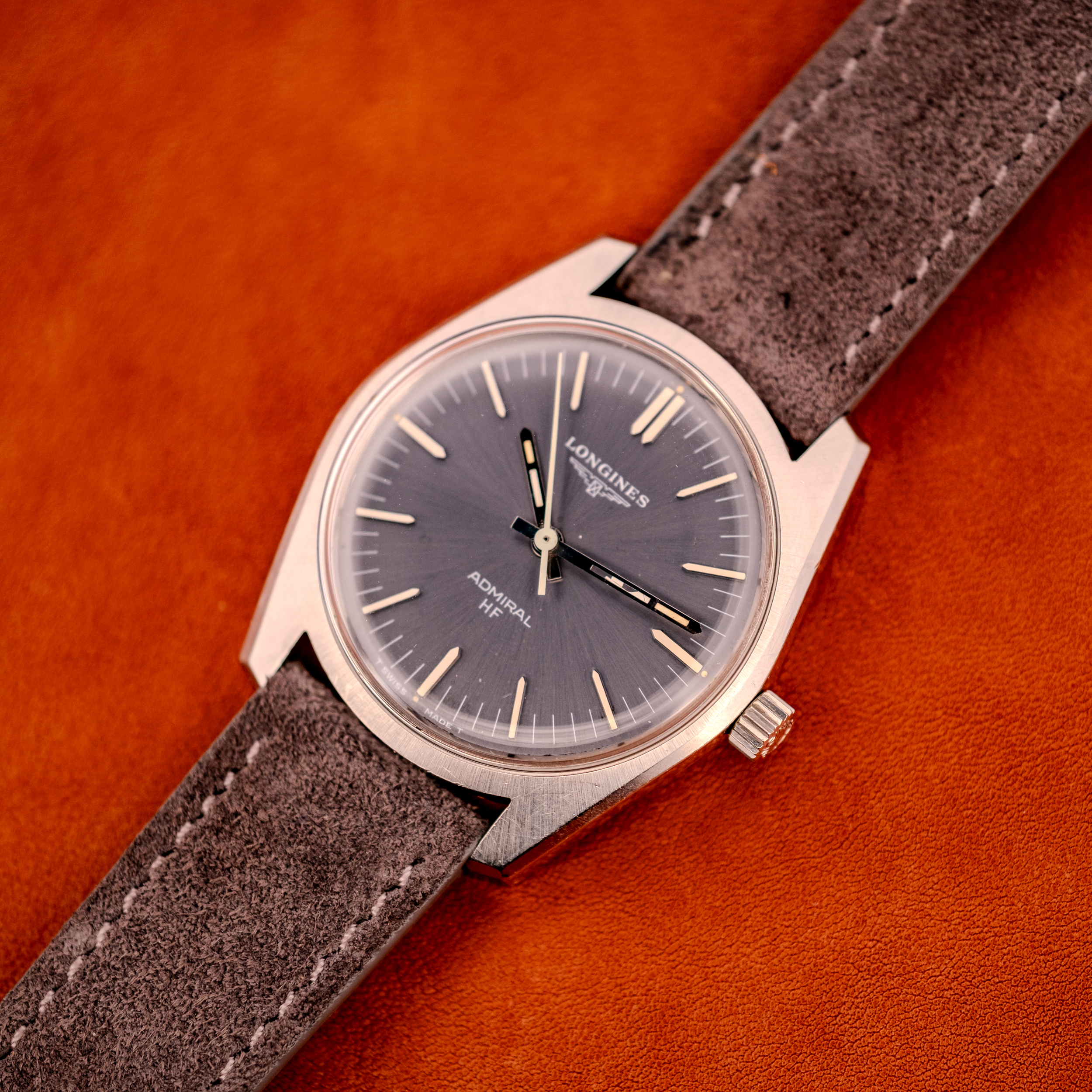 We are presenting this piece on a dark grey suede strap that complements the anthracite dial perfectly. For the collector who appreciates mechanical innovation delivered without fanfare, the Admiral HF is a compelling proposition. The high-frequency movement with its zero-reset hacking seconds puts genuine horological substance behind a watch that already has one of the most captivating dial colors of its era. It is the kind of Longines that reminds you why the brand held a place alongside Omega and Rolex for most of the twentieth century, and why collectors who know their history keep coming back to it.