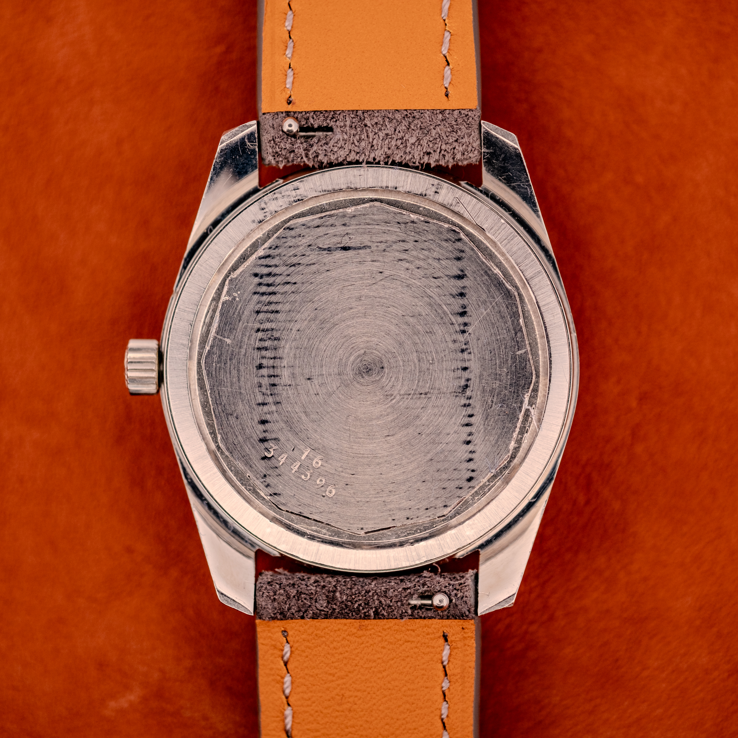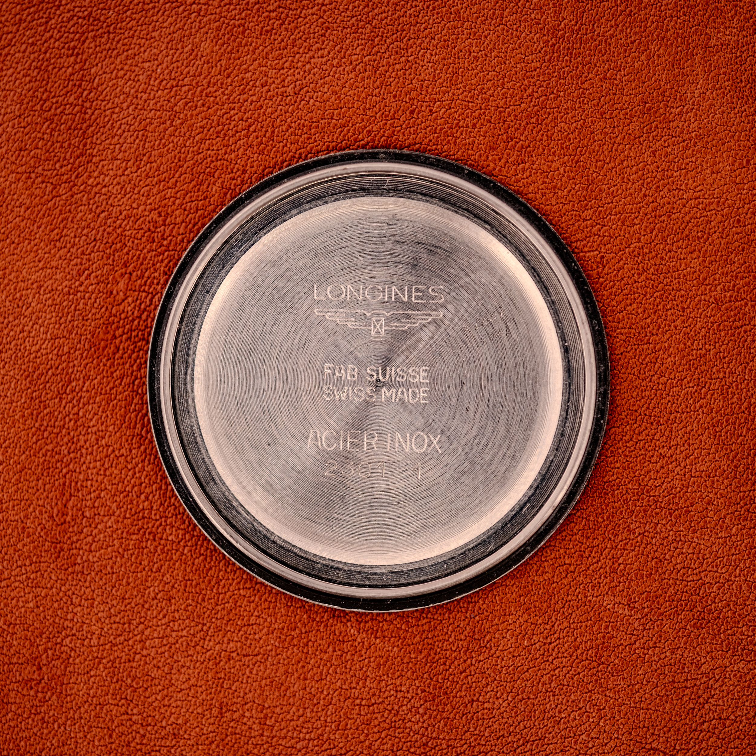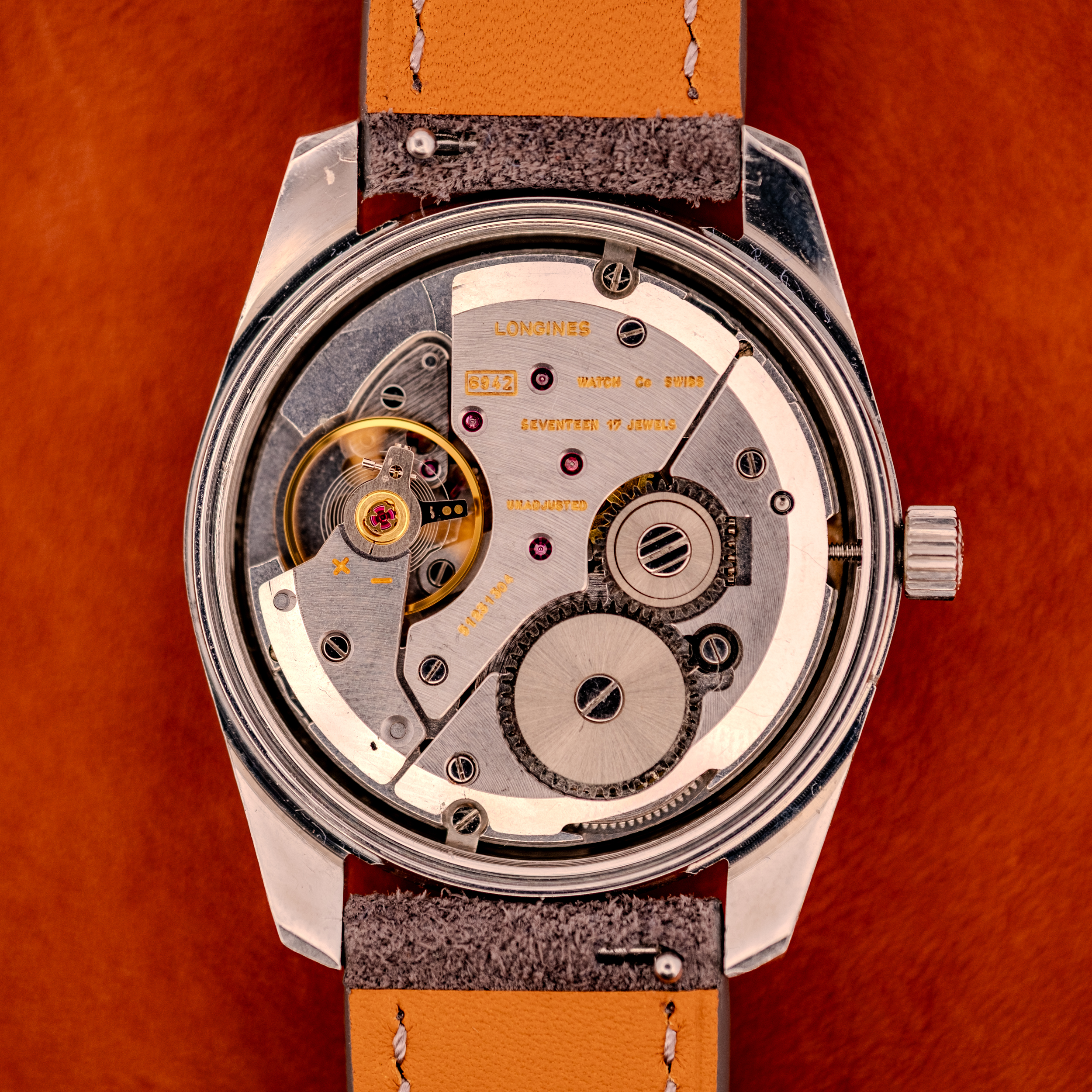 The 6942 is the no-date variant of this high-frequency platform; the 6952 is its date-equipped counterpart. The movement is marked “Longines Watch Co, Swiss, 6942, Seventeen 17 Jewels, Unadjusted,” confirming the US market designation. Longines was one of the few Swiss manufacturers still producing fully in-house movements during this period, and the 6942 is a fine example of that capability, with clean finishing and a layout that reflects the brand’s centuries of movement-making expertise. The inner caseback is stamped “Longines, Fab Suisse, Swiss Made, Acier Inox, 2301.” Case serial numbers 16 and 344396 are visible on the outer caseback.