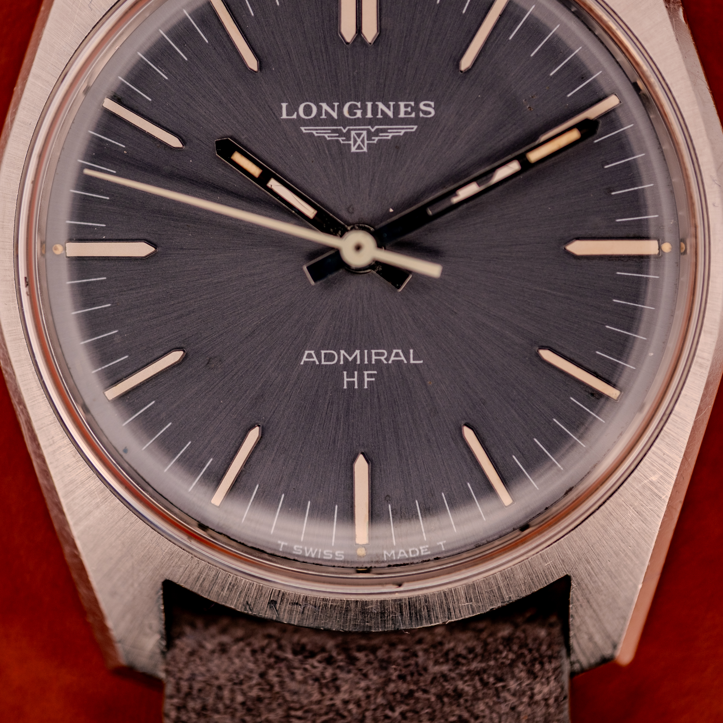 This particular example is in outstanding condition. The anthracite grey sunburst dial is the star of the show, and it is absolutely mesmerizing. Depending on the lighting angle, the dial shifts between a deep charcoal grey and a steely blue, never quite settling on one color. The applied silver stick markers are crisp and fully intact, with a double marker at 12 o’clock adding subtle visual weight. The “Longines” name and winged hourglass logo sit cleanly at the upper portion of the dial, with “Admiral HF” printed below center. The “T Swiss Made T” at 6 o’clock confirms tritium. The blackened hour and minute hands feature luminous fills that have aged to a warm, creamy tone that contrasts beautifully against the dark dial surface. The slim seconds hand is clean and original.