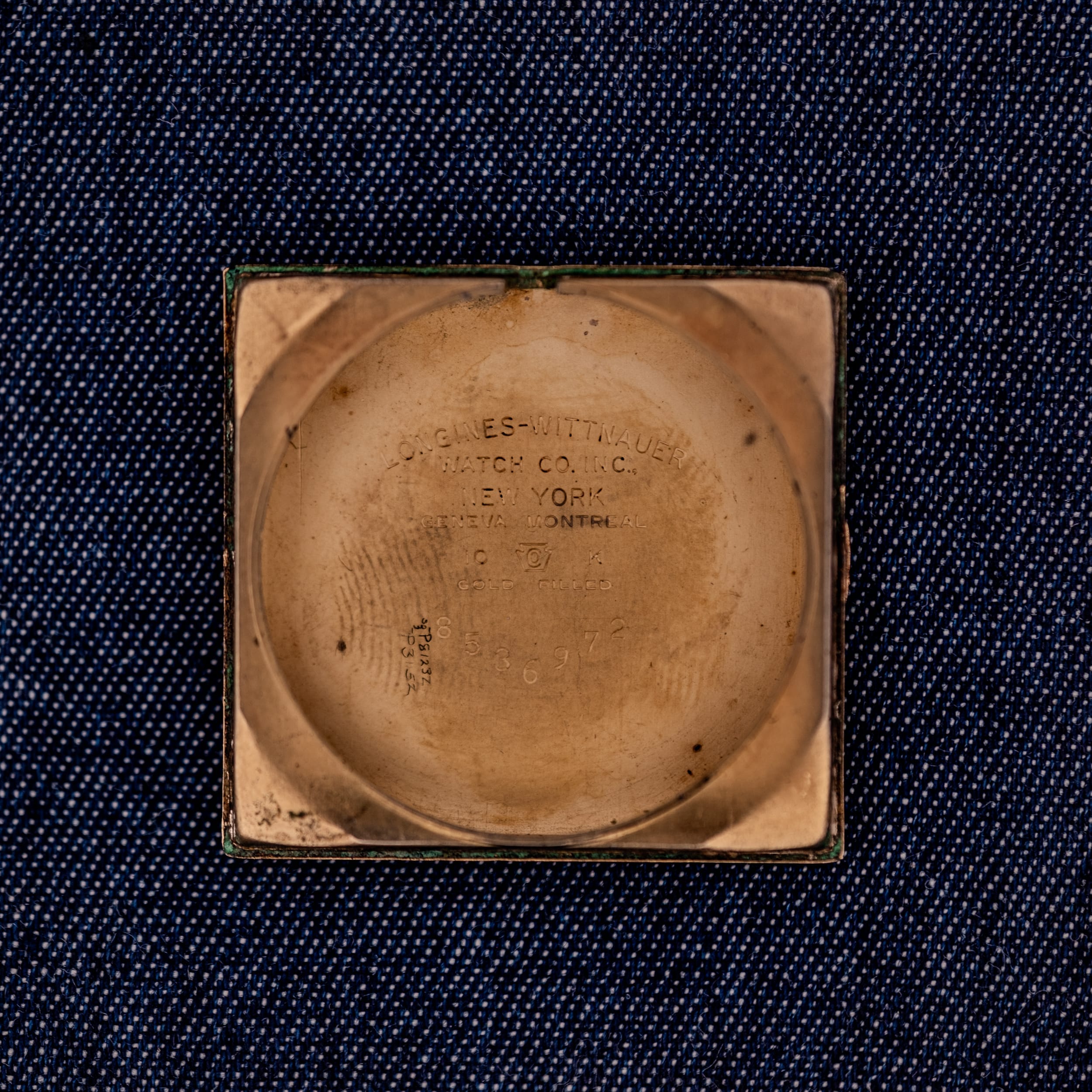 Condition-wise, this watch tells the story of a life well-lived. The dial carries the kind of honest, gentle patina that collectors prize, with some subtle spotting and warm toning that has only deepened the character of that waffle texture over the decades. The gold filled case shows normal wear for its age with surface marks along the flanks and caseback, but the overall structure remains strong, with the lugs retaining their sharp, faceted edges. The caseback interior is stamped by the Longines-Wittnauer Watch Co. Inc., New York, Geneva, Montreal, confirming its American-market provenance.
