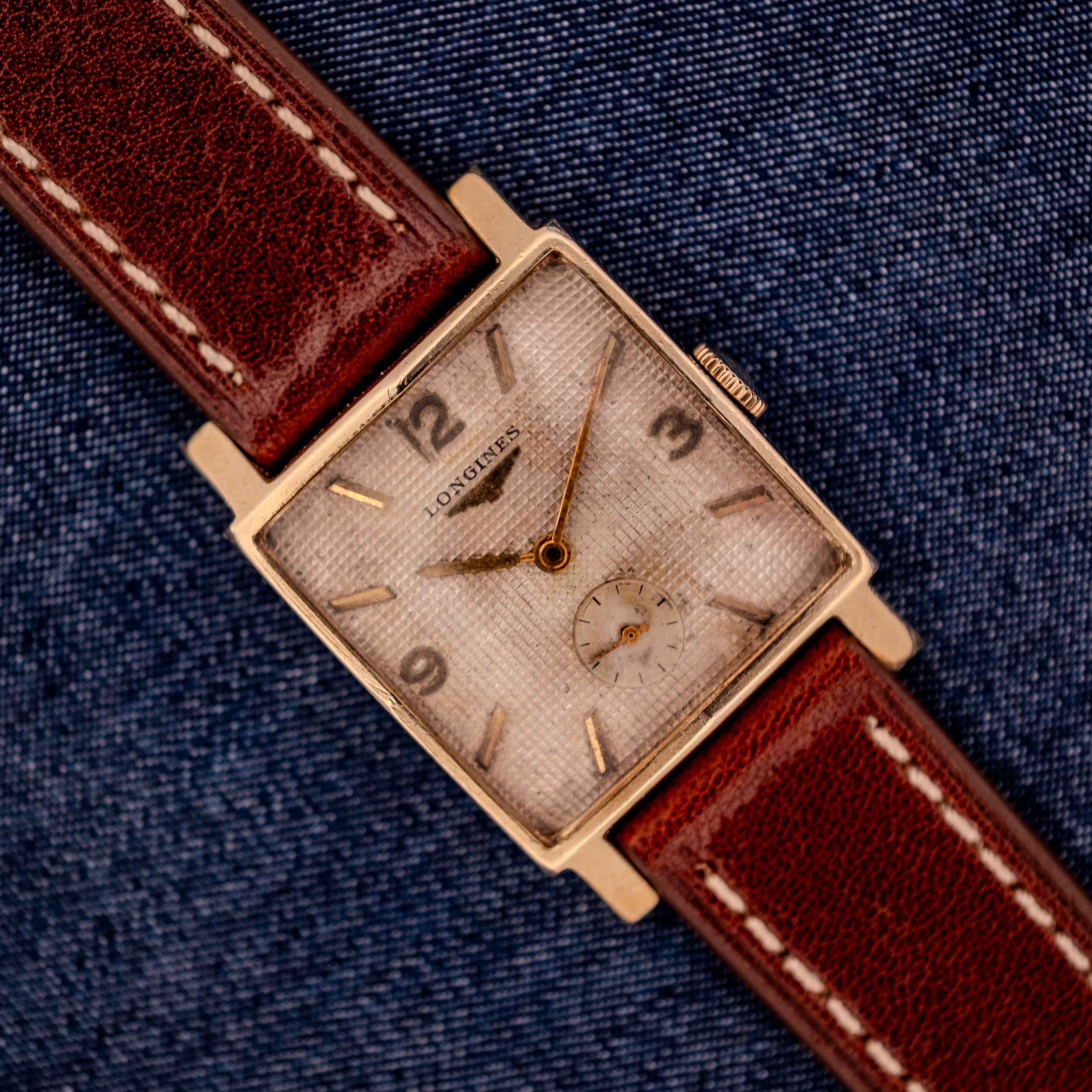 For collectors who appreciate the quiet confidence of a square dress watch with real horological substance, this Longines is a fantastic find. It’s the kind of piece that pairs effortlessly with a sport coat and an old fashioned, or adds a touch of mid-century refinement to everyday wear. Presented here on a rich brown leather strap with white contrast stitching, it’s ready to wear and enjoy. In a market where vintage Longines remains one of the most compelling value propositions in all of horology, a square case with a waffle dial and an in-house movement is about as good as it gets.