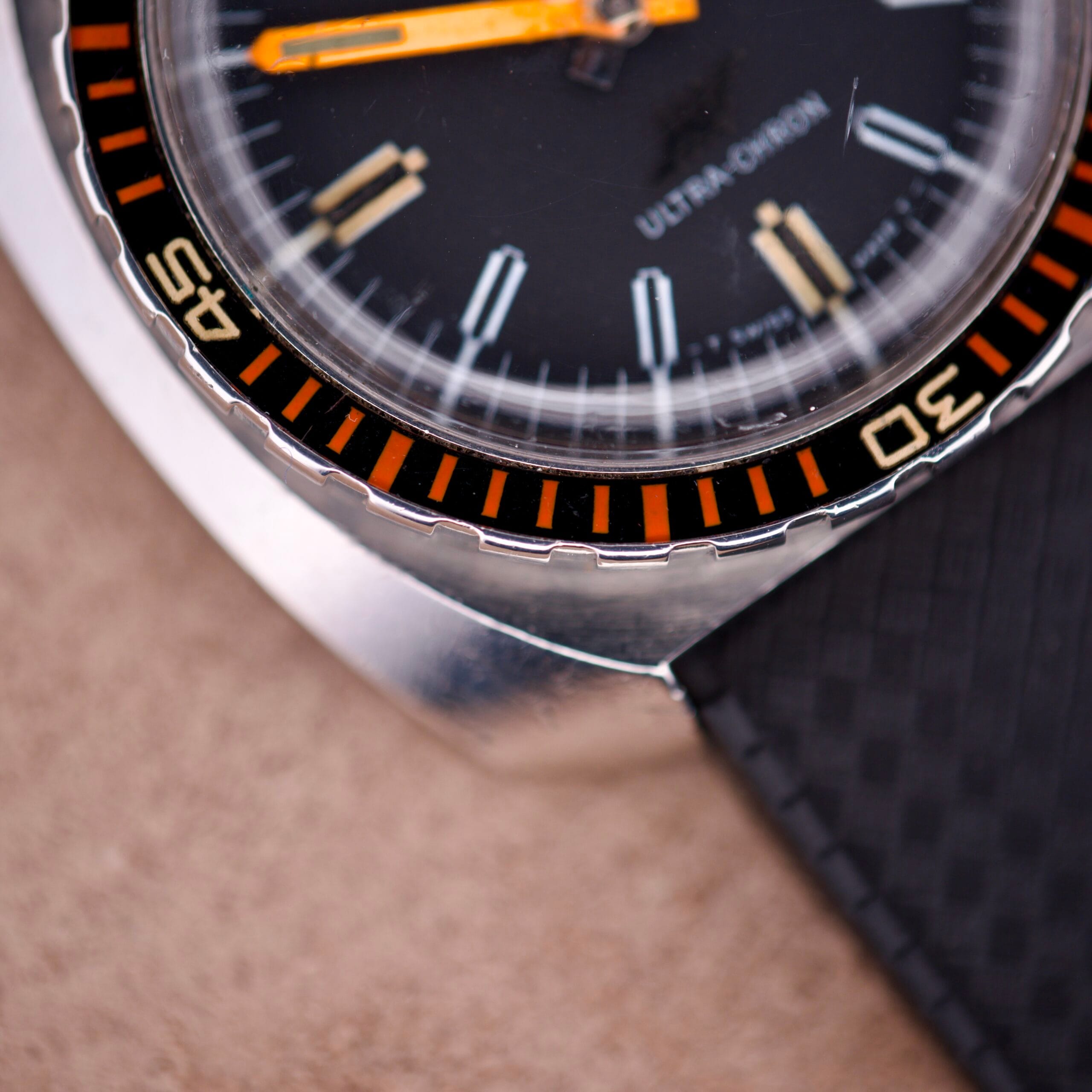 This particular example, the Reference 7970-4, is the definitive execution of the sporty Ultra-Chron. It features a robust cushion case that sits with a commanding presence on the wrist, yet remains surprisingly wearable due to its short lug-to-lug distance. The visual centerpiece is undoubtedly the bezel. While many divers of this era used aluminum inserts, this reference utilizes an acrylic insert, (often referred to by collectors as Bakelite) which provides a depth, warmth, and glossy texture that modern materials simply cannot replicate. The stark contrast between the black dial and the vibrant orange minute hand was a practical choice for legibility underwater, but today, it serves as a fantastic stylistic flourish that screams vintage charm. We also love the applied “Ultra-Chron” logo at 6 o’clock, a stylized spark that hints at the electric performance of the movement inside.