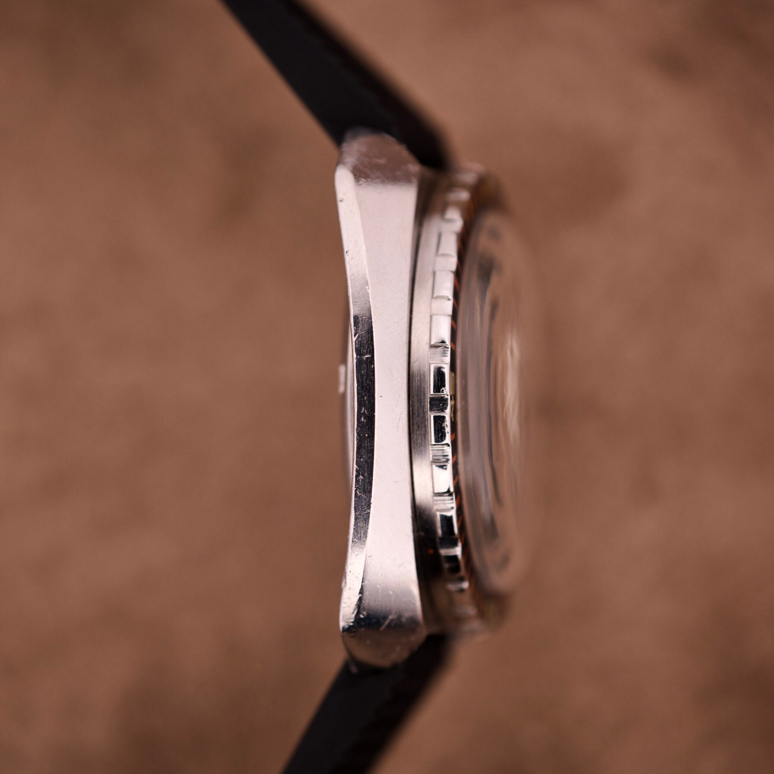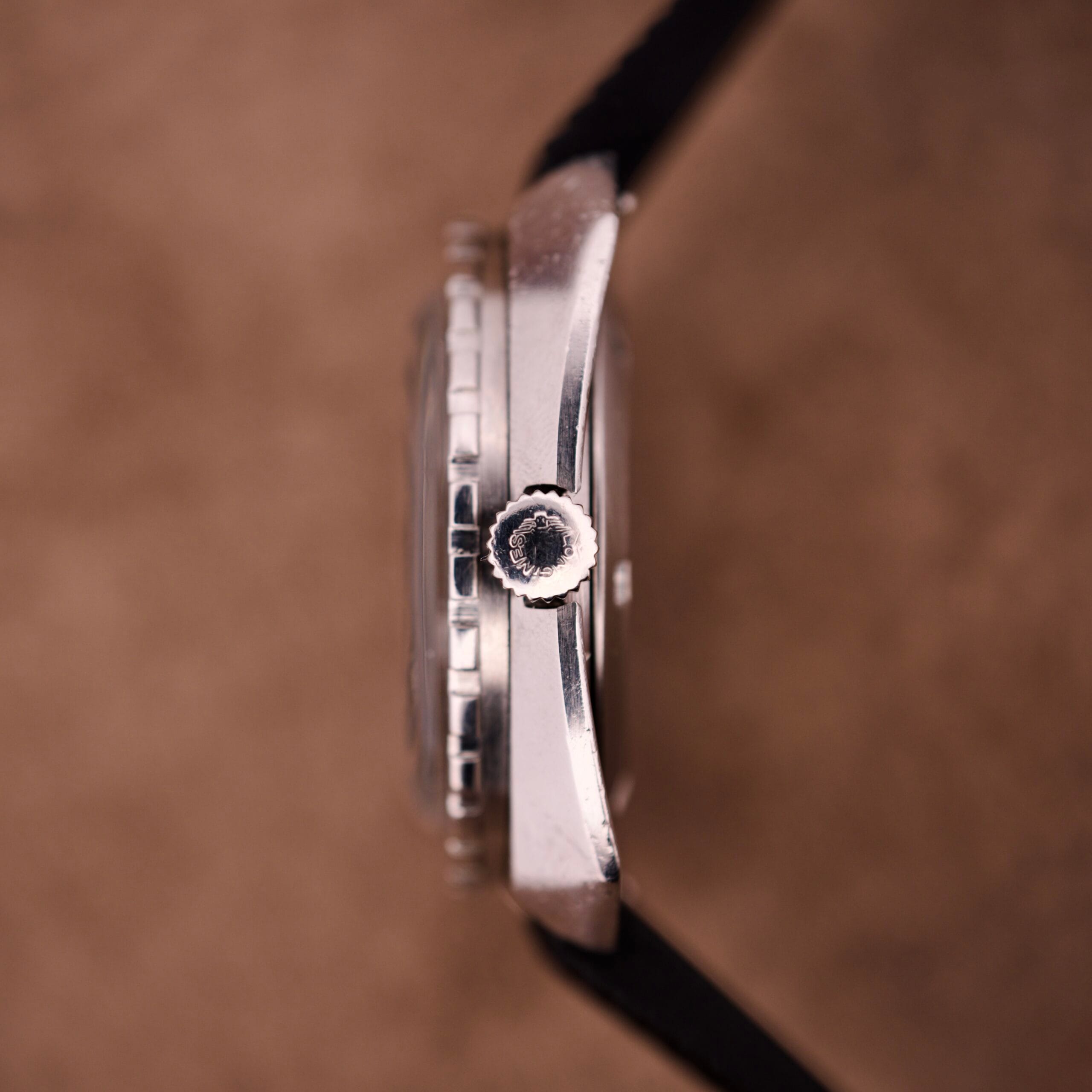 Launched in 1967 to celebrate Longines’ 100th anniversary, the Ultra-Chron line was defined by its movement: the Caliber 431. This was a high-frequency engine running at 36,000 vibrations per hour (5Hz), significantly faster than the standard 18,000 or 21,600 vph of the era. This rapidity allowed for greater stability and accuracy, a feat that only a handful of manufactures—like Zenith and Girard-Perreguez—could achieve reliably. The Reference 7970 took this dressy, high-tech movement and dropped it into a rugged, sporty chassis. The design language is quintessential late-60s transition, moving away from the slender lugs of the past toward the blocky, purposeful cushion cases that would define the 1970s. It was designed for visibility and utility, with the high-beat movement providing a mesmerizingly smooth sweep of the seconds hand that is a joy to watch even today.