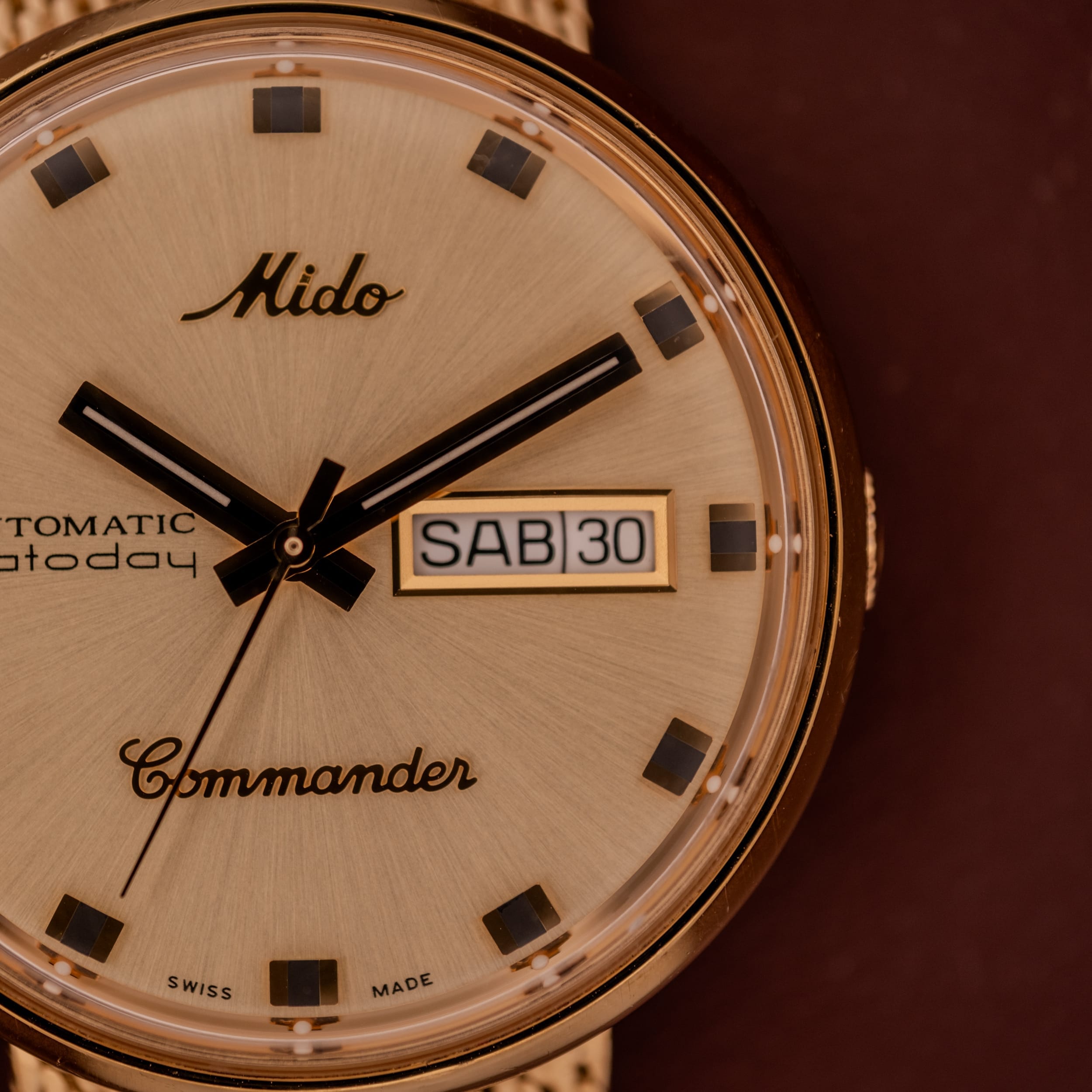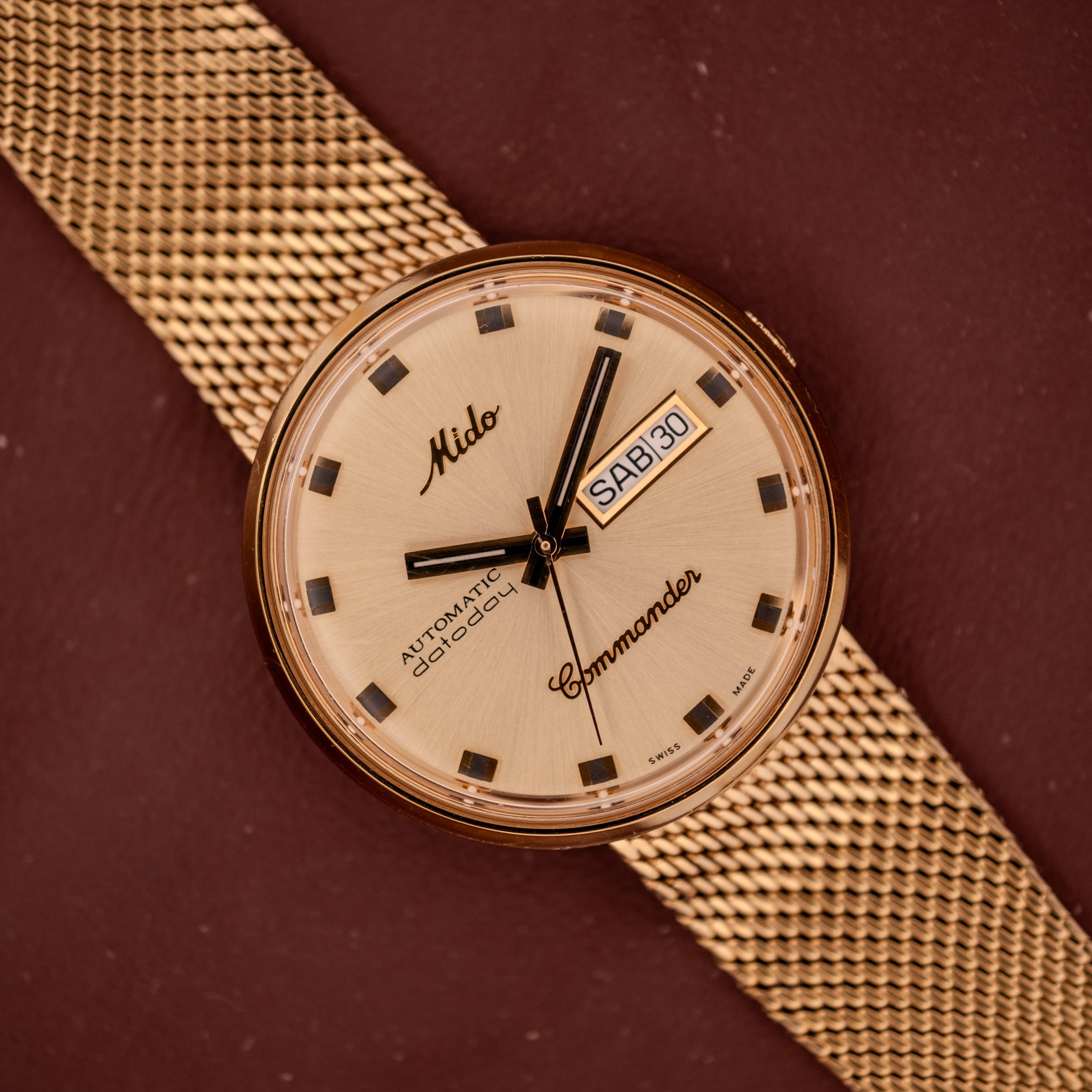 This particular example is, to put it simply, gorgeous. The gold PVD-coated case presents in excellent condition, with the warm, rich tone of the coating remaining consistent and lustrous across all surfaces. The integrated lugless case design gives the watch a sleek, unbroken silhouette that flows seamlessly into the matching Milanese mesh bracelet, creating a unified look that feels distinctly modern and luxurious. The dial is the real star here: a radial sunburst finish that catches and scatters light beautifully, creating a warm champagne glow that shifts between golden and cream depending on the angle. The applied square hour markers in black provide sharp contrast against this luminous backdrop, and the fine white luminous plots at each marker add just enough nighttime legibility. The day-date window at three o’clock is framed in gold, integrating elegantly into the dial’s composition, and the “Mido” and “Commander” scripts in their respective positions at twelve and six give the dial a classical balance that is immediately pleasing.