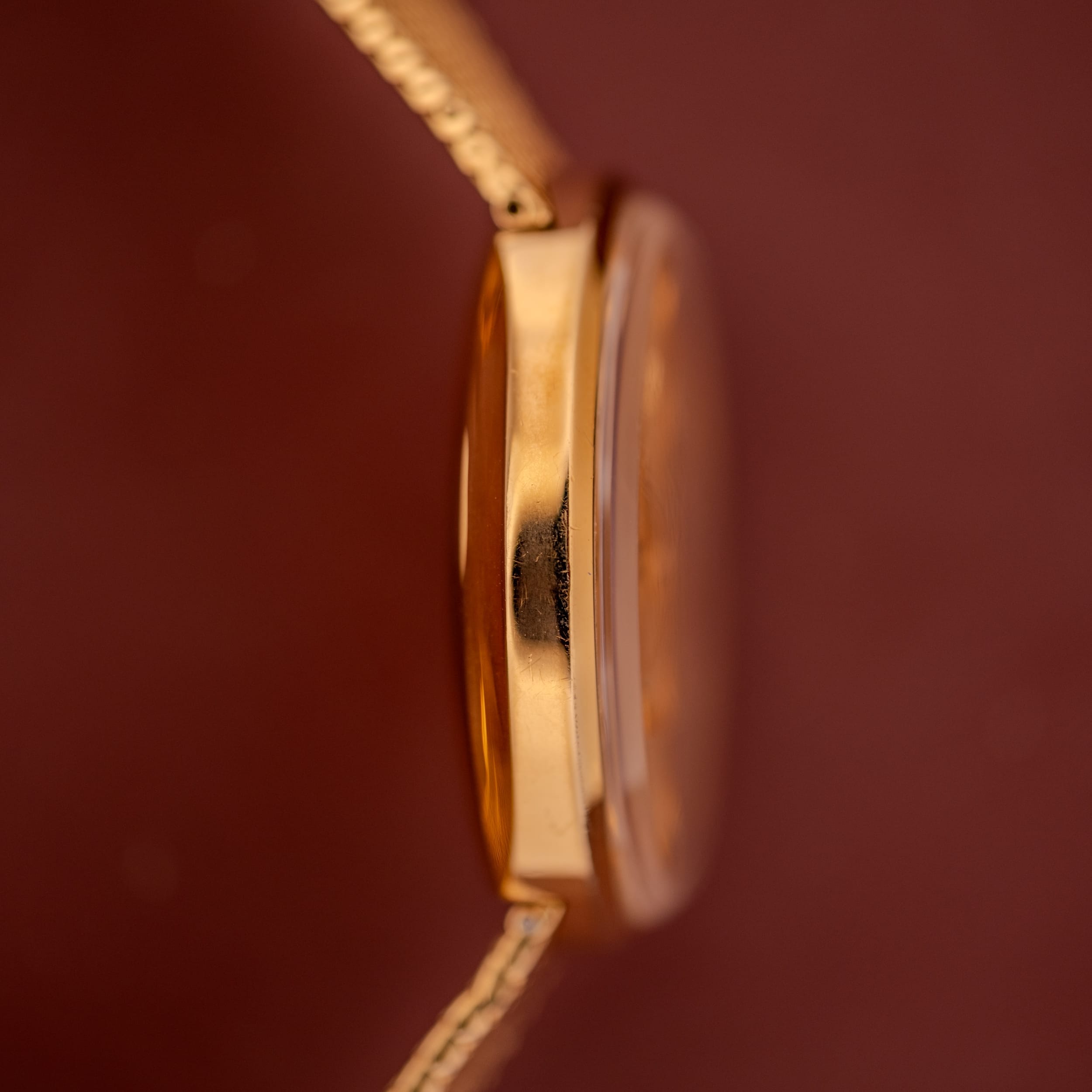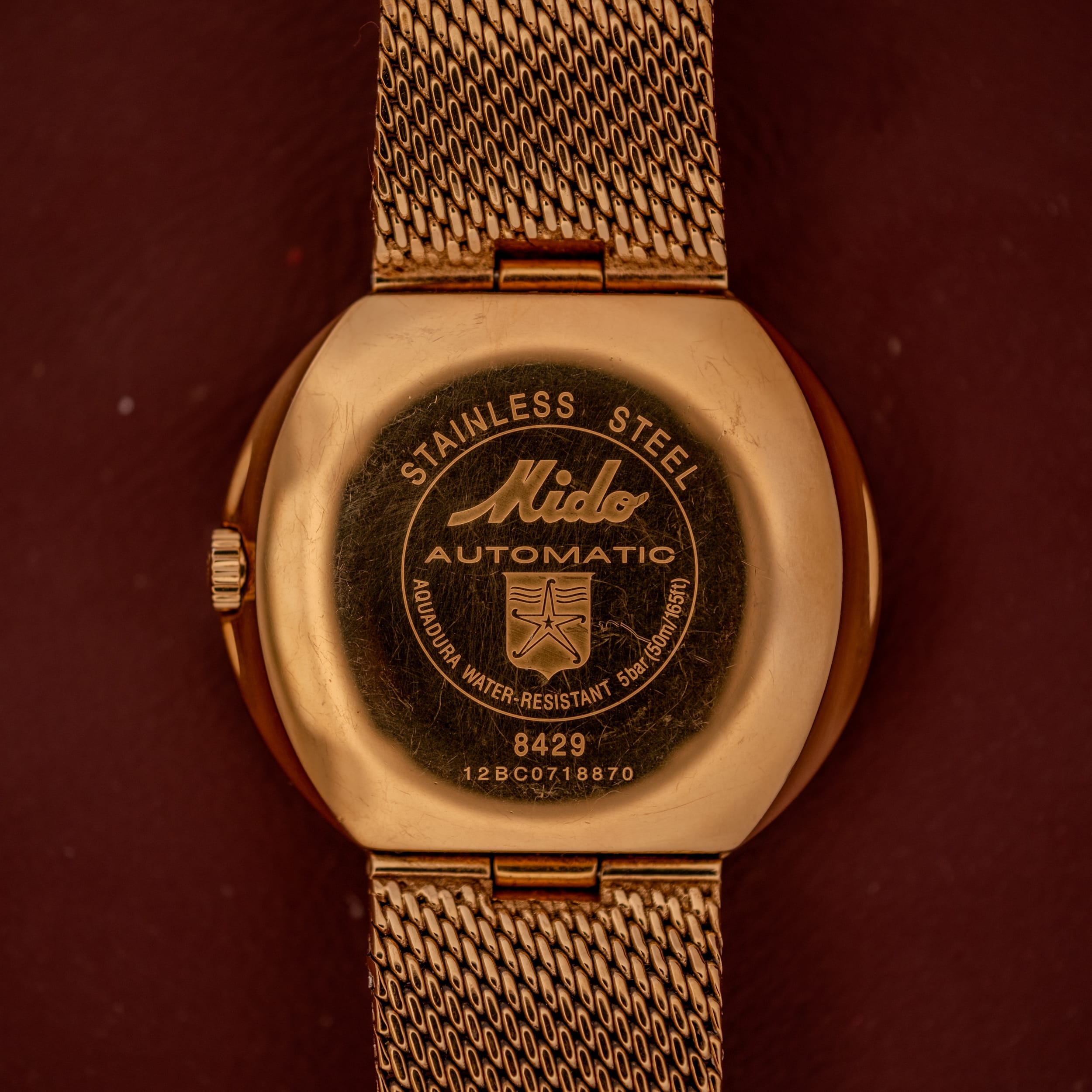 The condition across the board is fantastic. The case sides show only the lightest surface wear, the signed Mido crown is crisp, and the profile reveals the svelte proportions that make this watch so comfortable under a shirt cuff. The caseback confirms the Ref. 8429 designation along with the Aquadura water resistance rating of 5 bar. The Milanese mesh bracelet, with its signed Mido clasp, drapes on the wrist with a fluid, almost liquid quality that is one of the great pleasures of this bracelet style, and the gold PVD coating remains in excellent shape throughout.