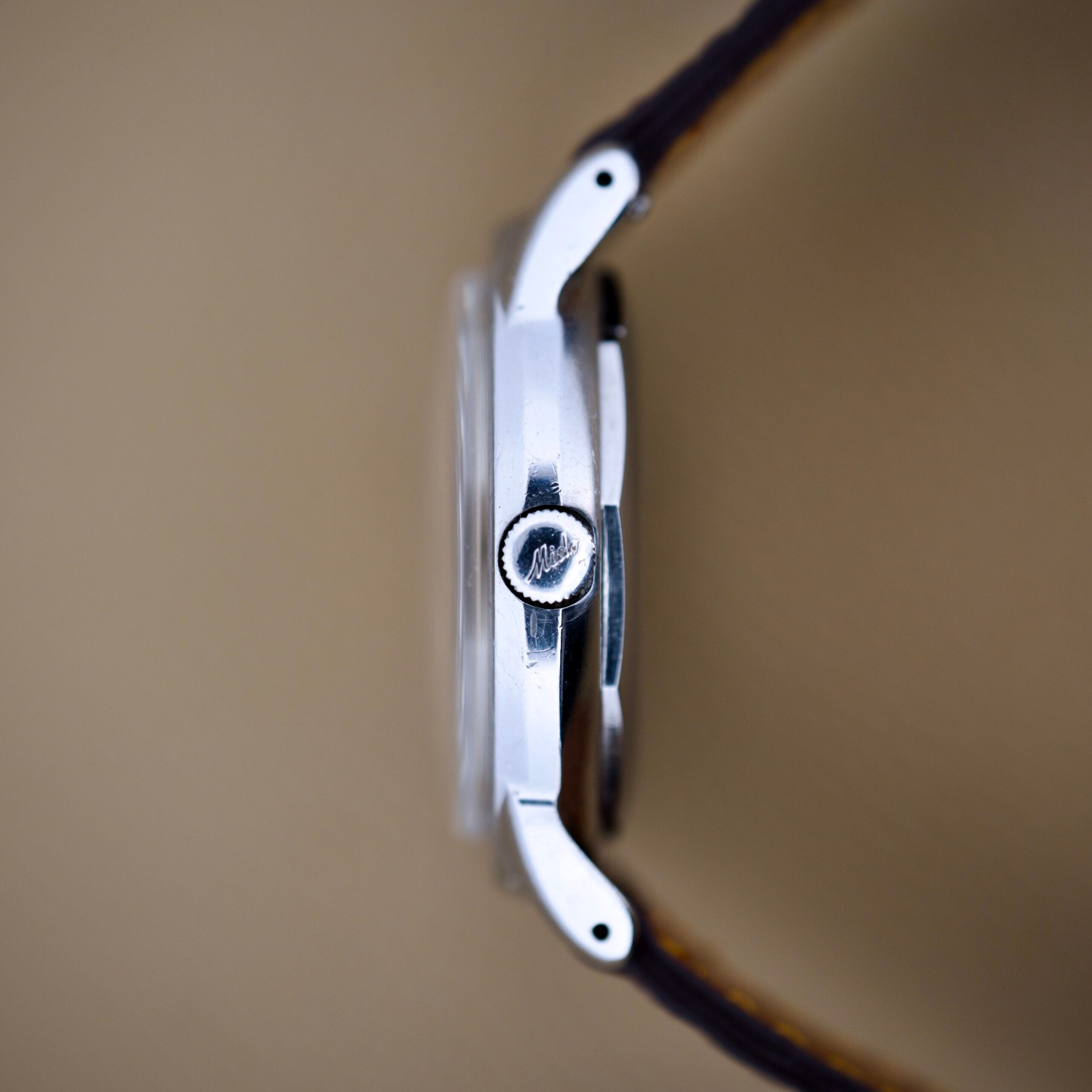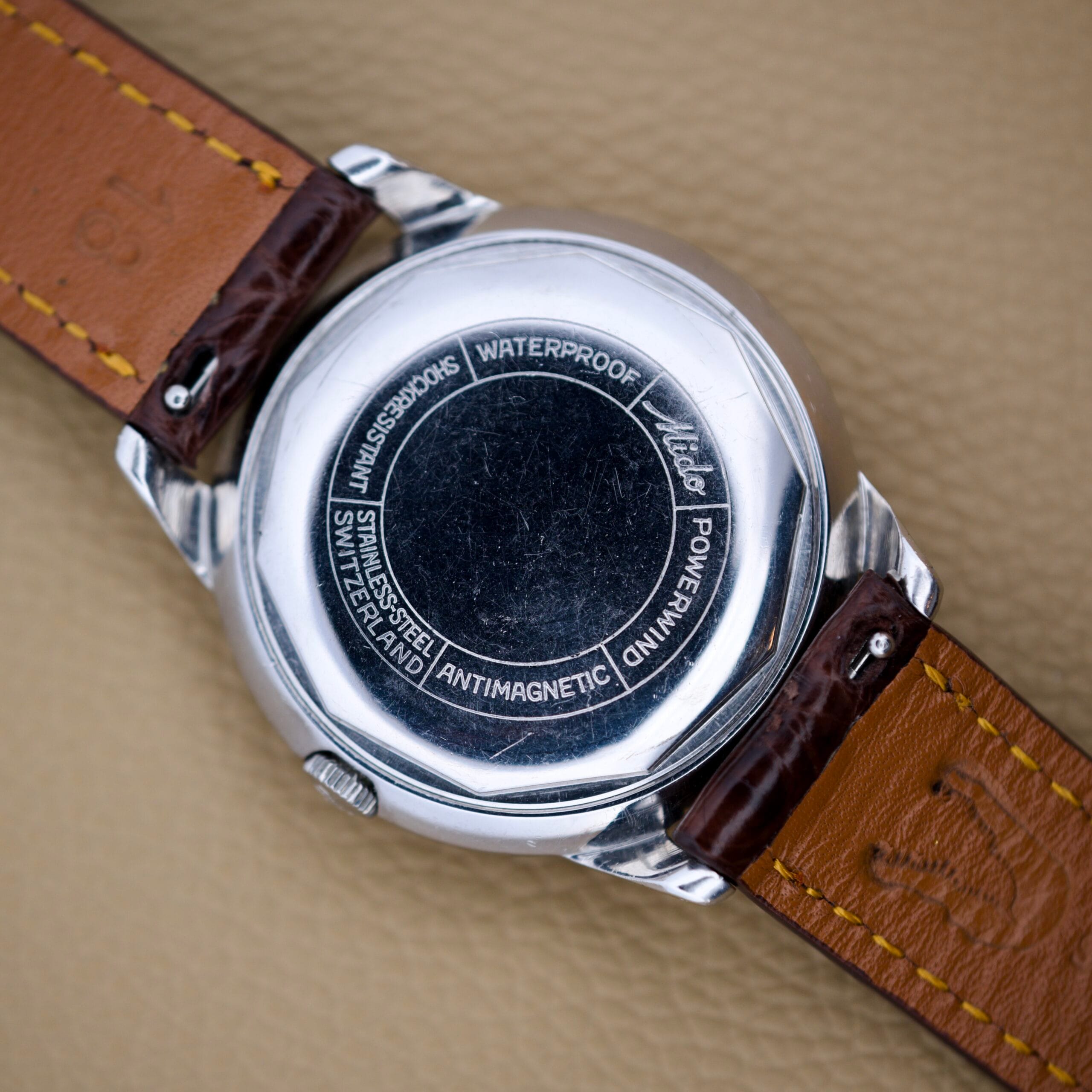 The condition of this watch is, in a word, exceptional. It’s a true “time capsule” piece that has been remarkably preserved. The dial is incredibly clean, with its intricate markers and crisp printing fully intact. The stainless steel case is sharp and appears unpolished, retaining its original factory lines and showing only the most minimal signs of its age. Critically, it retains its original and correct signed Mido crown, a detail so often lost to time.