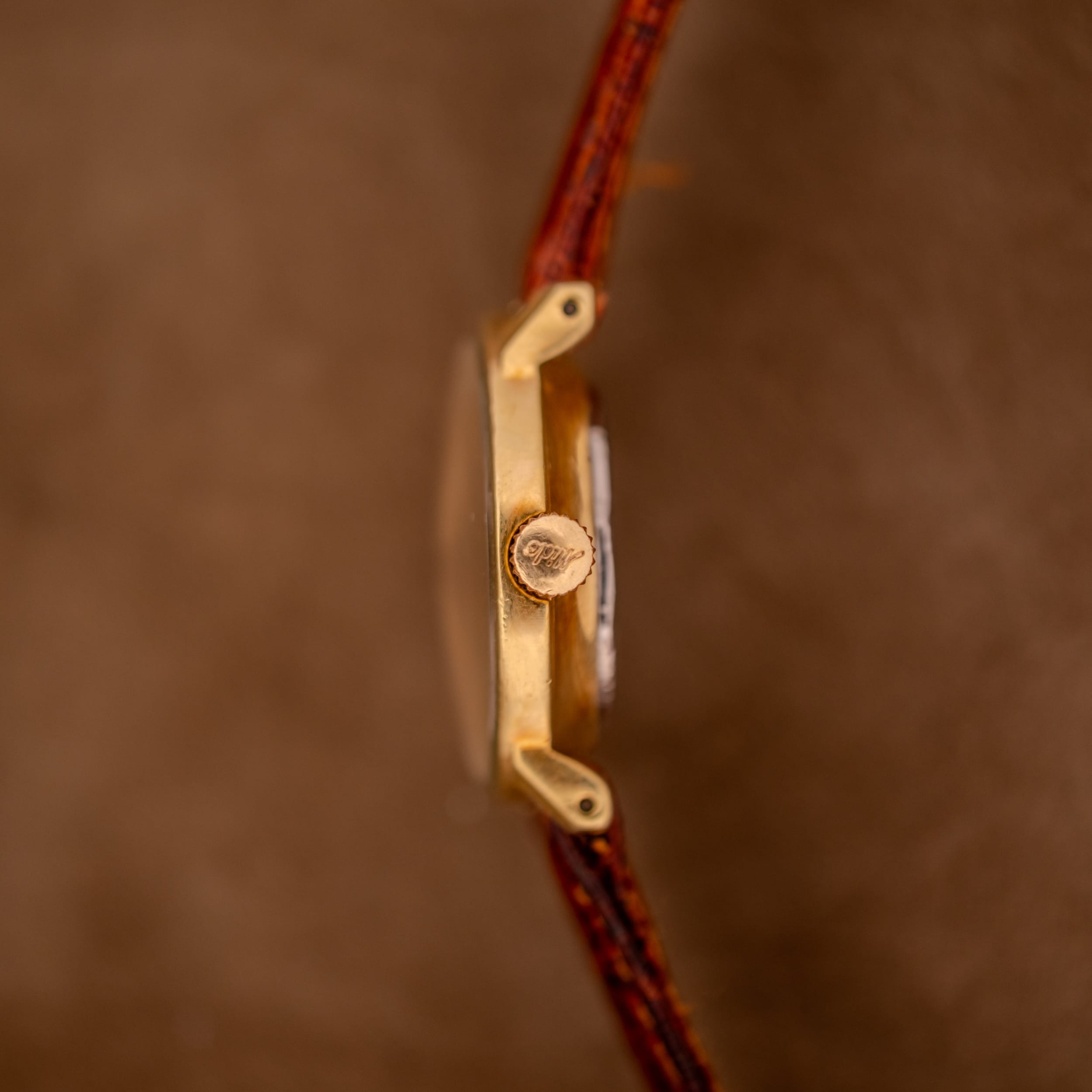 The gold-tone case is slim and wears beautifully, with angular lugs that give it a more structured, architectural feel than a typical ladies’ round case. The Mido-signed crown is a nice detail confirming originality. There is some honest wear to the gold plating along the bezel edges and lug tips, exactly the kind of gentle aging you’d expect from a watch that was clearly a treasured daily companion. The stainless steel caseback remains crisp, with the engraved specifications still fully legible.