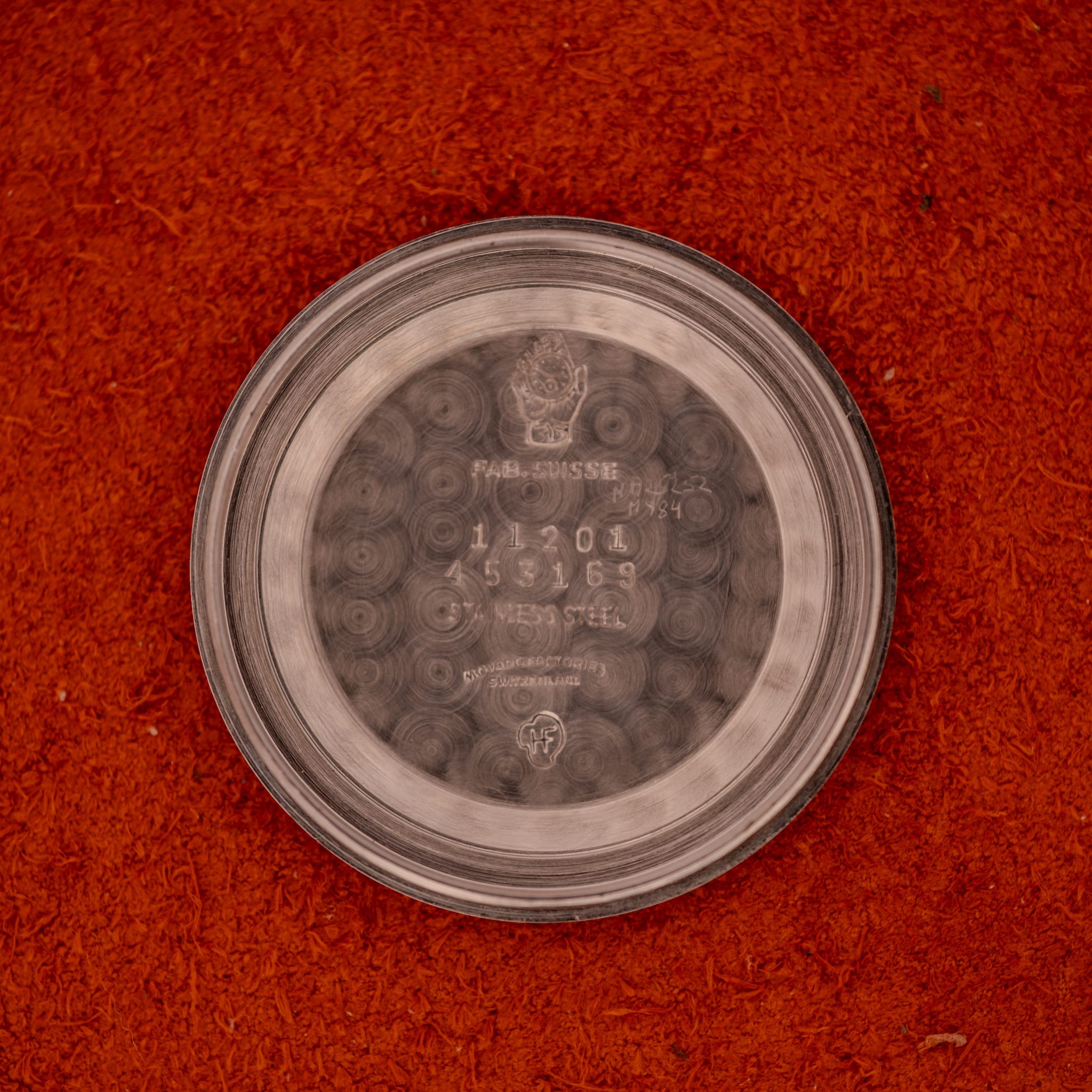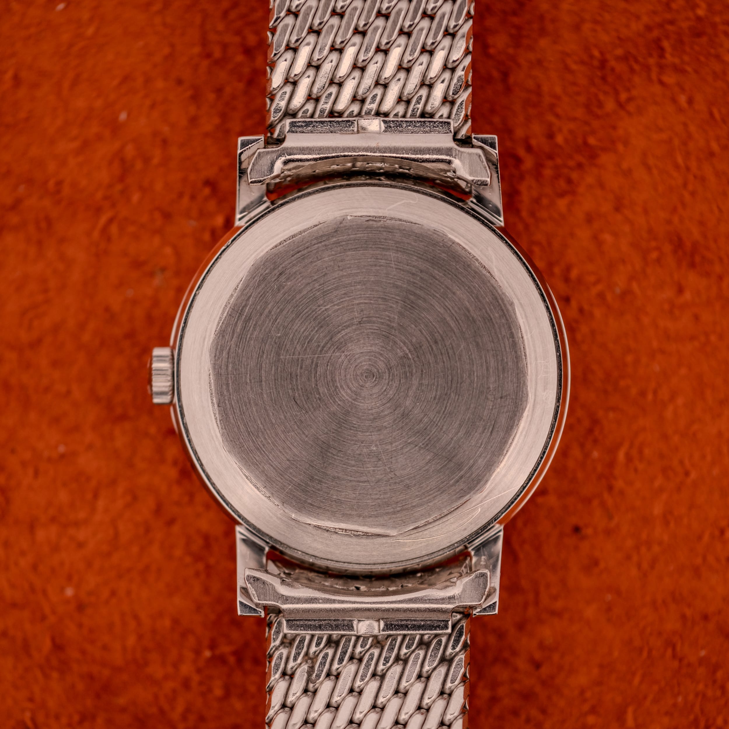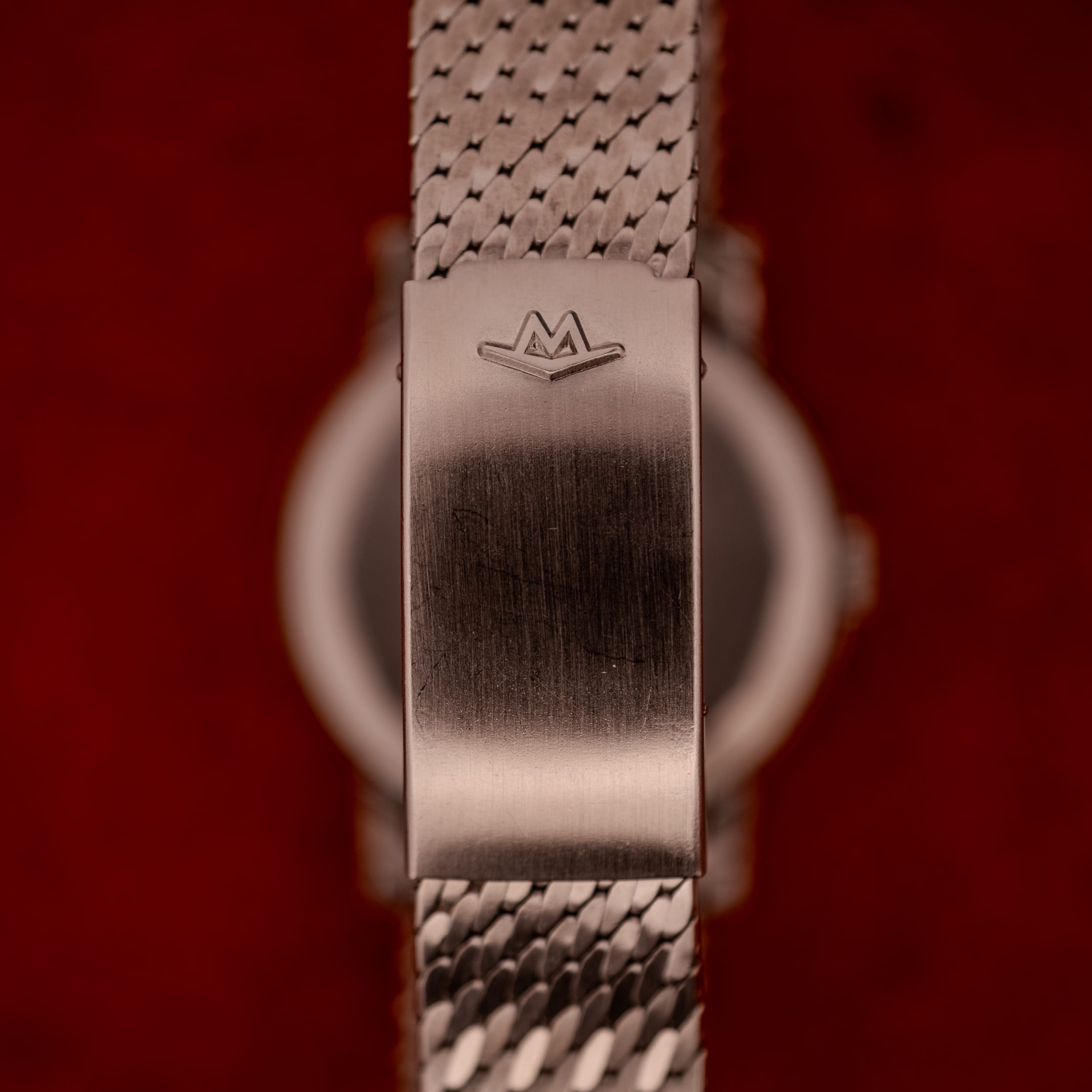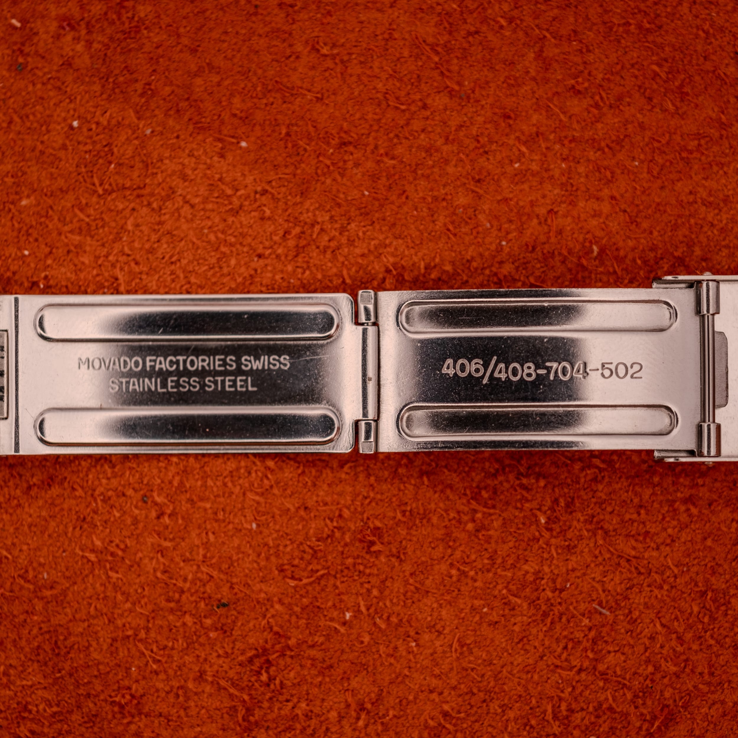 The stainless steel case is in very good condition, with sharp lugs and a clean bezel that frames the dial beautifully. The side profile reveals a slim, well-proportioned case that sits comfortably on the wrist. The Movado-signed crown, featuring the brand’s distinctive “M” logo, appears to be original and properly seated. What truly elevates this piece, however, is the original Movado Factories stainless steel beads-of-rice bracelet. Finding a vintage watch on its original signed bracelet is increasingly rare and always desirable, and this one is a beauty. The clasp is stamped “Movado Factories Swiss Stainless Steel” with the reference number 406/408-704-502, and features the raised Movado “M” emblem on the outside. The bracelet itself has a wonderfully tactile, flowing quality that complements the case perfectly and gives the watch a complete, cohesive presence that a leather strap simply cannot replicate. The inner caseback is stamped with the Fab. Suisse hallmark, reference 11201, serial number 453169, and the Movado Factories Switzerland designation.