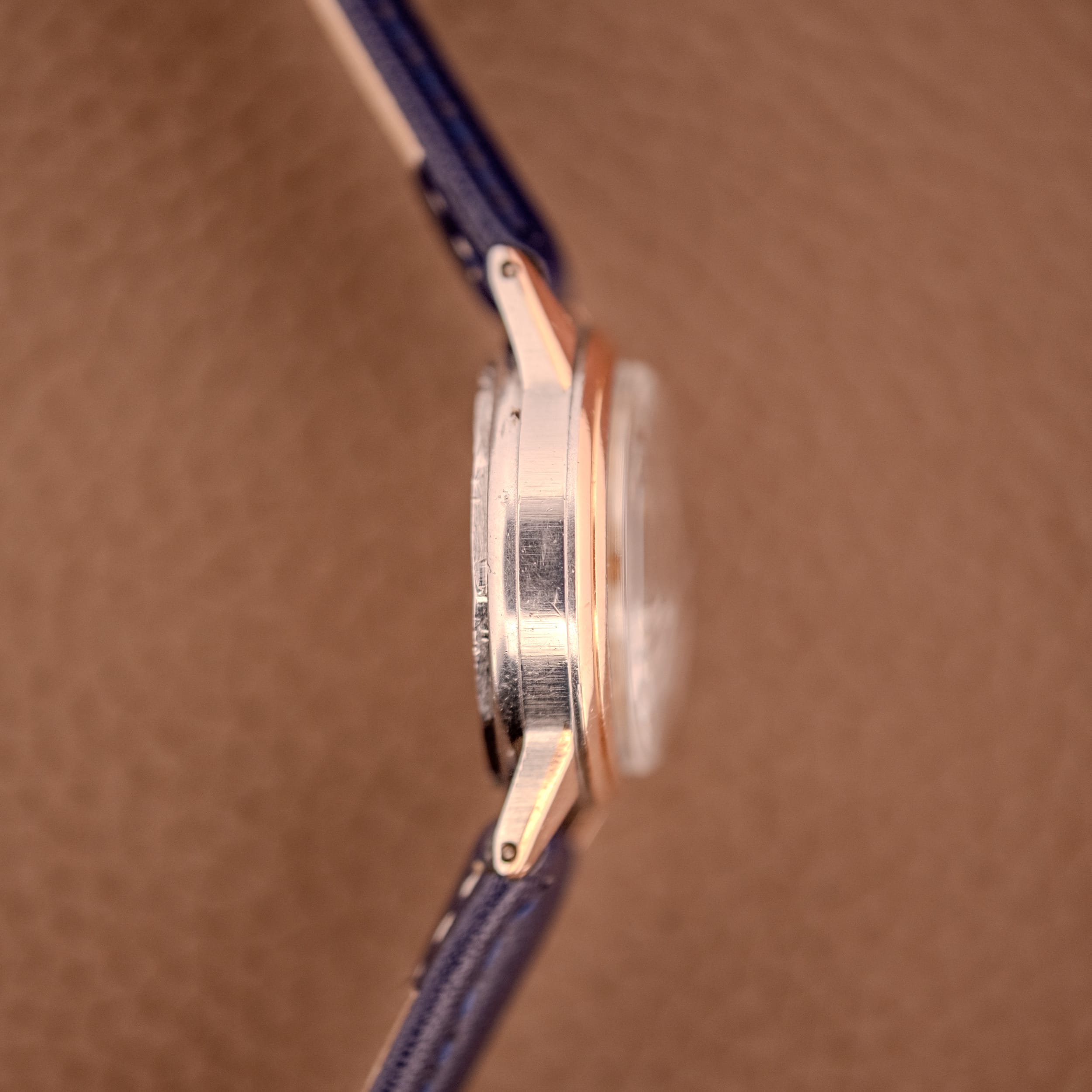 The rose gold case shows honest wear at the lug edges and bezel corners, consistent with a watch that was worn and enjoyed. The outer caseback is a clean screw-down steel construction marked “Acier Staybrite.” The gold crown appears original and correct for the period.