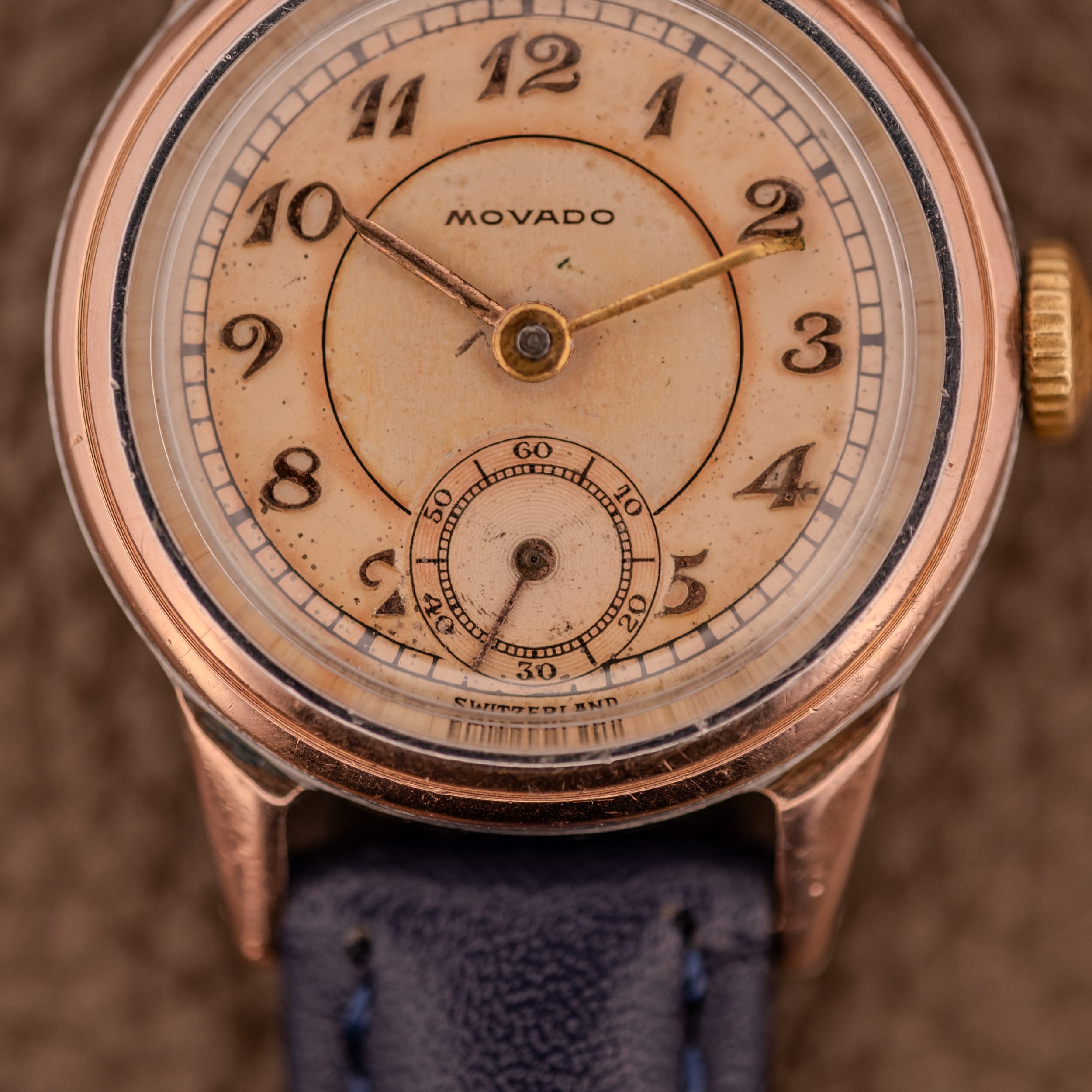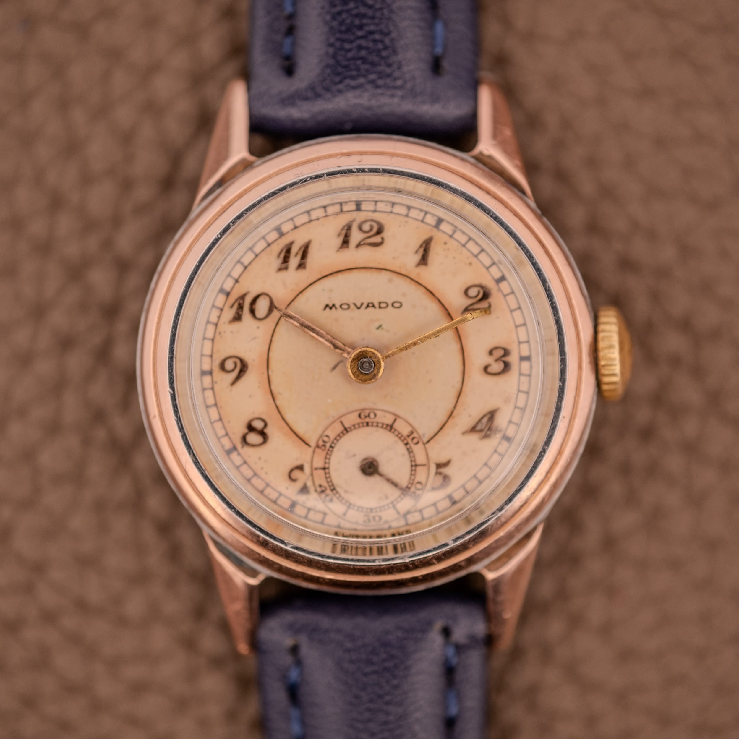 This particular example is, to us, a quintessential 1940s dress watch. The dial is where everything comes together. The sector layout divides the surface into distinct zones, with the Breguet Arabic numerals wrapping around the outer ring in that unmistakable Art Deco typography that defined the era. The railroad minute track on the outermost chapter ring provides precision, while the inner circular band separates the numeral ring from the central field. The subsidiary seconds register at 6 o’clock features its own finely printed scale. The “Movado” name sits just below 12, and “Switzerland” is printed at 6. What makes this dial truly special is the patina. The original surface has aged to a warm cream with salmon undertones that harmonizes perfectly with the rose gold case, developing the kind of organic character that cannot be replicated. There is some light spotting and surface variation that speaks to eight decades of life, and the overall effect is of a dial that has genuinely improved with age.