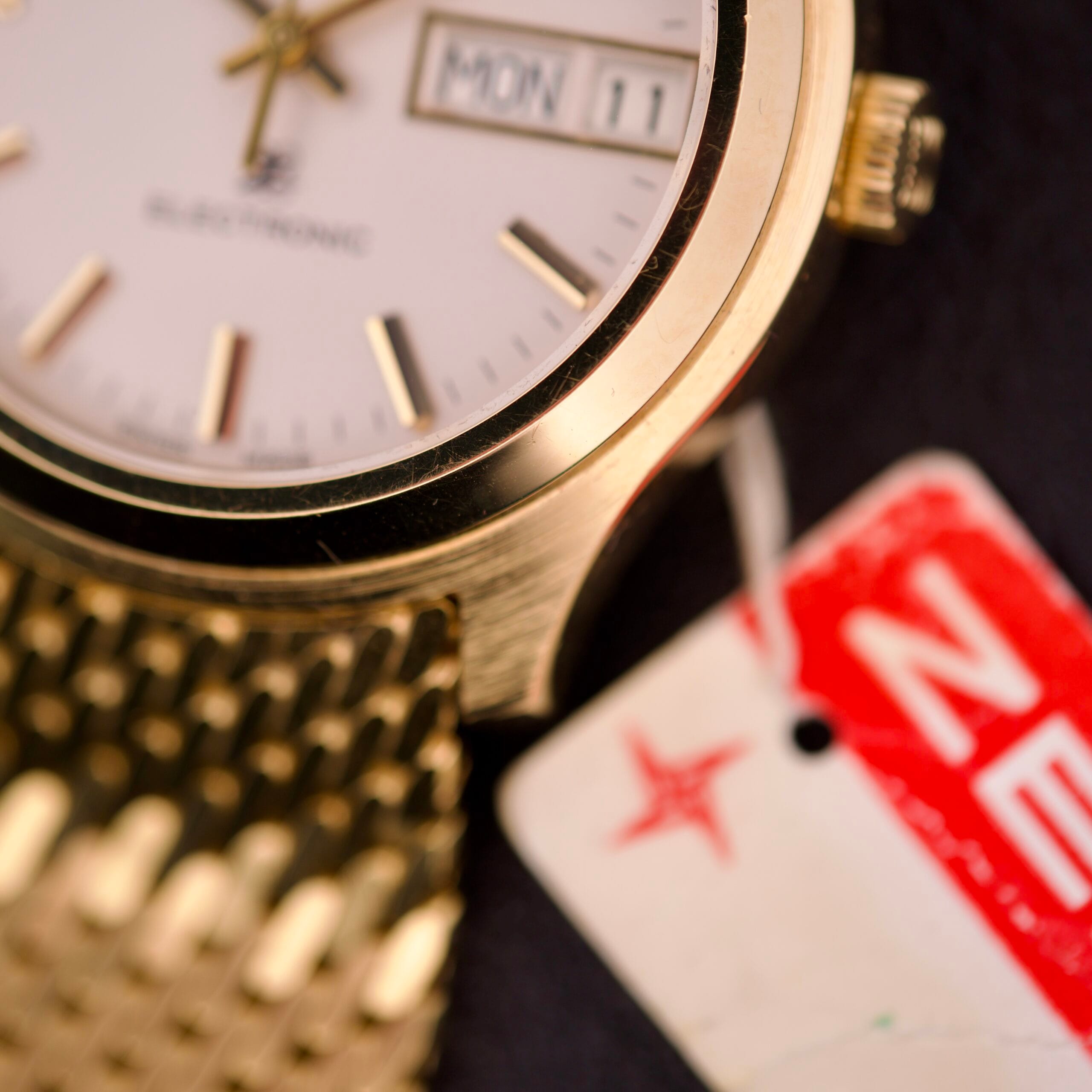 This specific example is a stunning physical artifact of that MZH partnership. The pristine white dial is signed Movado at the top, but features the Zenith “Electronic” logo at the bottom. The crown is signed with the Zenith star, as is the clasp on the integrated gold-plated mesh bracelet. It’s a true co-branded collaboration.