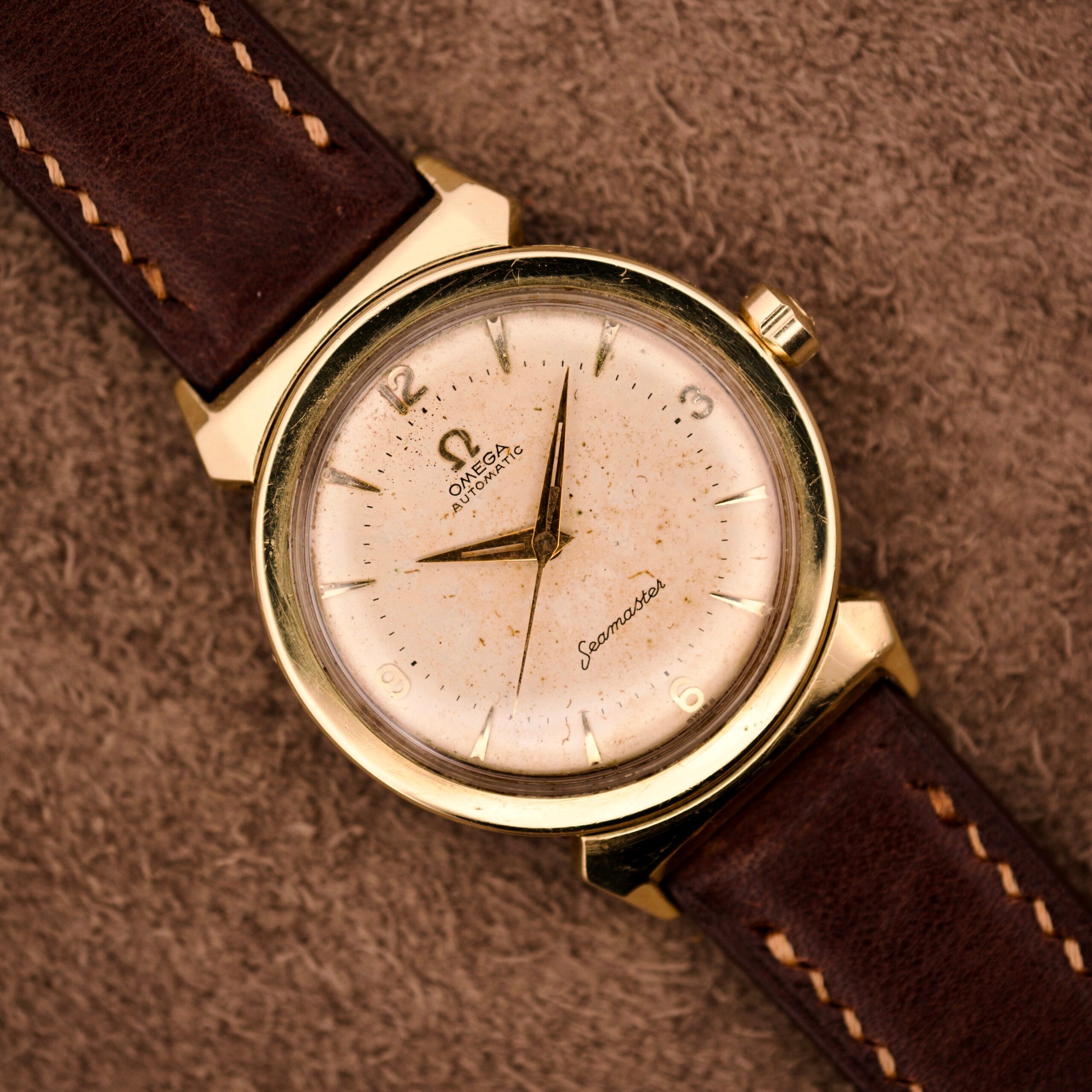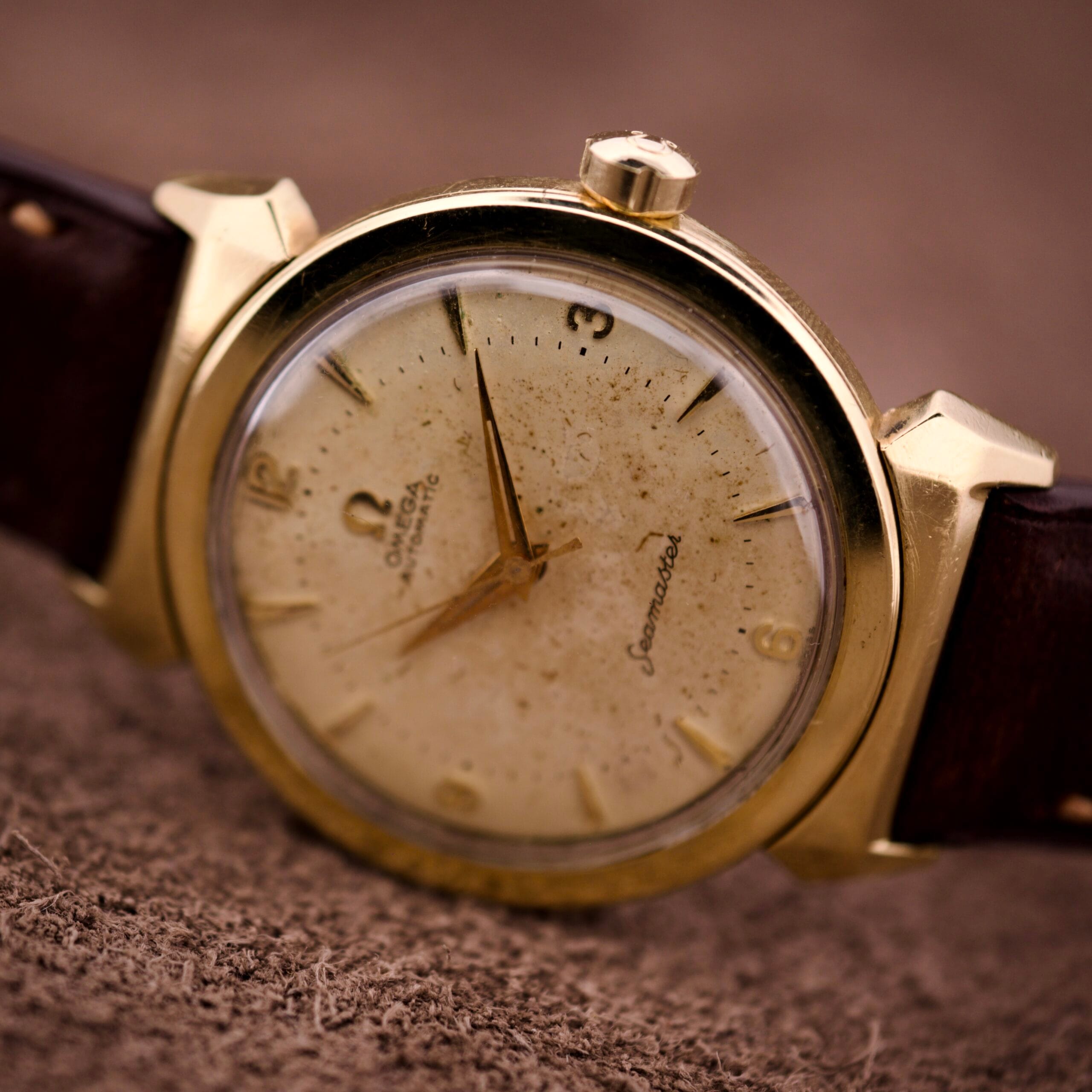 Condition is critical with gold-capped watches, and finding one where the gold shell remains intact on the high points of the lugs is becoming increasingly difficult. This example preserves that distinct case geometry, showcasing the sharp chamfers that define the “Bull Horn” shape. The dial retains the classic vintage charm, and the movement inside represents the peak of Omega’s pink-gold plated era, a workhorse designed to run forever with proper care.