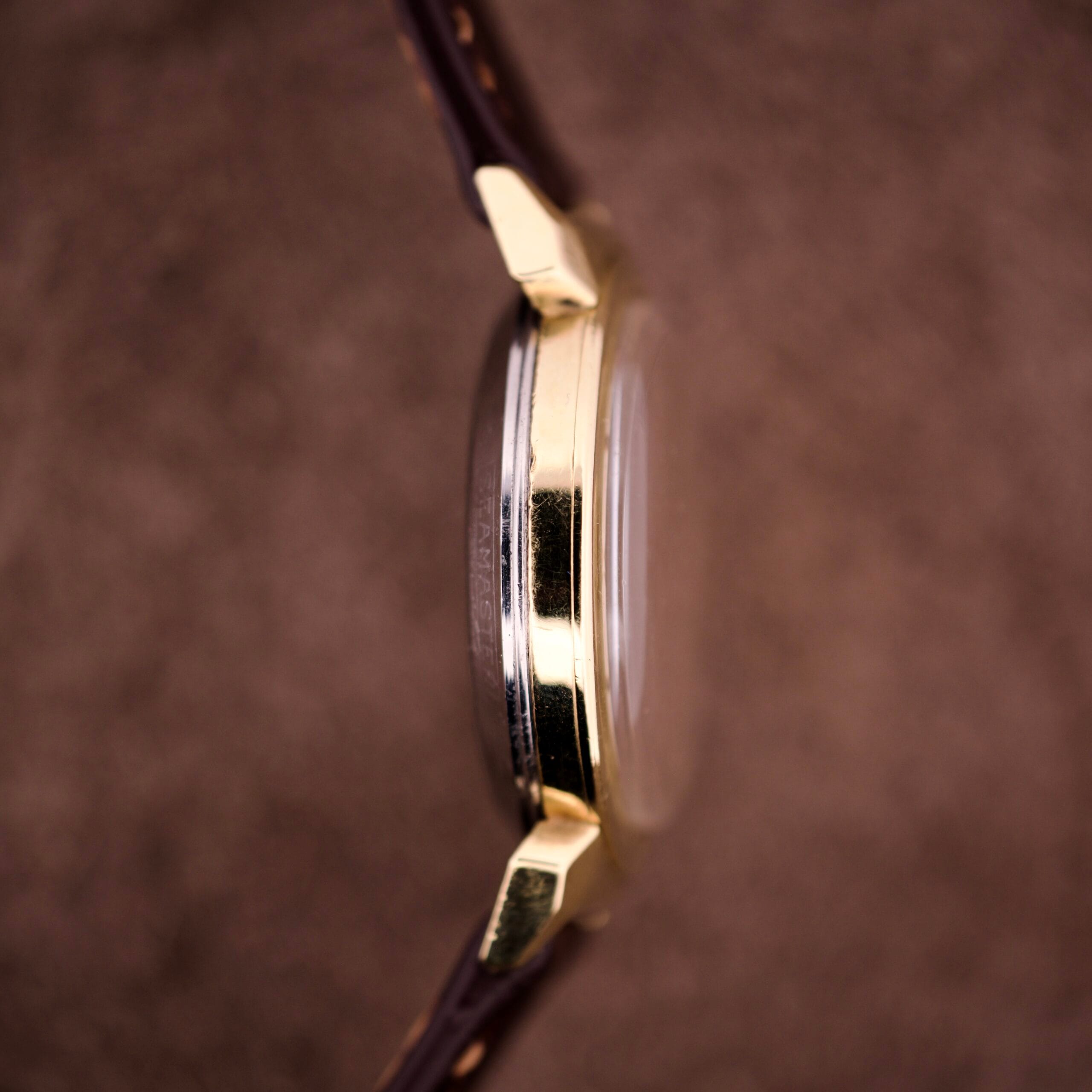 This particular example is defined by those spectacular lugs. Thick, faceted, and curving sharply inward, they resemble the horns of a bull, giving the 34mm case a visual footprint that feels significantly larger and more substantial on the wrist. It creates a silhouette that is distinct from the slender, straight lugs of standard dress watches of the period. The dial is a study in mid-century restraint, likely featuring applied faceted markers and dauphine hands that play with the light, offering excellent legibility against the warm gold tones of the case.