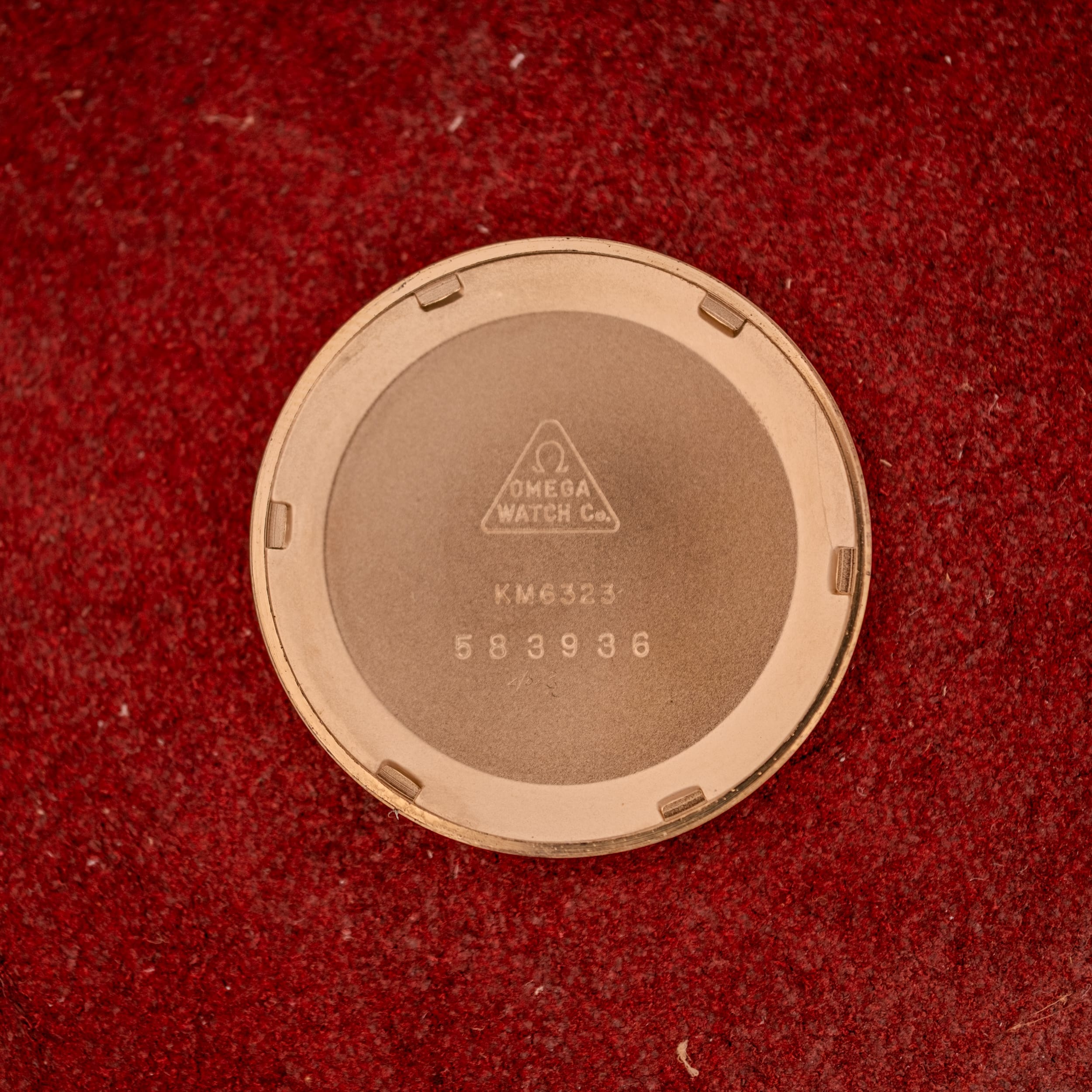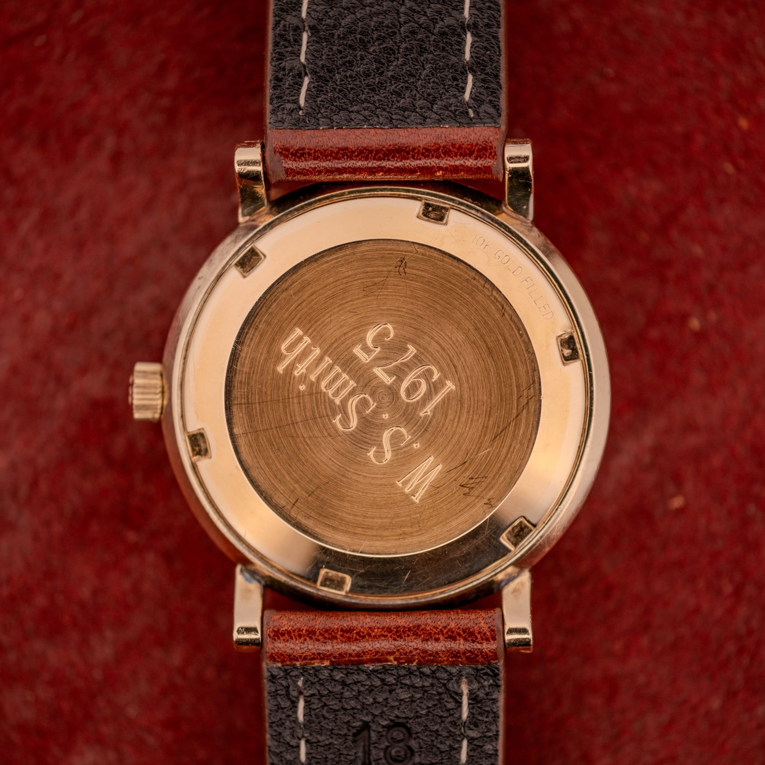 The 10k gold-filled case is in wonderful condition, retaining sharp, well-defined lugs and a clean bezel. The side profile reveals just how thoughtfully proportioned this case is, with a slim, comfortable profile that belies the robust automatic movement within. The Omega-signed crown is original and properly seated. The caseback carries a personal engraving, “W.S. Smith 1973,” dating this piece and confirming it was almost certainly a gift, a milestone marker for someone who clearly had good taste. Some light surface scratches on the caseback are consistent with a half-century of honest wear, but the overall presentation remains strong. The case serial 583936 is clearly stamped on the inner caseback beneath the Omega triangle logo.
